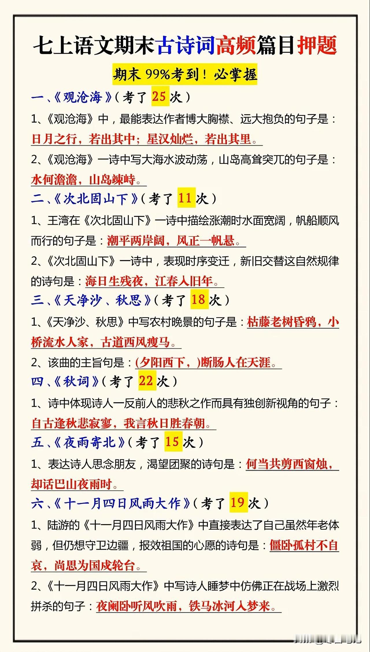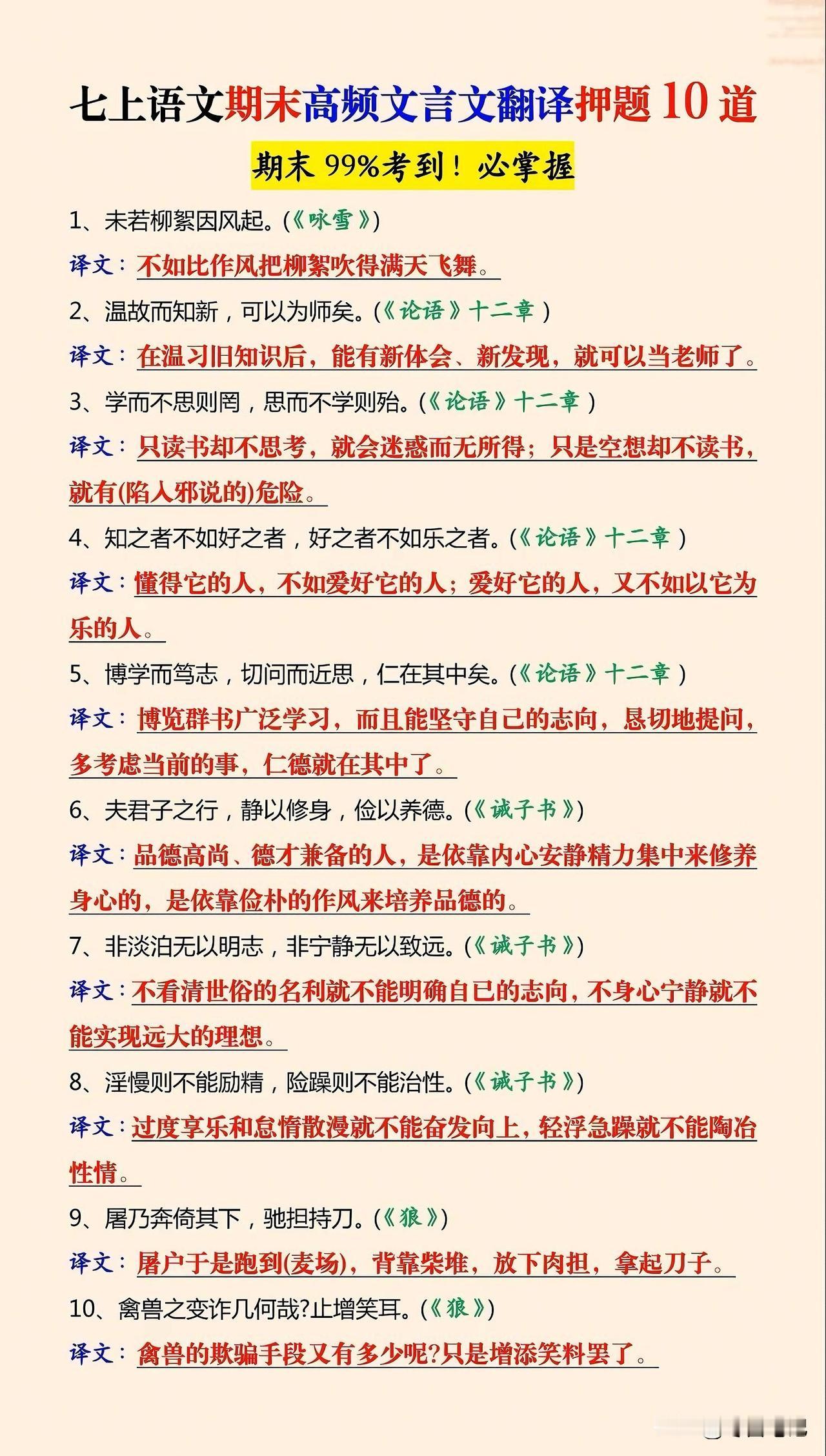 七年级上册语文:文言文期末押题考点清单,尖子生早就滚瓜烂熟了,抓紧时间收藏给孩子