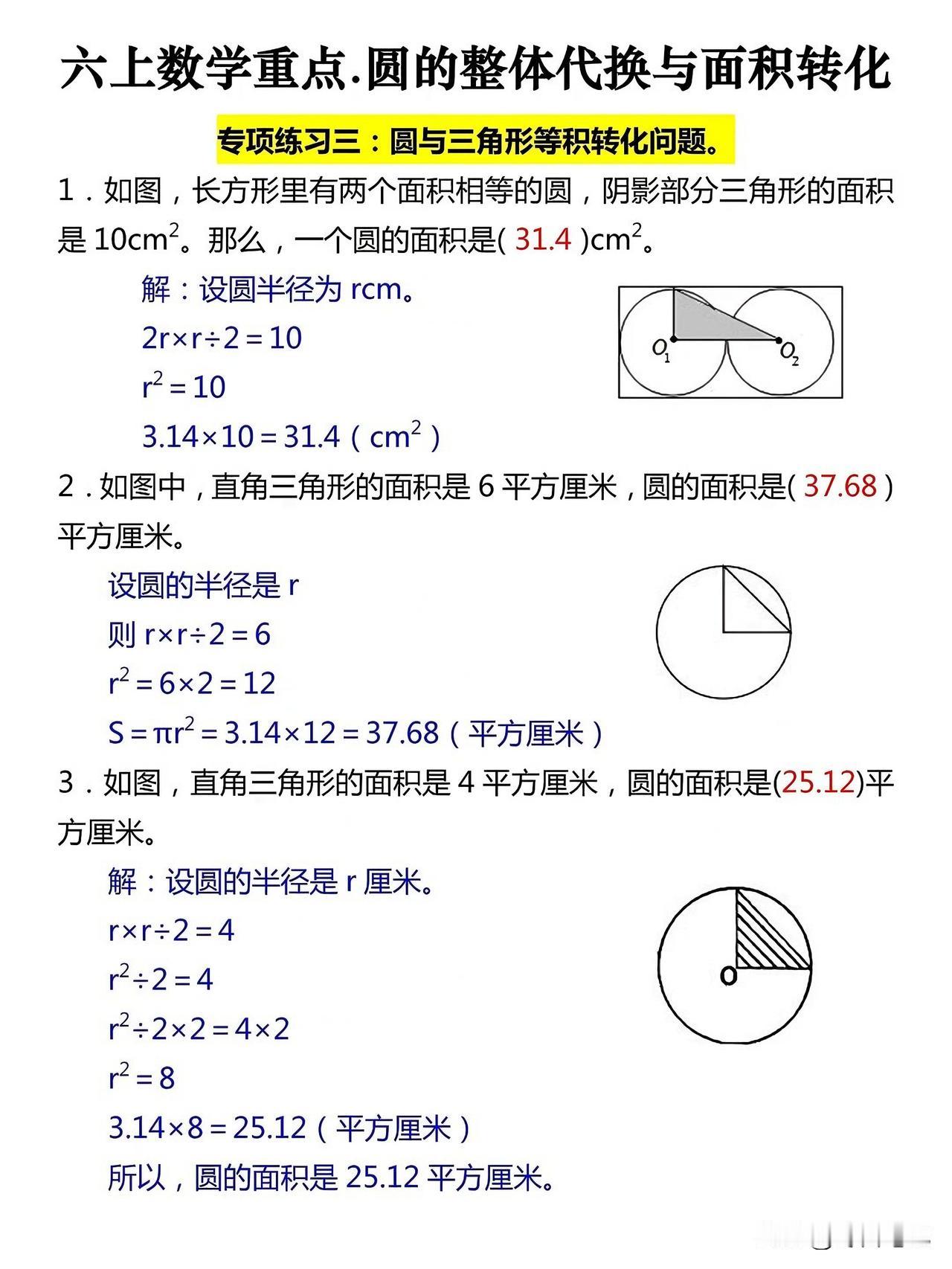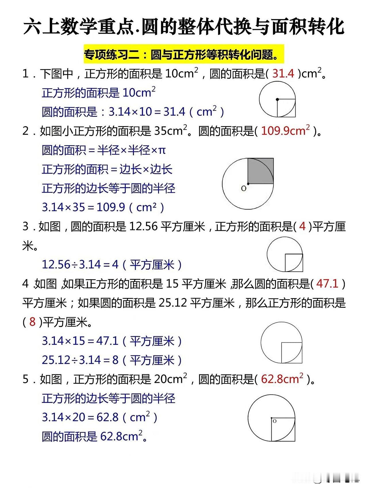 六年级上册数学:圆的整体代换与面积转化专题练习,是孩子查漏补缺的好帮手,抓紧时间