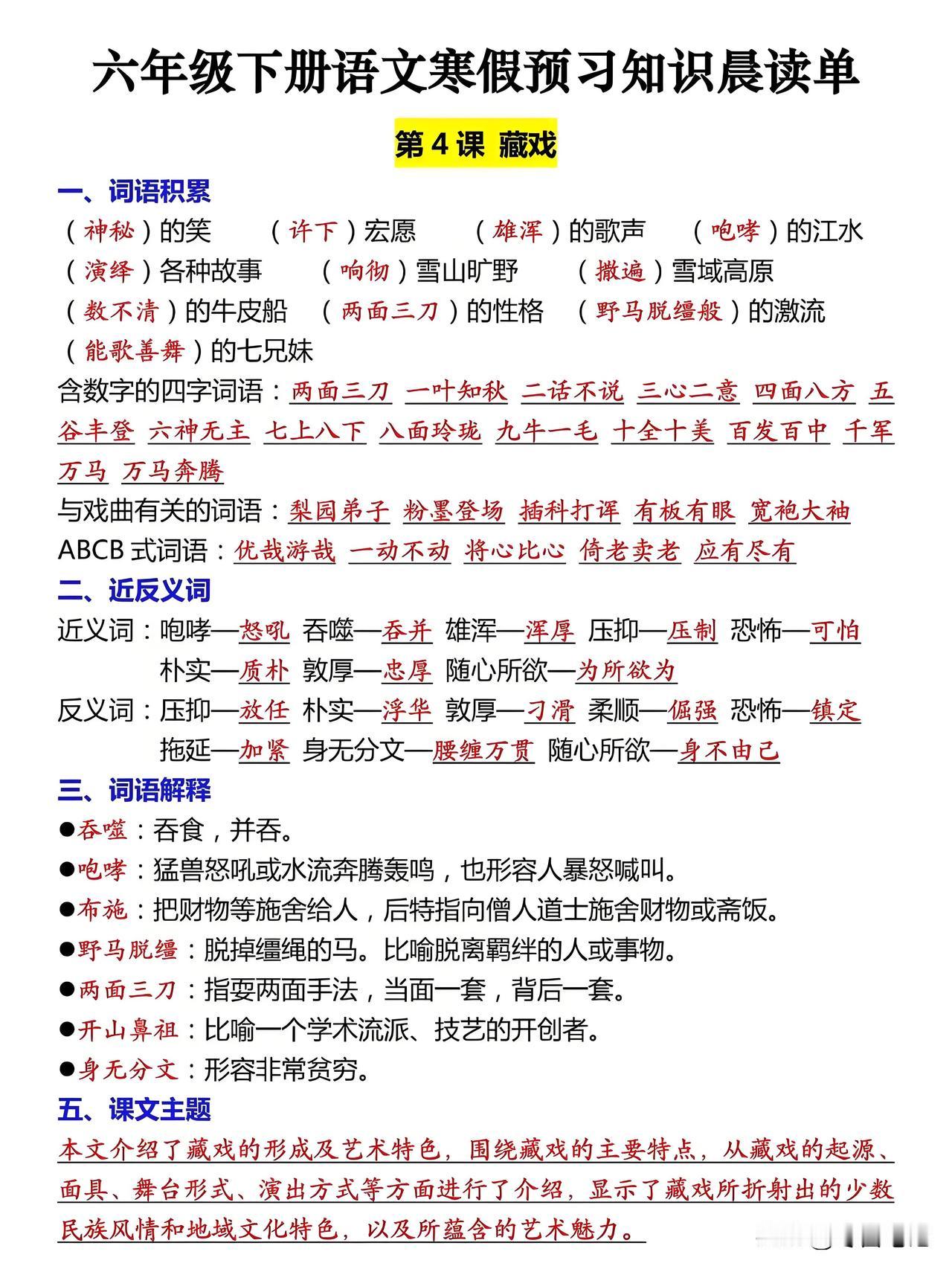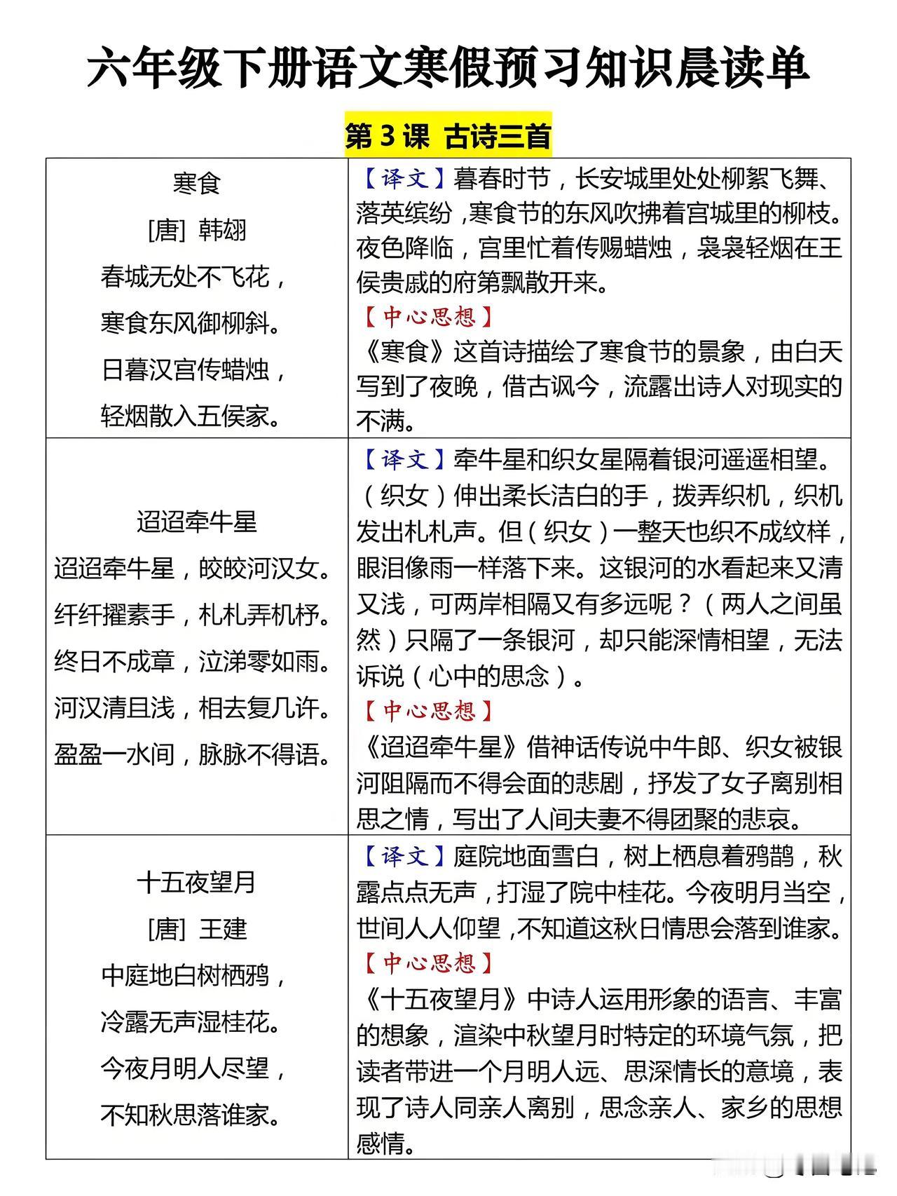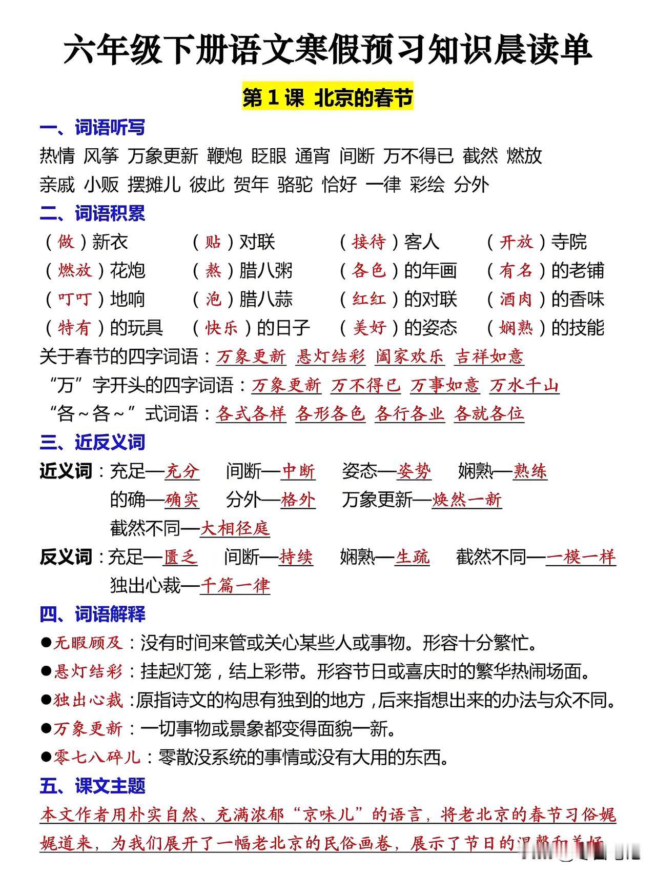 语文第一单元晨读板块,民俗主题的积累与默写是基础拿分核心。必背古诗词要重点攻克《寒食》《迢迢牵牛星》《十五夜望月》,不仅要一字不差熟练默写,还要理清诗句大意、作者情感与重点字词释义,比如“迢迢”“脉脉”的含义,“春城无处不飞花”的场景描写,避免默写错别字、理解题答偏。同时,要熟读《北京的春节》中描写除夕、元宵习俗的重点段落,积累“万象更新”“张灯结彩”等民俗四字词,掌握文章时间顺序的写作手法。晨读时还要反复诵读易读错字词,如“蜜饯(jiàn)”“掺和(huo)”,牢记“腻”“宵”等易错字的书写,做到读准、写对、用熟。