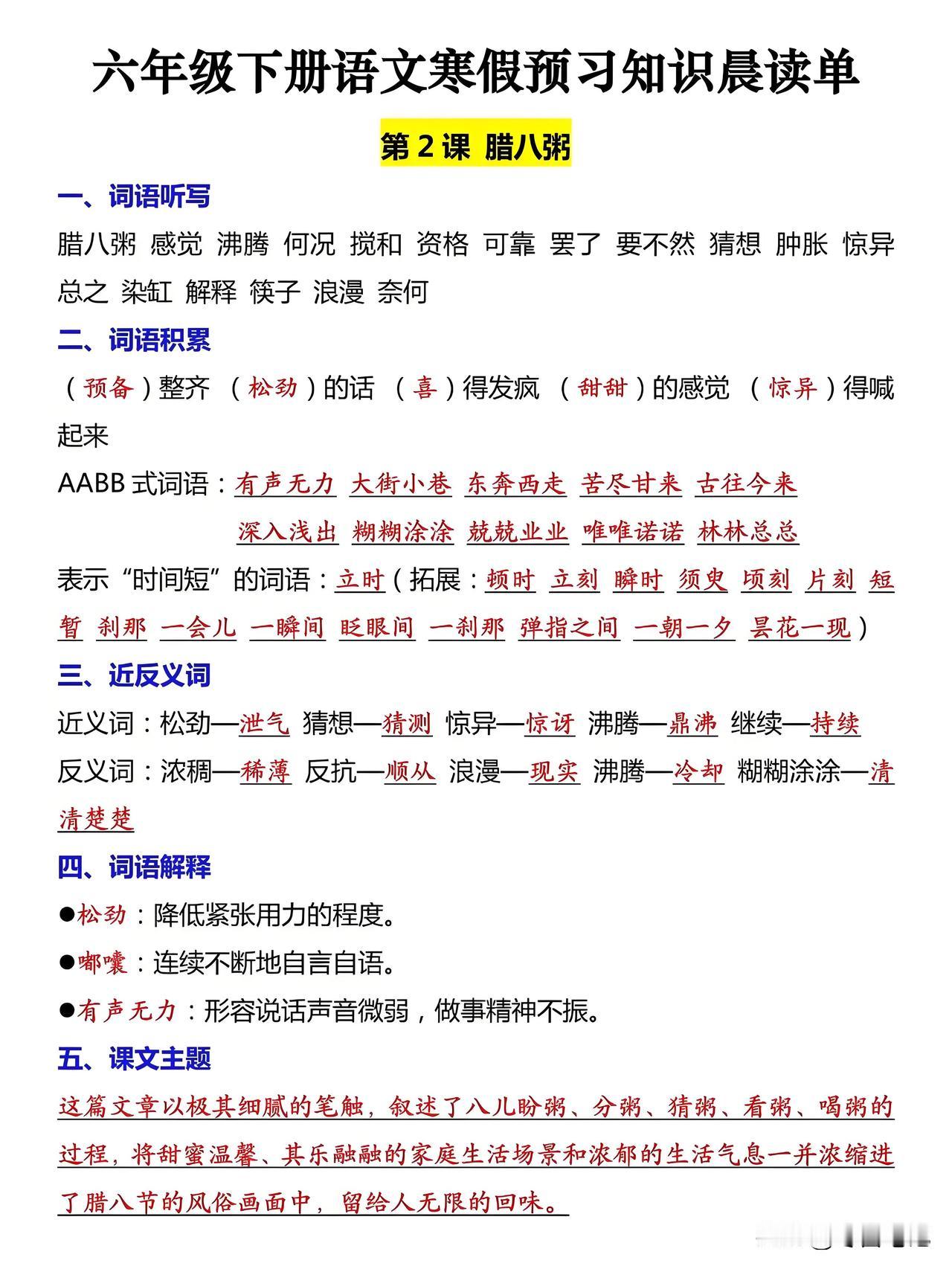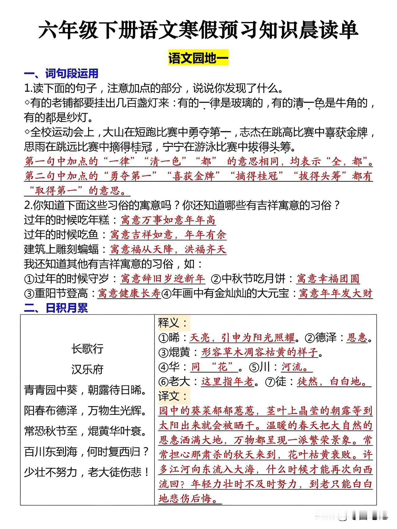 六年级下册数学核心知识点归纳+六年级下册语文第一单元晨读单,是孩子新学期查漏补缺
