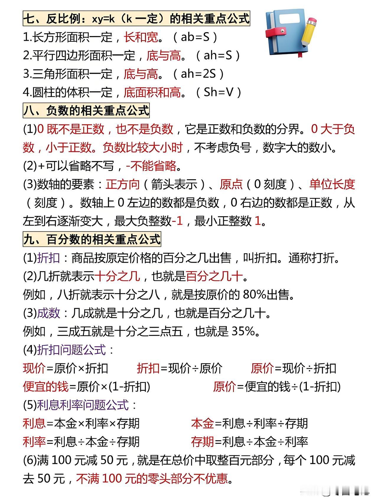 数学核心知识点侧重概念理解与公式运用,五大板块考点要逐个突破。开篇负数的认识是基础,需理解正负数的相反意义,掌握0的特殊性及大小比较方法。百分数(二)的折扣、利率、税率计算是应用题高频点,要牢记现价、利息等核心公式,结合购物、存款等实际场景熟练解题。圆柱与圆锥是几何重点,务必分清表面积与体积的计算区别,熟记体积公式,尤其注意圆锥体积是等底等高圆柱体积的三分之一。比例部分要吃透比例的基本性质,会解比例,区分正反比例关系,掌握比例尺的相关计算。最后,总复习板块要梳理数与代数、图形与几何的核心公式,扫清知识盲区。