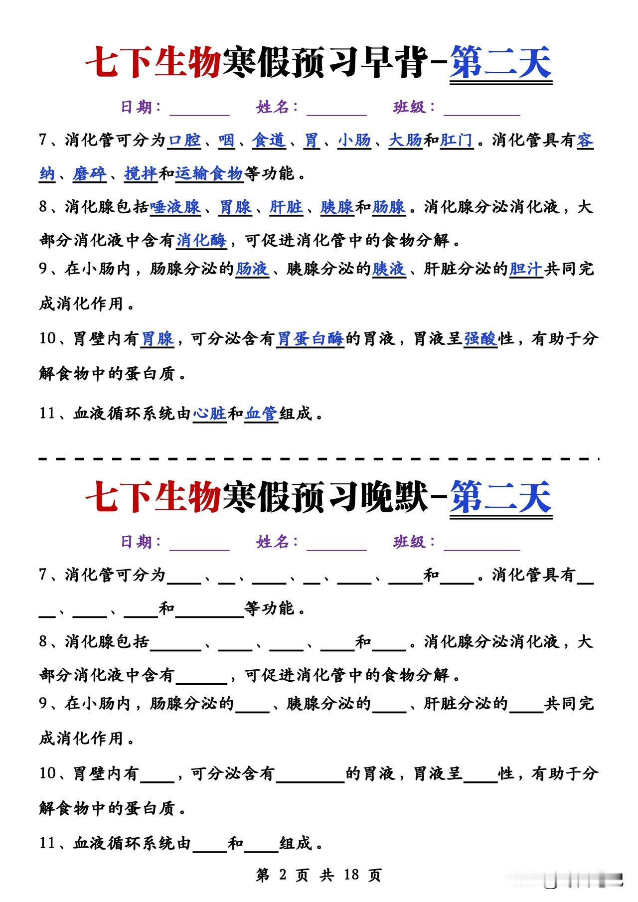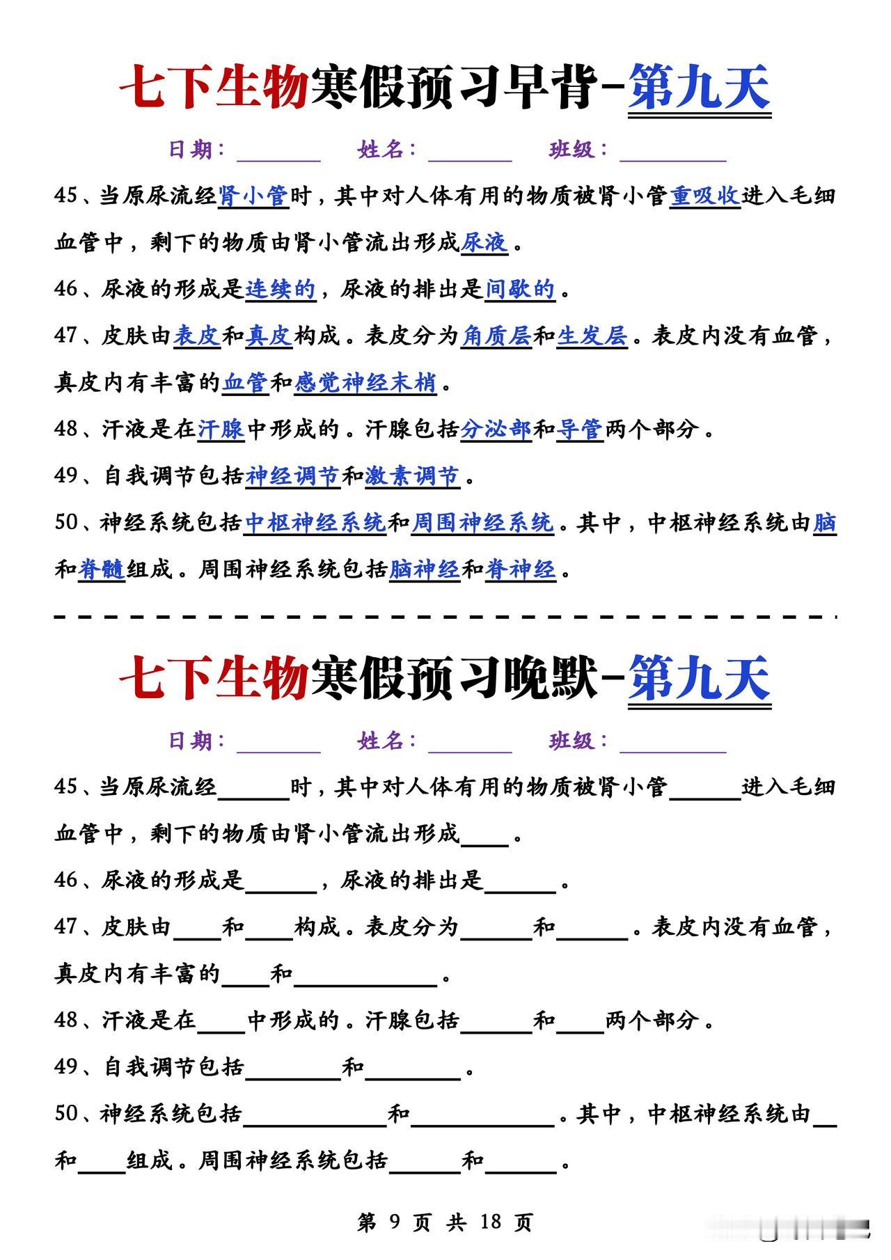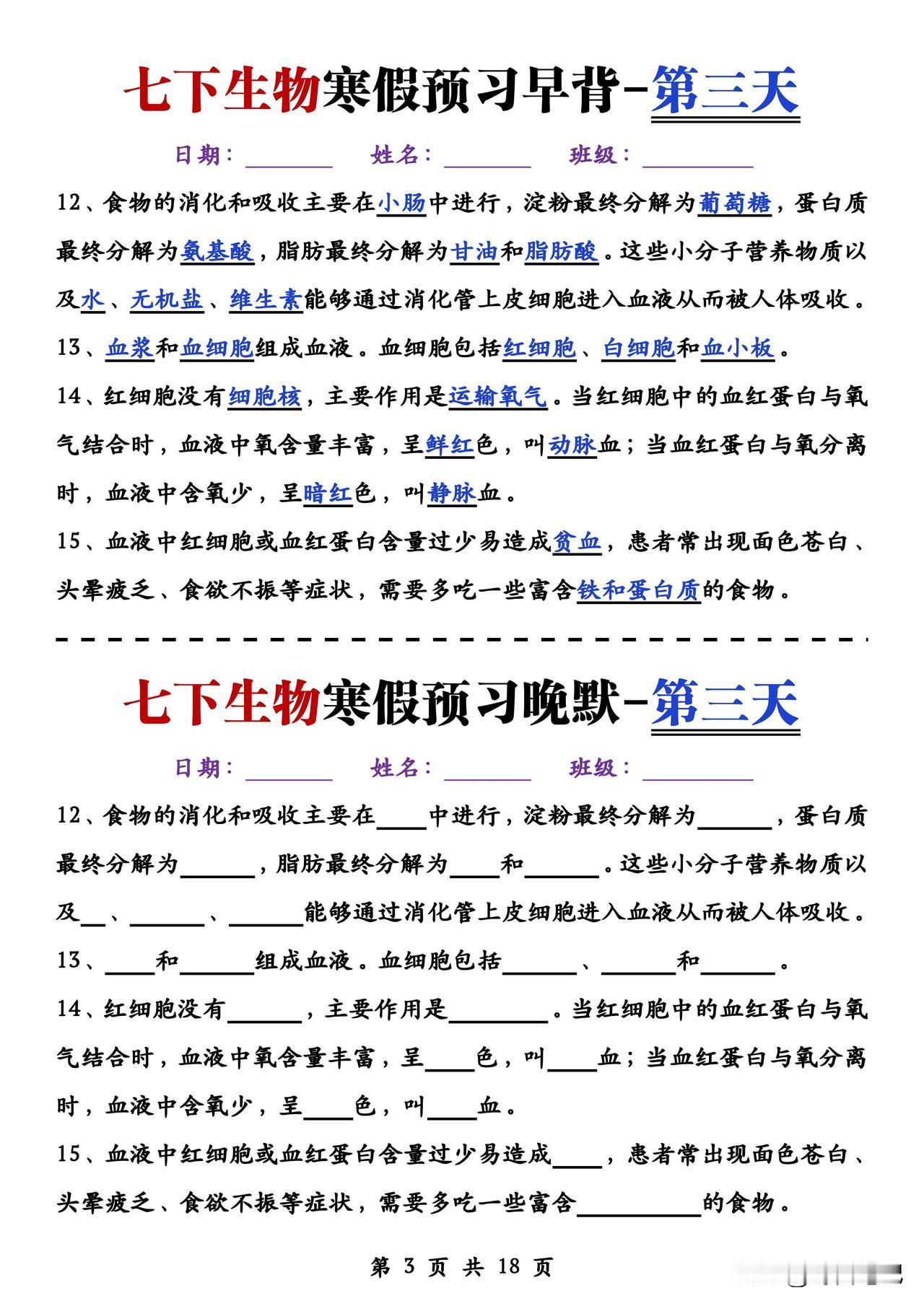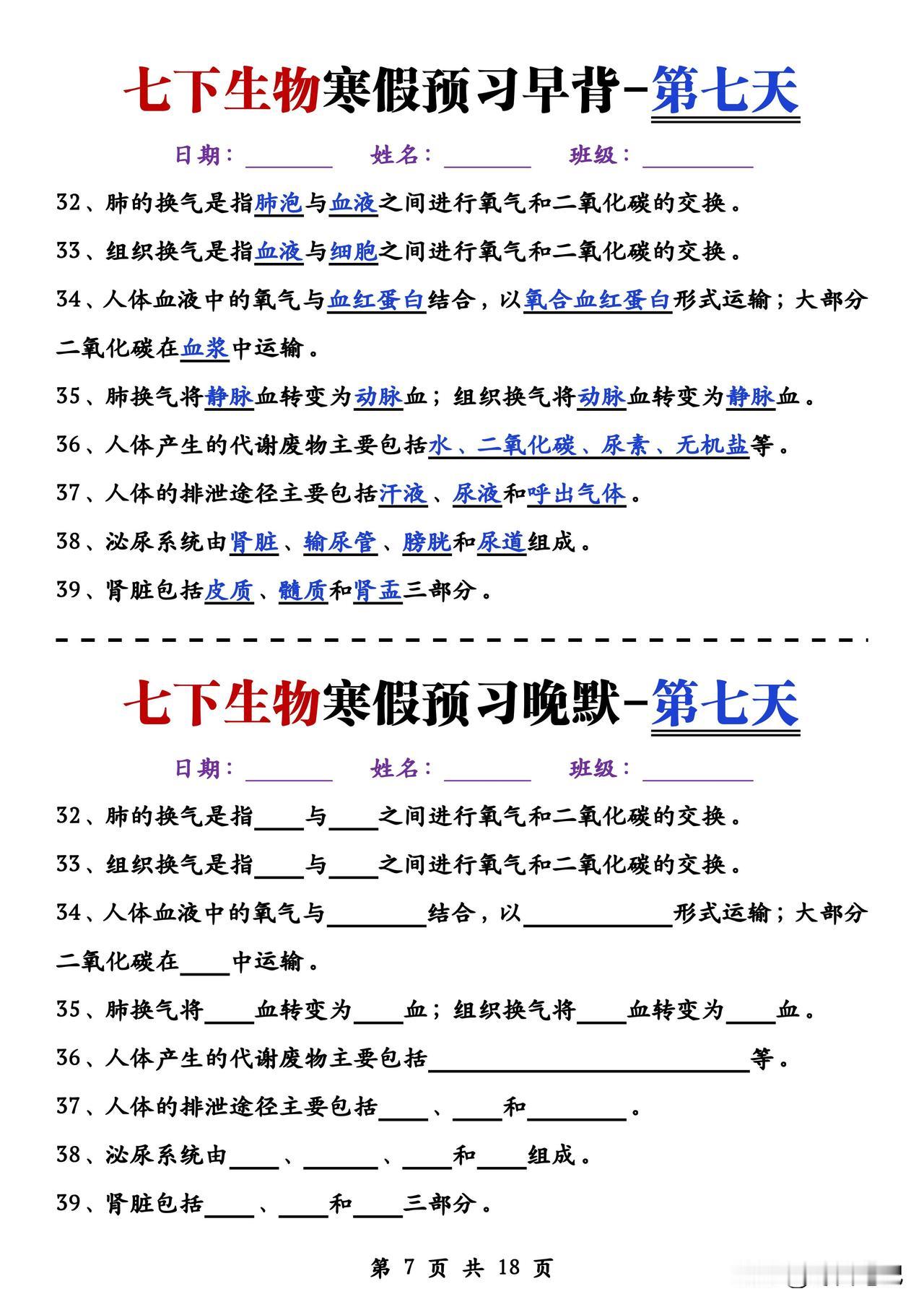 七年级下册生物|寒假预习每日一练,打印即练,开学稳拿高分 寒假不是用来放松的