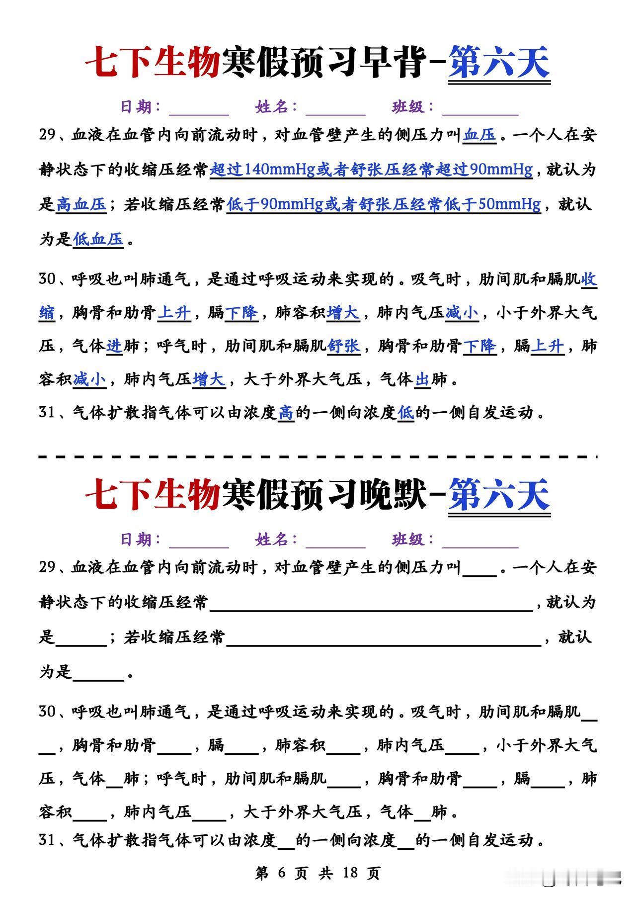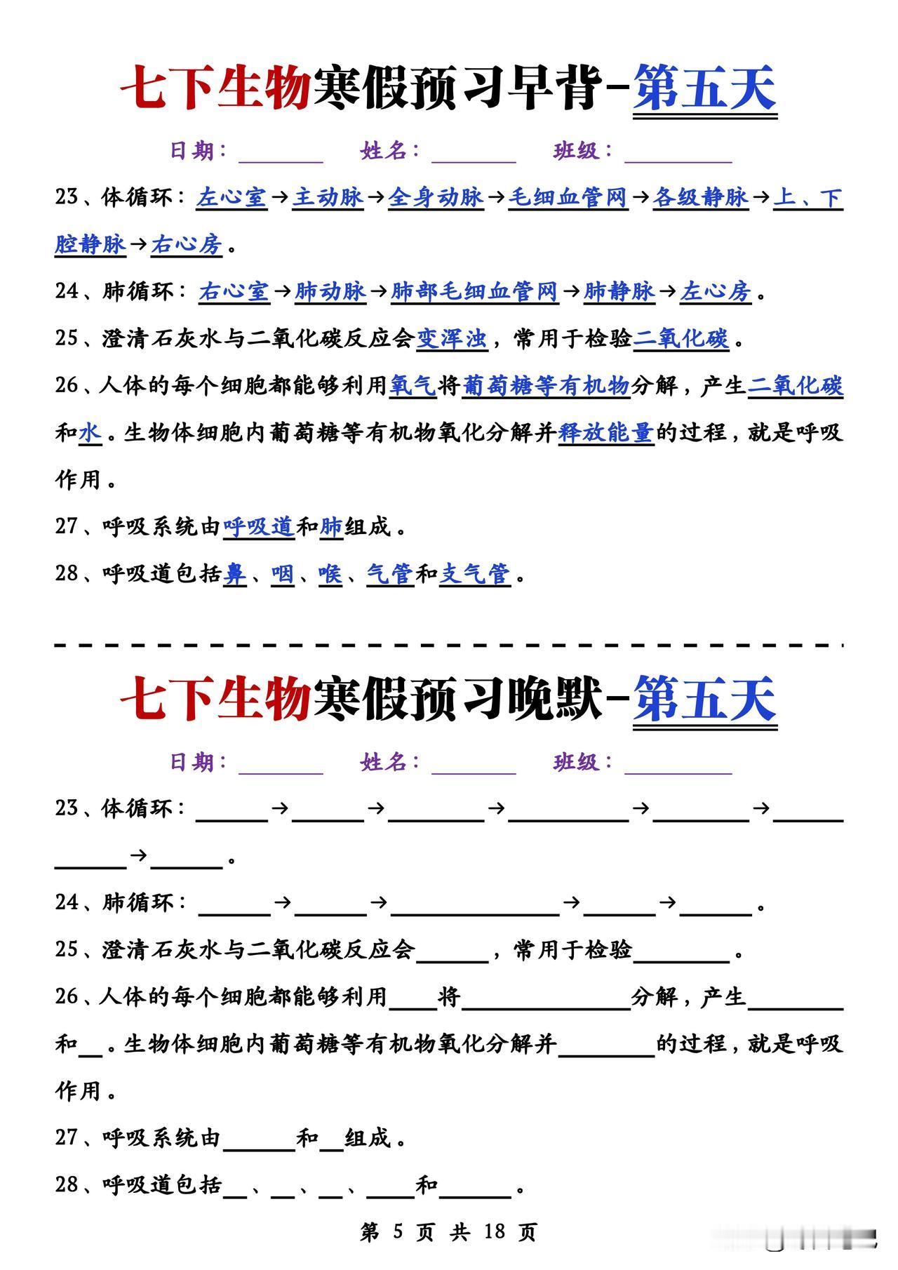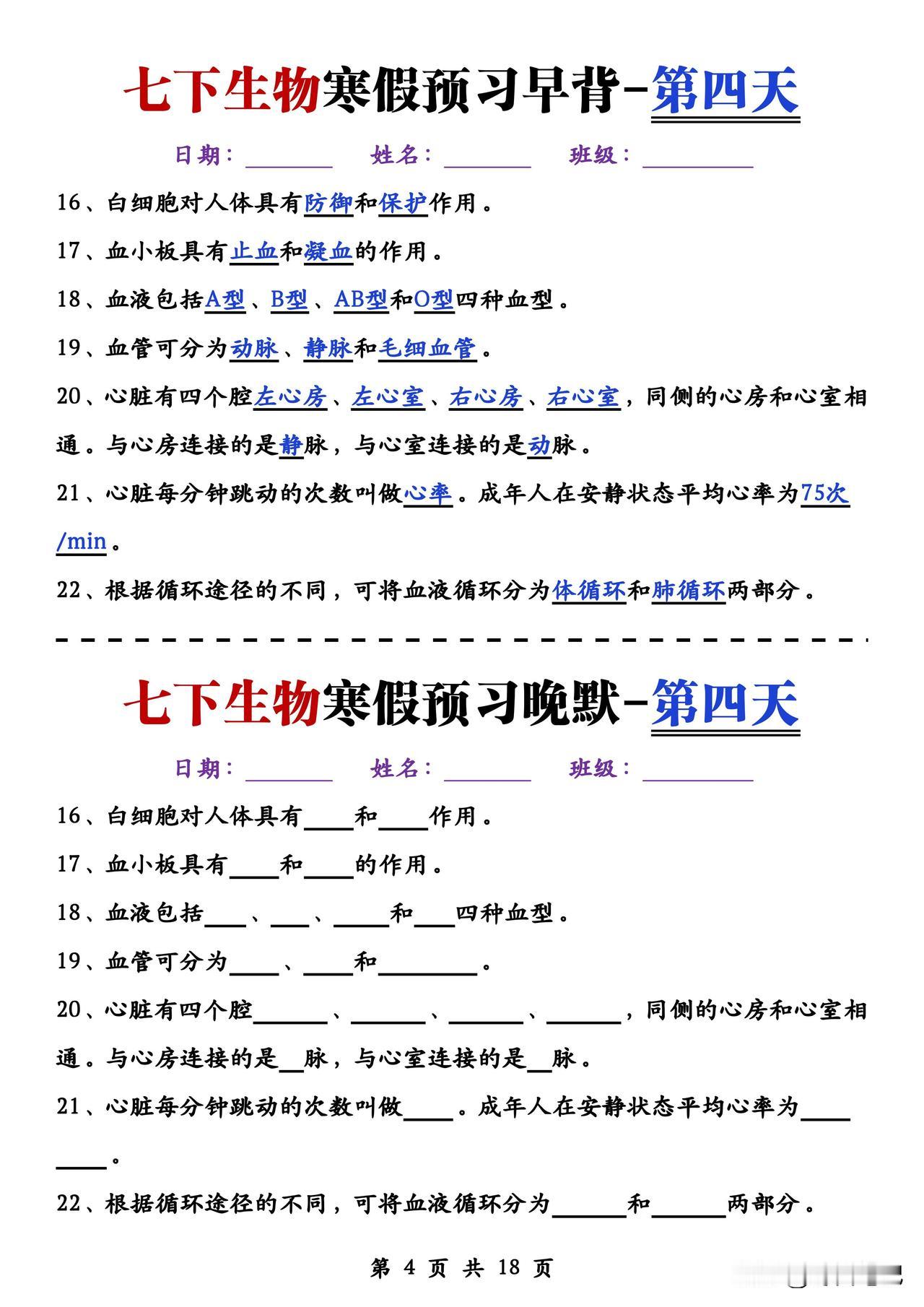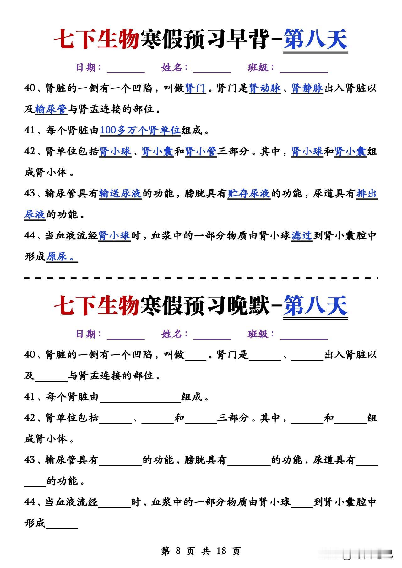 七年级下册生物|寒假预习每日一练,打印即练,开学稳拿高分 寒假不是用来放松的