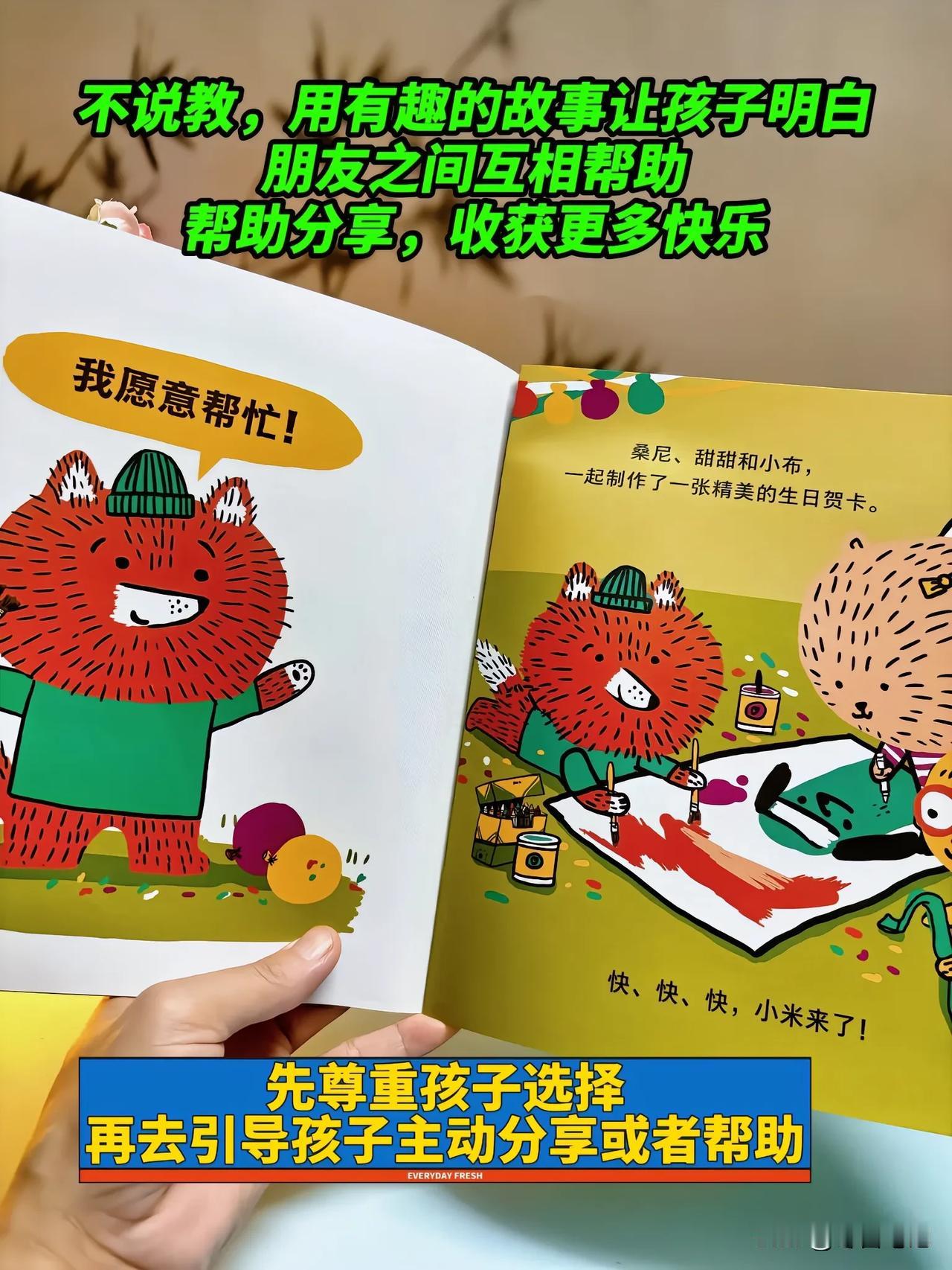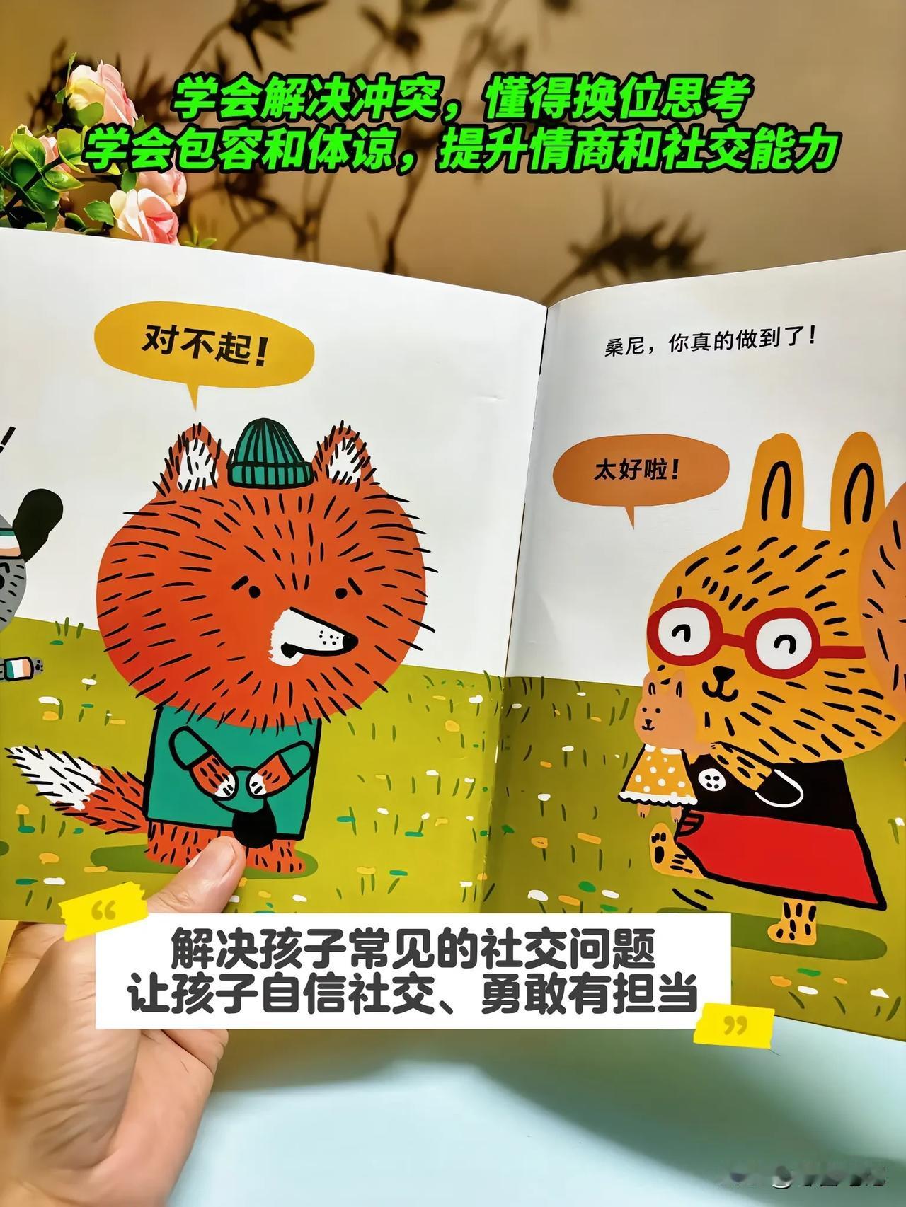 坚持共读一段时间就会发现,孩子渐渐不再用哭闹解决问题,遇到喜欢的玩具会主动询问,自己的东西被碰时也能勇敢表达“这是我的,你要先问我”。他们会变得更自信、独立、有主见,告别成长中的小内耗,社交能力也会“蹭蹭”上涨,轻松变身懂礼貌、会沟通的“小社牛”宝宝。