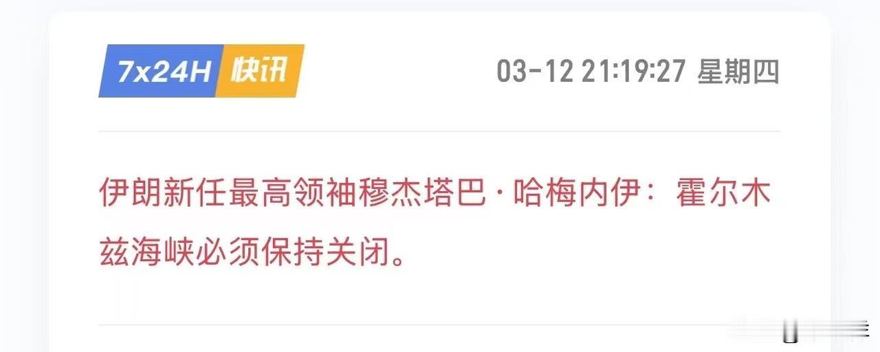 关闭霍尔木兹海峡影响是双向的,不只是对石油进口方,同样对伊朗的影响不可小觑。原油上涨还能持续多久 没有需要的物资进入伊朗,伊朗能支撑多久?在看谁先眨眼,谁耗得过谁的情景下,不看对伊朗的影响而只谈石油价格上涨对需求方的影响是不全面的。伊朗最高领袖发表首份声明伊朗最高领袖穆杰塔巴·哈梅内伊说,不会放弃复仇,霍尔木兹海峡将继续关闭。中东局势升级