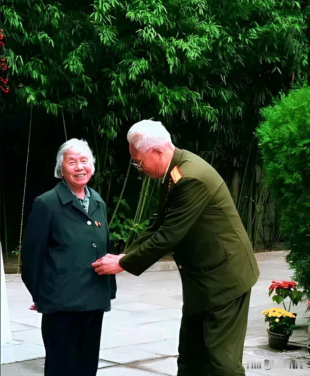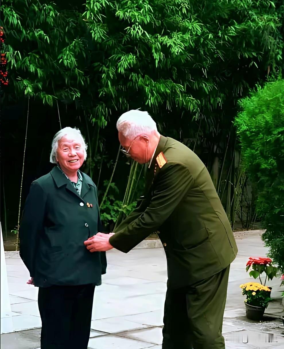 1988年,刚刚获得上将军衔的国防大学校长张震,与夫人马龄松同志的珍贵留影瞬间。 照片中的夫妻俩已满头白发,但精神状态很好,恩爱如初,张老看到妻子衣服上的扣子没扣,立即弯腰帮妻子系上扣子,整理衣着,彼时的妻子笑容满脸,幸福温馨。
