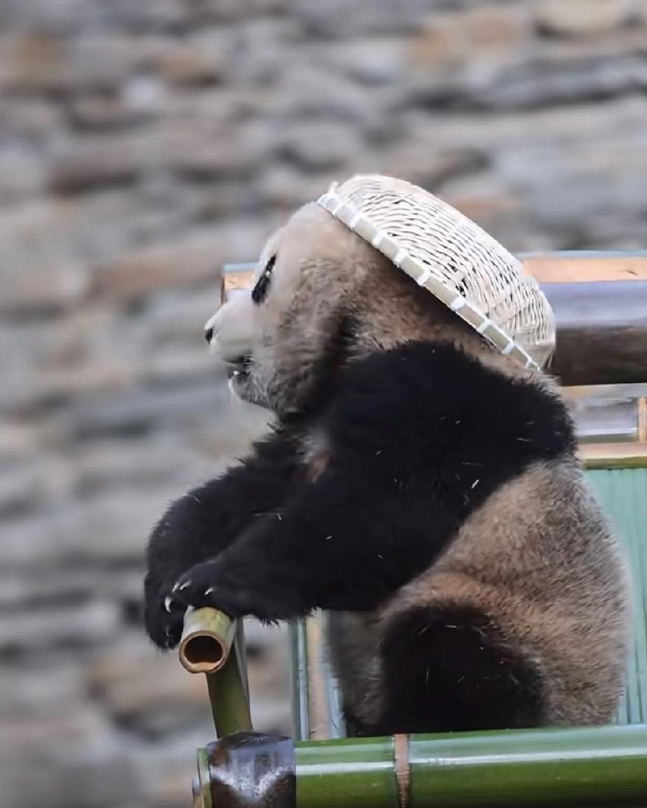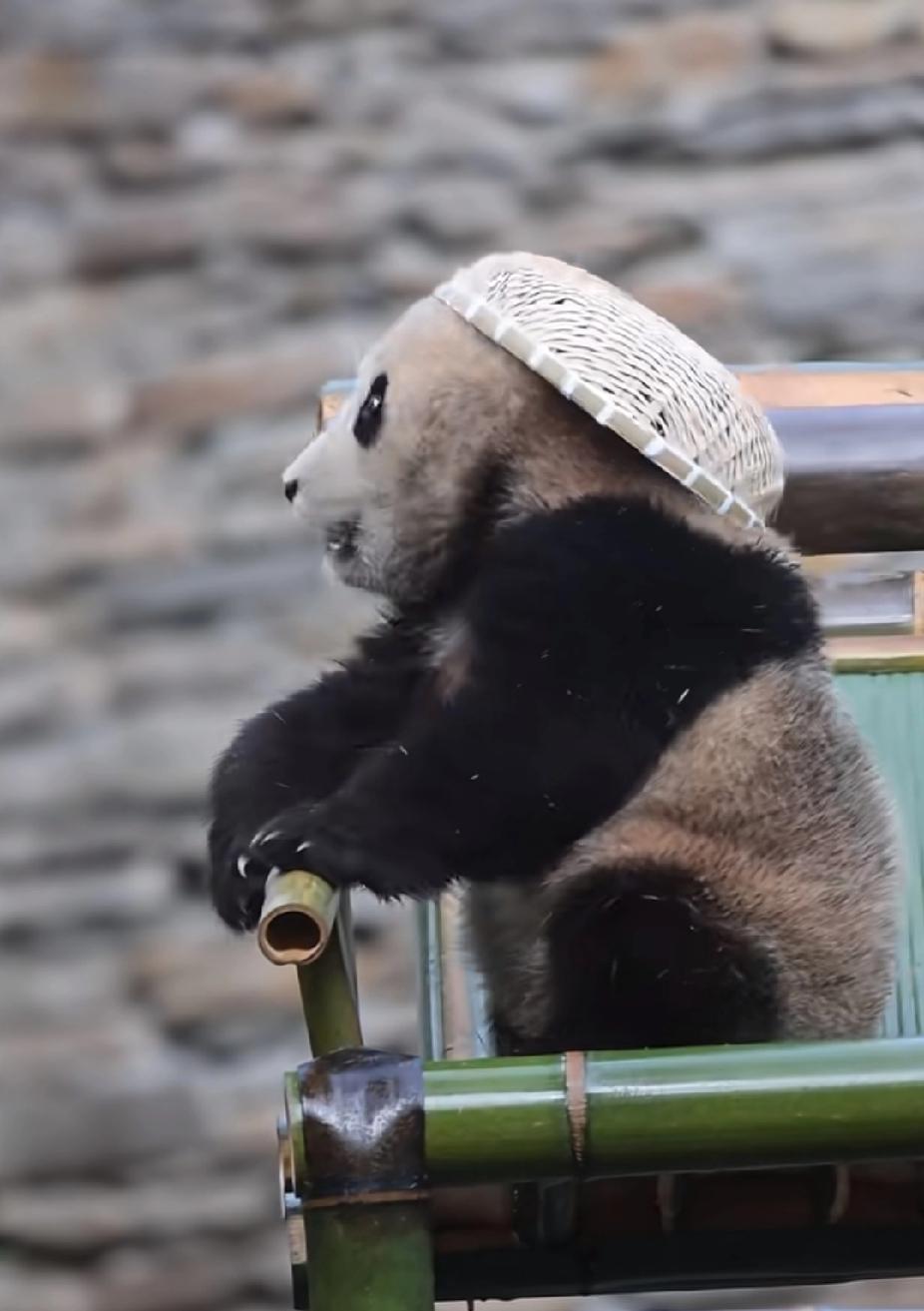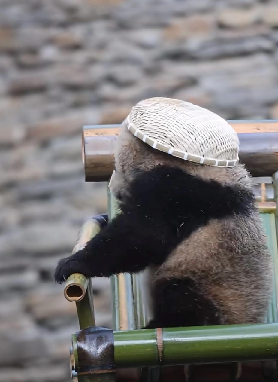 哪家奶爸这么可爱啊?随手就给崽崽扣了顶“帽子”,本来还生龙活虎精力旺盛的崽崽立马像被紧箍咒套住了,可怜兮兮地扒拉着脑袋上的物件。