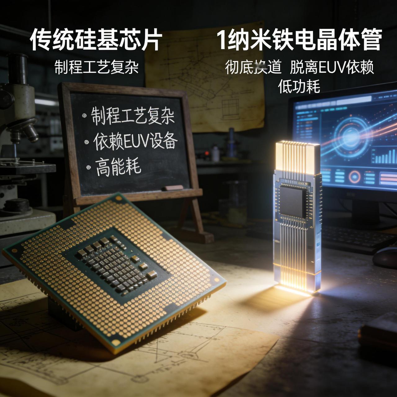 当全世界的目光还聚焦在硅基芯片3纳米、2纳米的制程竞赛中,被EUV光刻机的禁令卡得举步维艰时,北大邱晨光、彭练矛团队的成果像一道惊雷,劈开了半导体产业的新赛道——他们研制出的1纳米铁电晶体管,不是对现有技术的修修补补,而是一场彻底的"换道超车"。