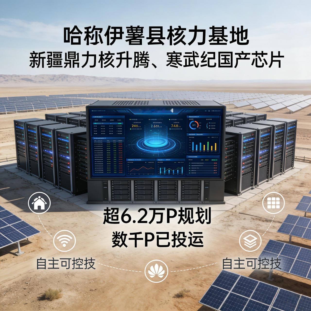 依托东数西算国家战略,新疆哈密直接发力,百亿级投资落地,伊吾县算力规划规模突破6.2万P,戈壁滩上一座座AI数据中心拔地而起。更重要的是,这里全面搭载华为昇腾、寒武纪等国产芯片,以规模化部署补齐单芯片差距,彻底摆脱国外技术卡脖子。