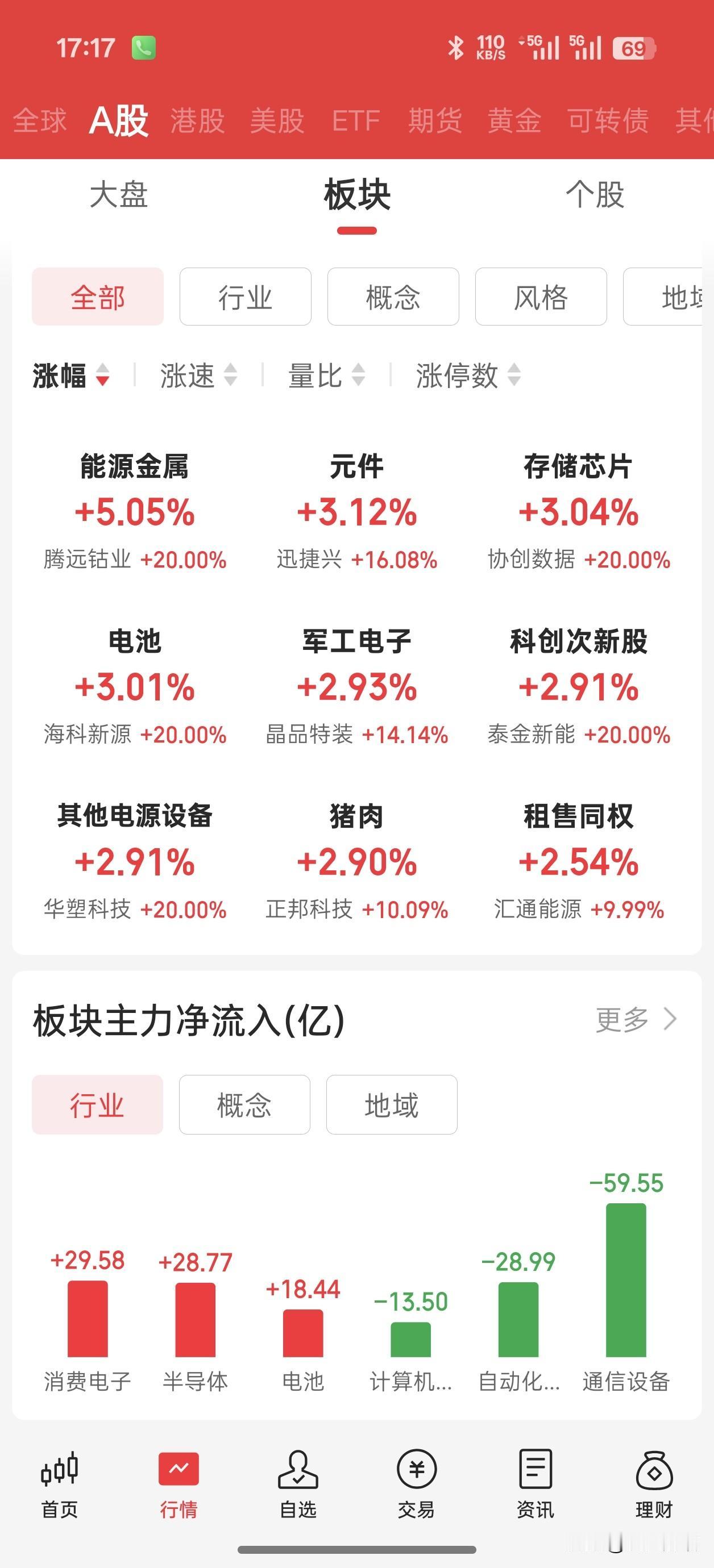 板块呈结构性行情:AI应用、半导体、算力、存储器全线爆发,CRO、锂电池、商业航天午后走强;油气、煤炭等周期股偏弱。个股普涨,超3700家上涨,涨停71家。