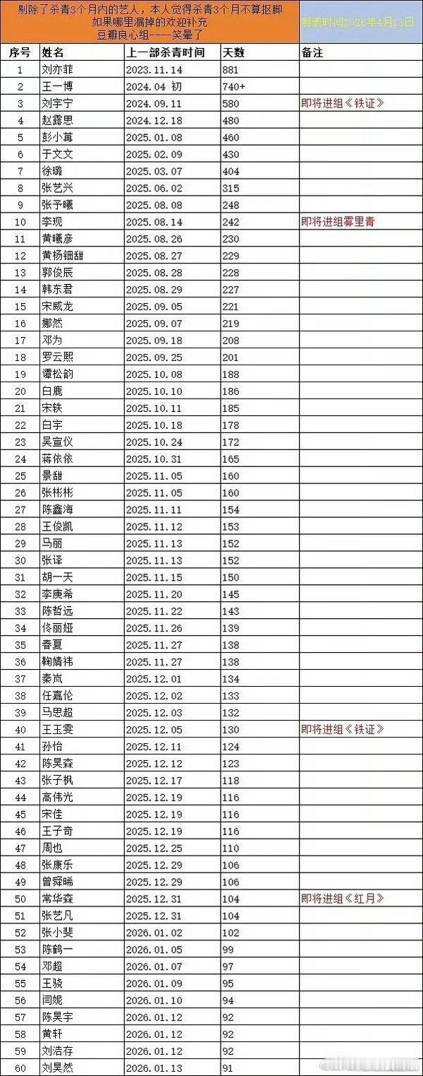 ⭐王一博 740天+未进组⭐吴磊 在组⭐刘昊然 91天未进组⭐王鹤棣 在组⭐王俊凯 153天未进组⭐陈哲远 143天未进组⭐张凌赫 在组⭐张新成 ?⭐邓为 208天未进组⭐丁禹兮 在组⭐曾舜晞 ?⭐宋威龙 ?⭐王安宇 在组⭐许凯 ?⭐侯明昊 ?⭐陈星旭 在组