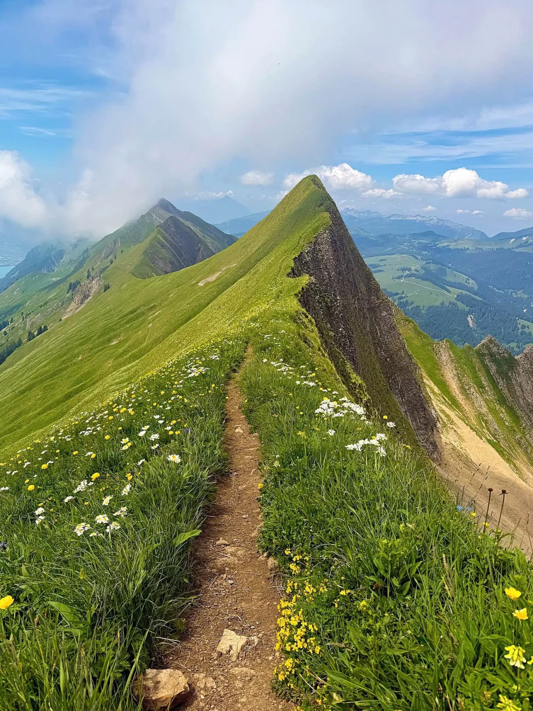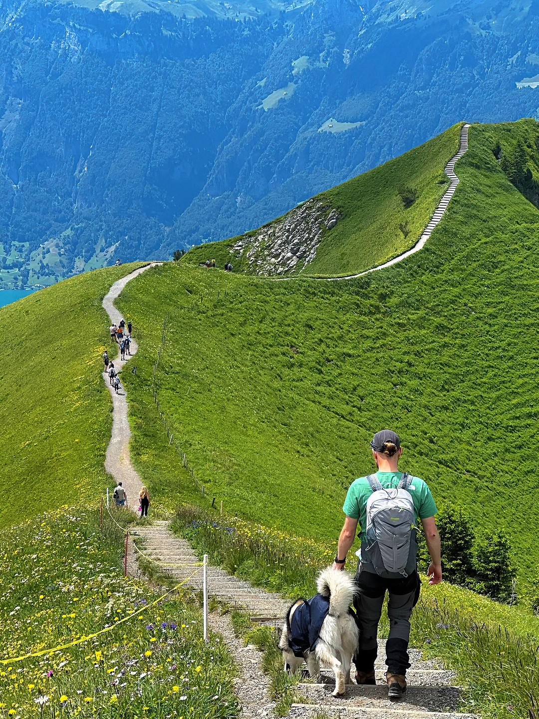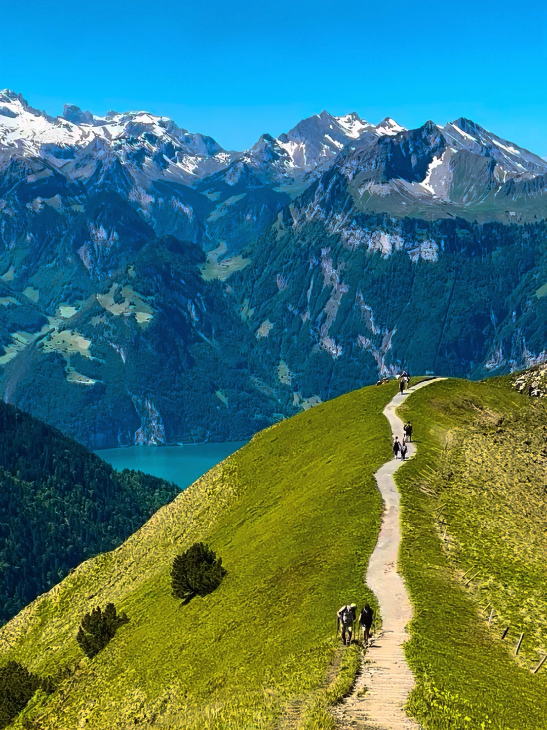 这被誉为瑞士最壮观也最危险的徒步路线之一。全程在狭窄如刀刃的山脊上行走,左边是布里恩茨湖,右边是图恩湖,需要极强的体能和不恐高的体质