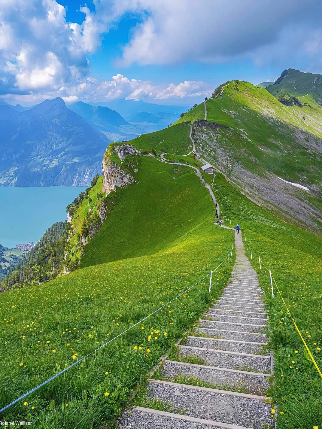 体验世界上最陡的缆车上山后将行走在狭窄的山脊线上,一边是悬崖,一边是深渊。最震撼的是拥有360度的全景视角,可以俯瞰琉森湖及阿尔卑斯山脉的数十个湖泊