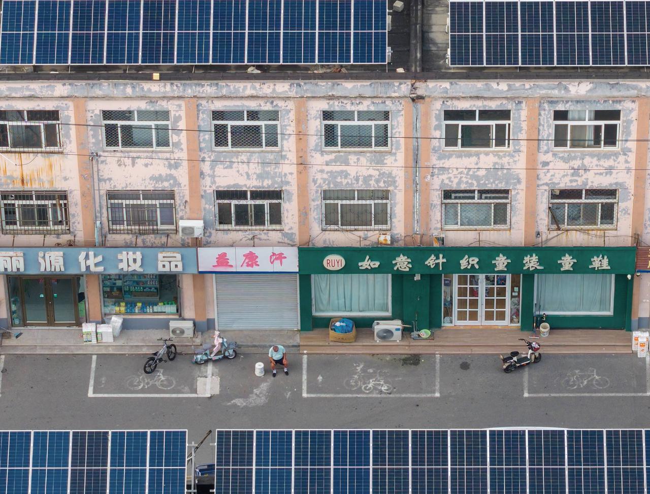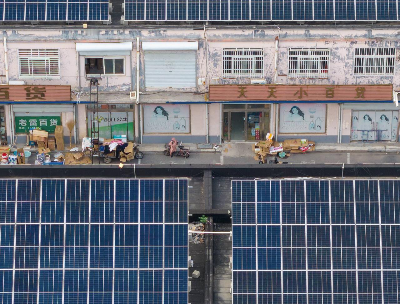 图1是山东滨州市沾供新能源有限公司投资的2.42MW光伏发电项目,图2图3为图1局部放大。此项目为自发自用余电上网模式,安装在农贸市场的建筑顶部,所有商户白天优先使用光伏发出来的电,剩余电输入国家电网。