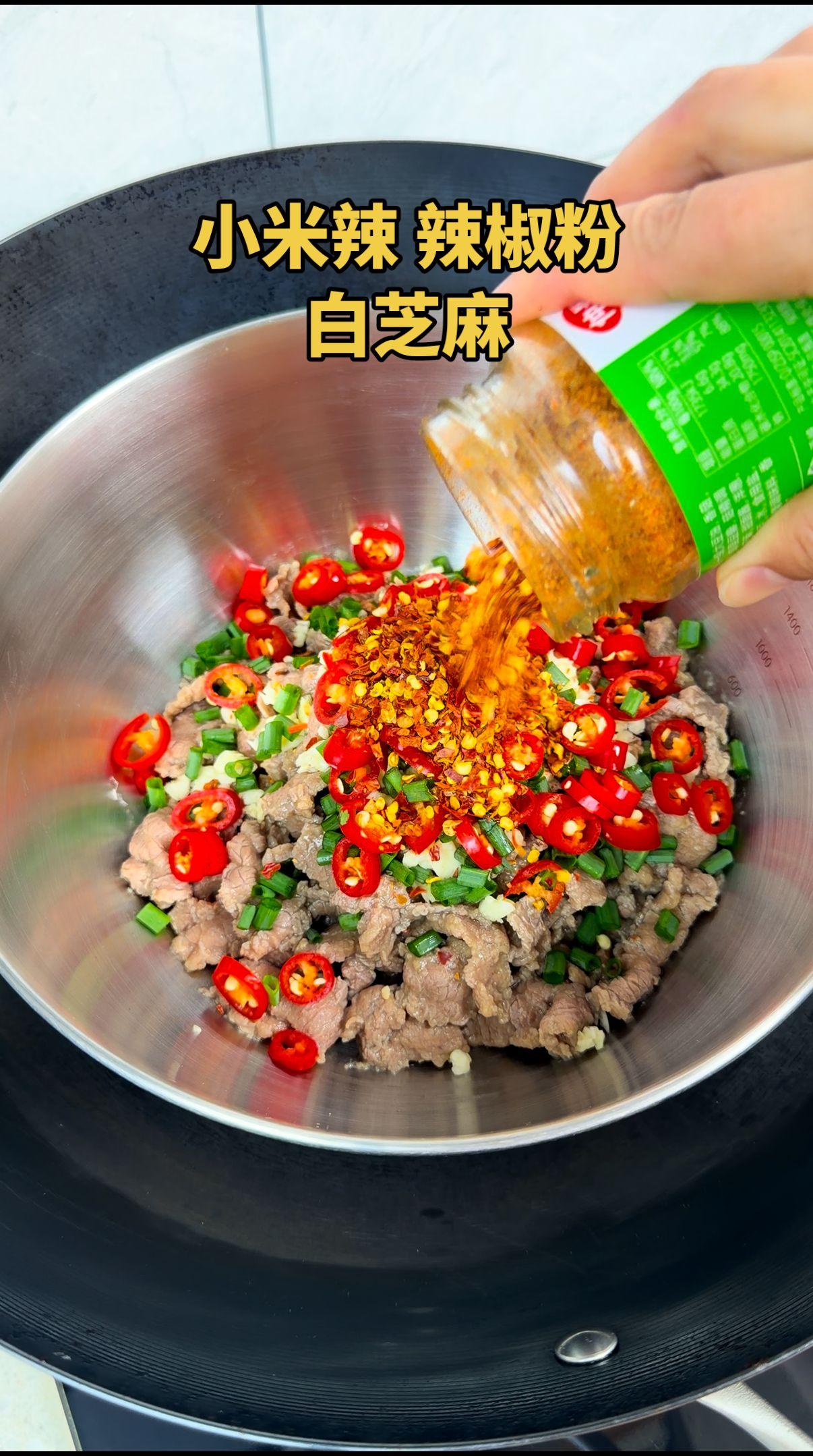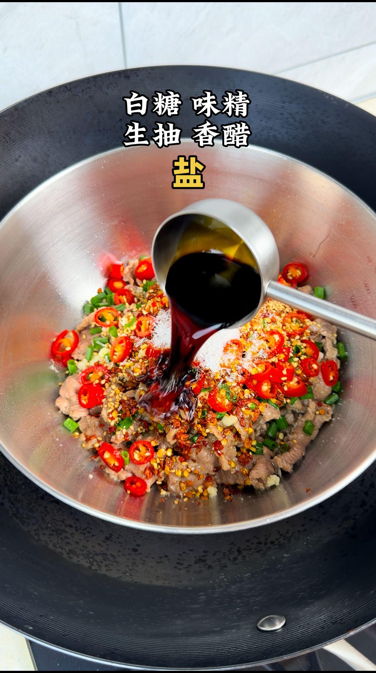 1️⃣备料:蒜末、小米椒、辣椒面、白芝麻,热油一泼立马香!牛肉切片,用盐、白糖、味精、生抽、香醋腌10分钟,口感更嫩~