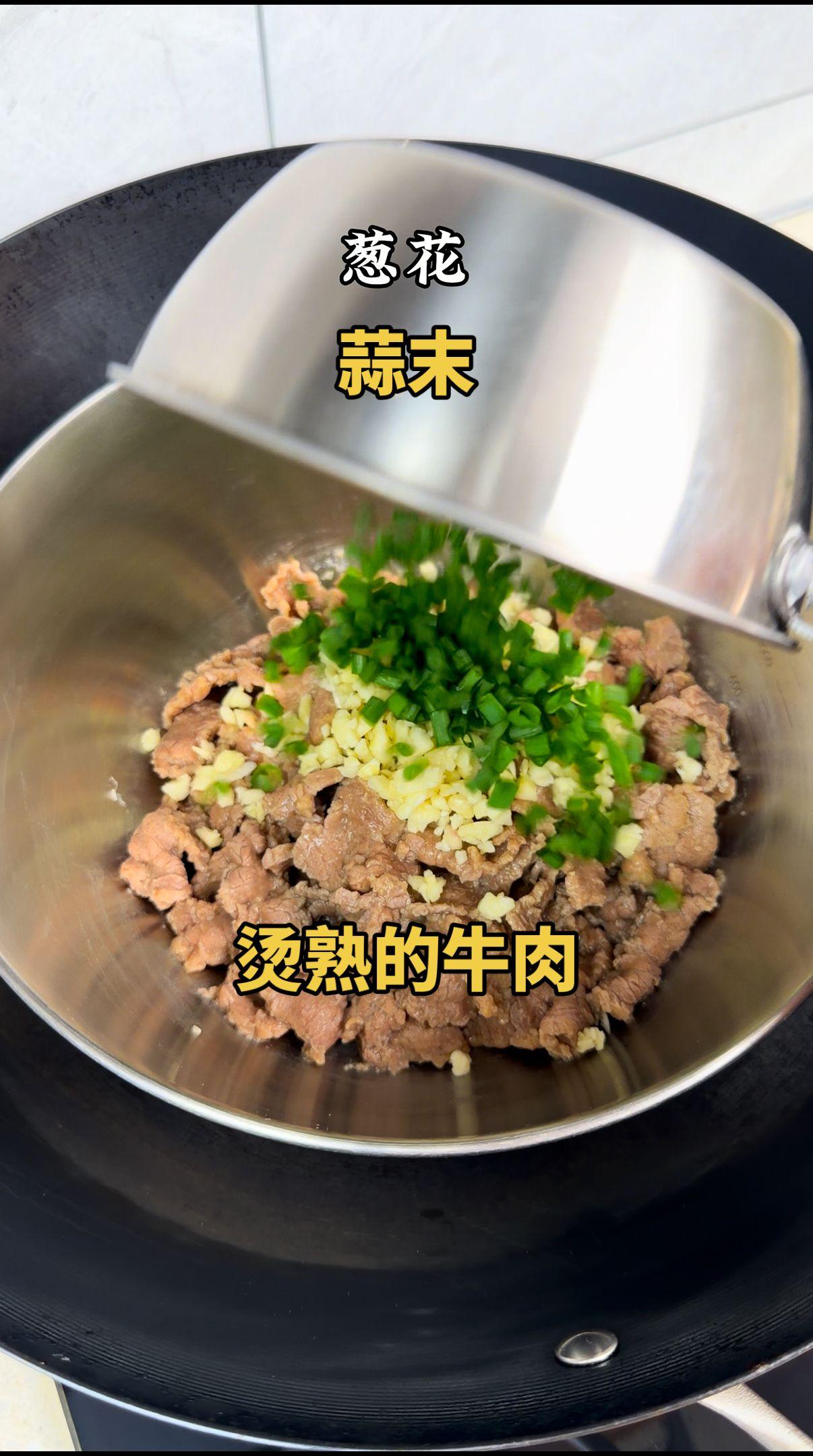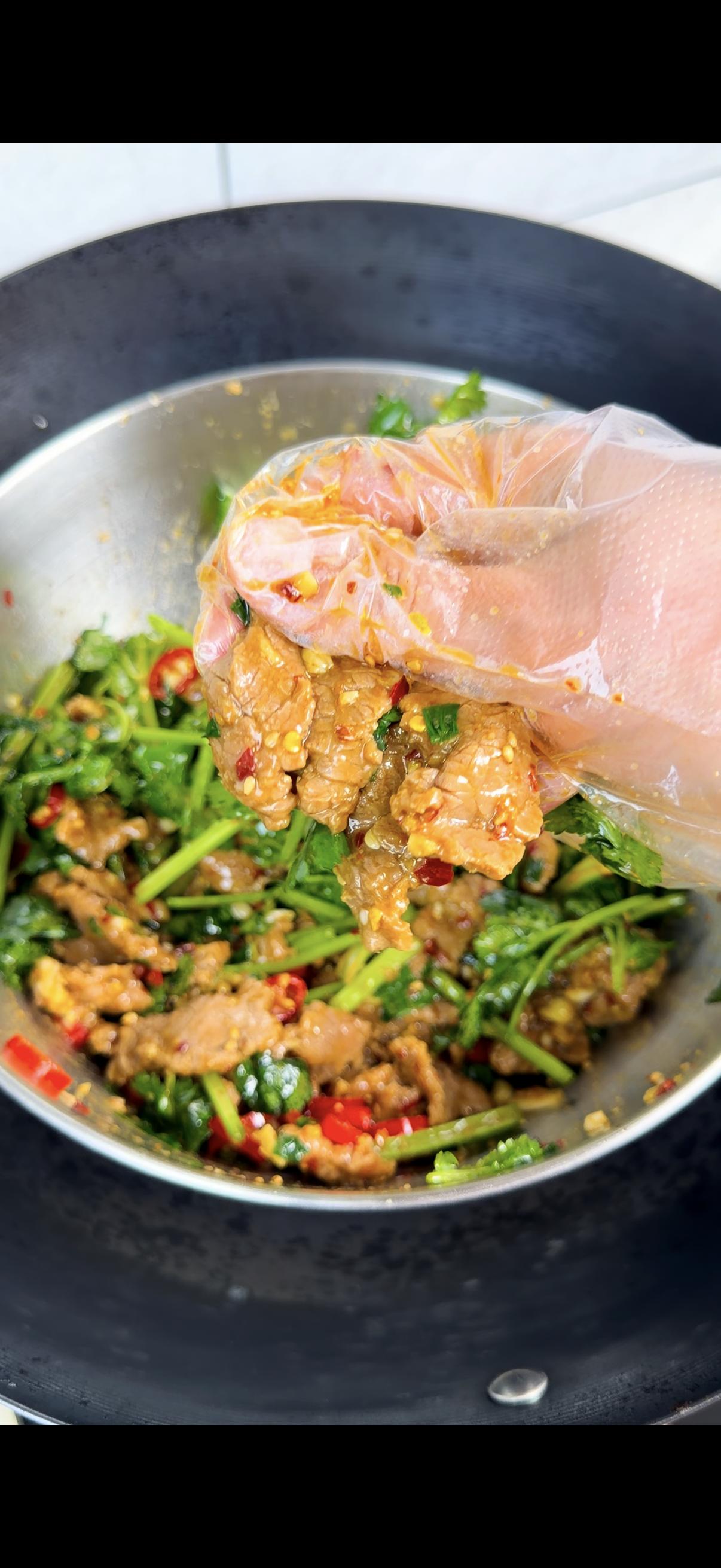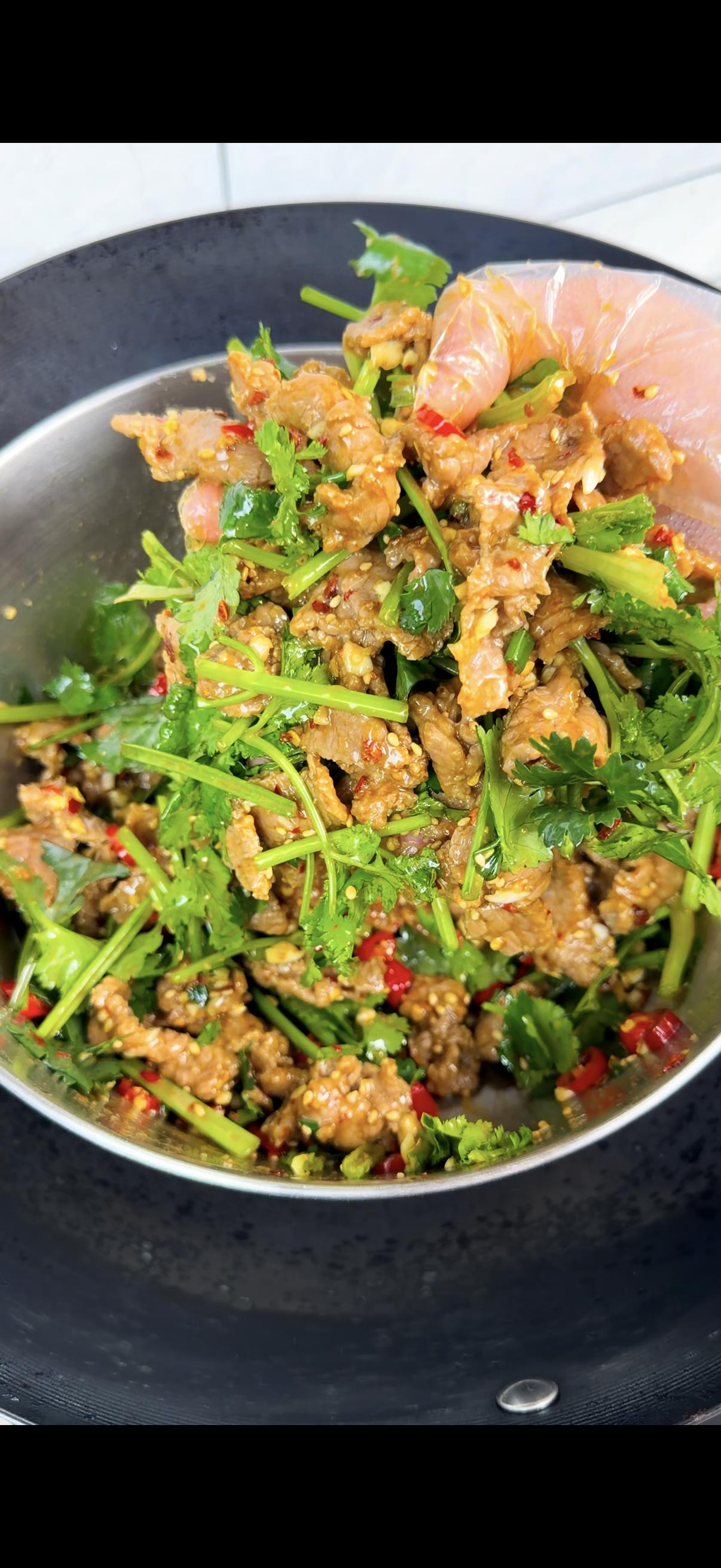 2️⃣爆香:热油浇调料碗,加一大把香菜段一起拌匀,牛肉下锅翻拌,10秒出锅!肉嫩香菜脆,全家抢着吃~