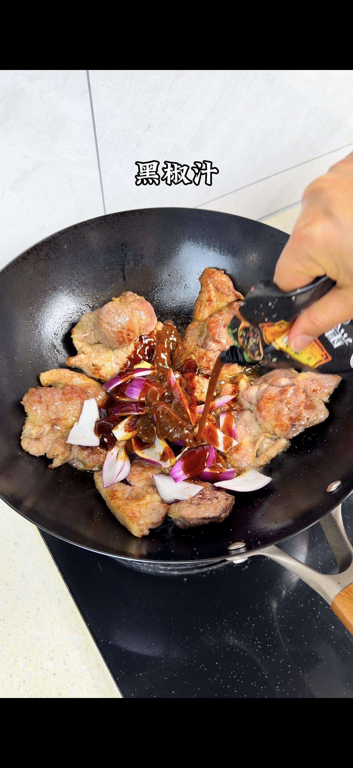 2️⃣调味准备:加盐、白糖、味精、生抽、耗油调味,搅拌均匀后加入适量黑椒汁~