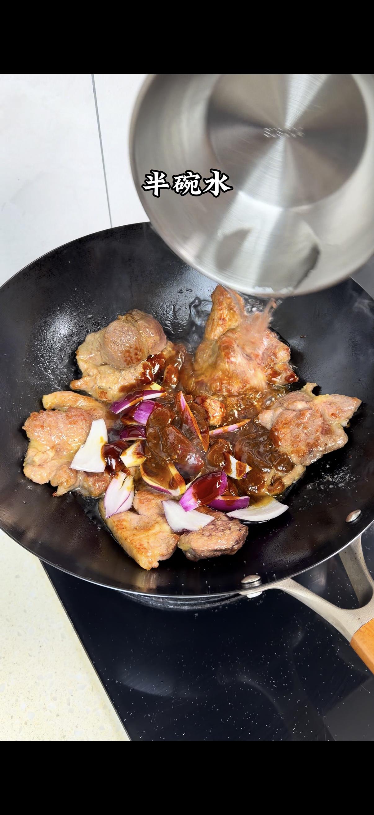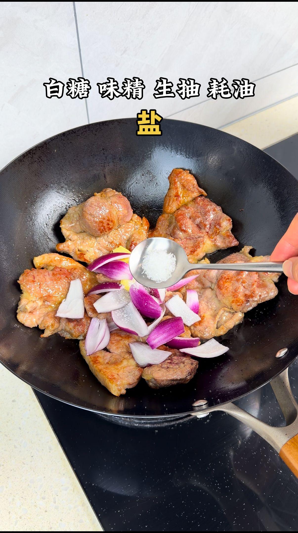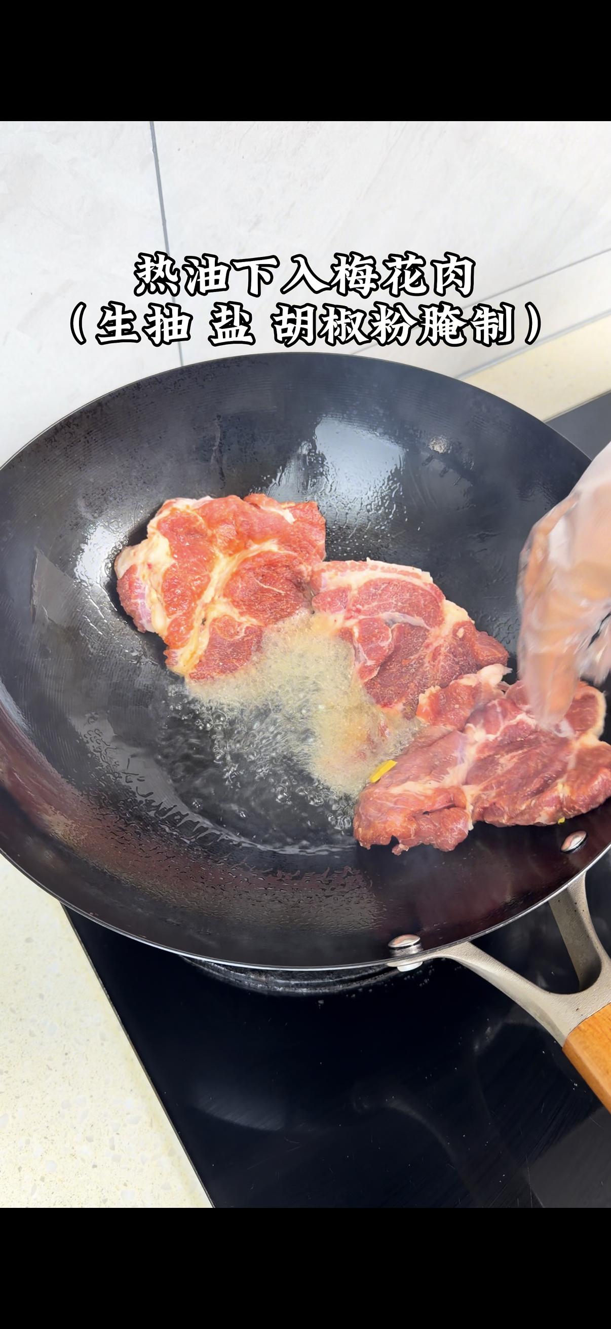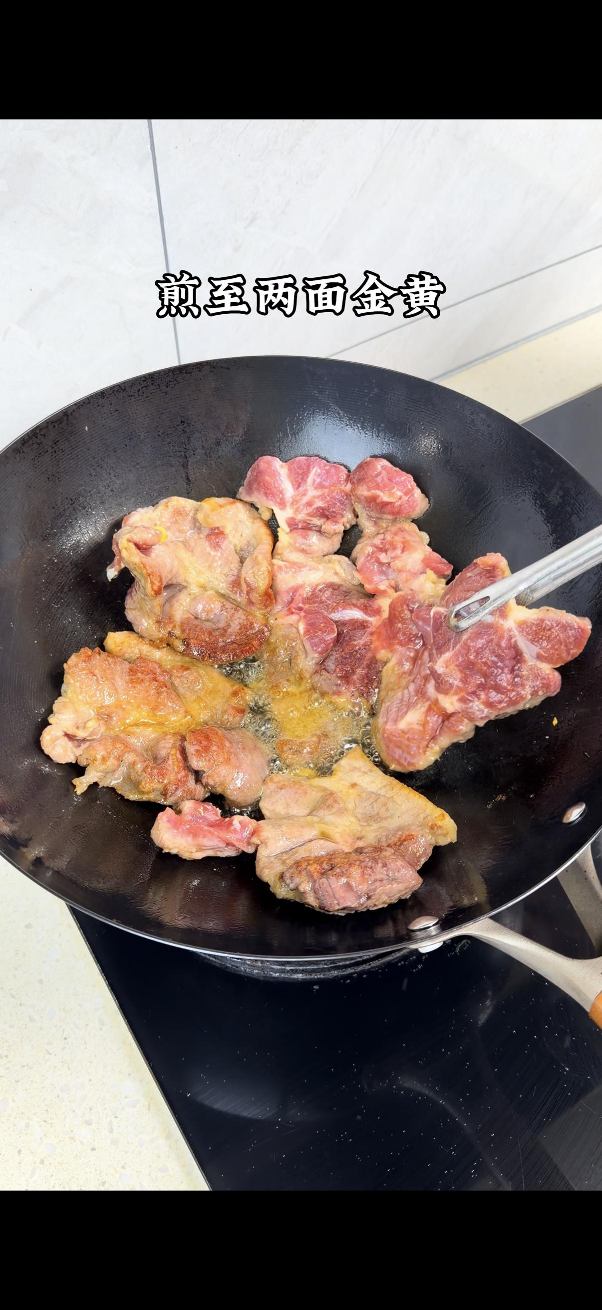1️⃣梅花肉处理:先切厚片,热油下锅煎至两面金黄,锁住肉汁更鲜嫩~