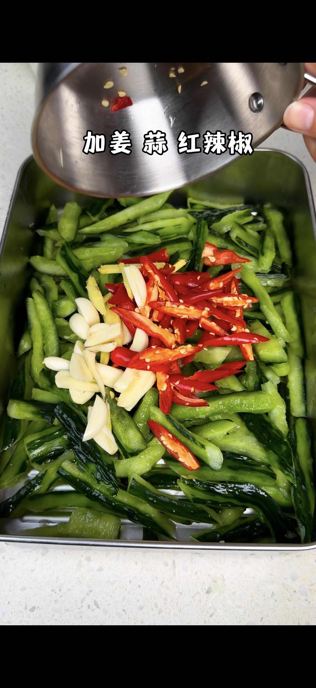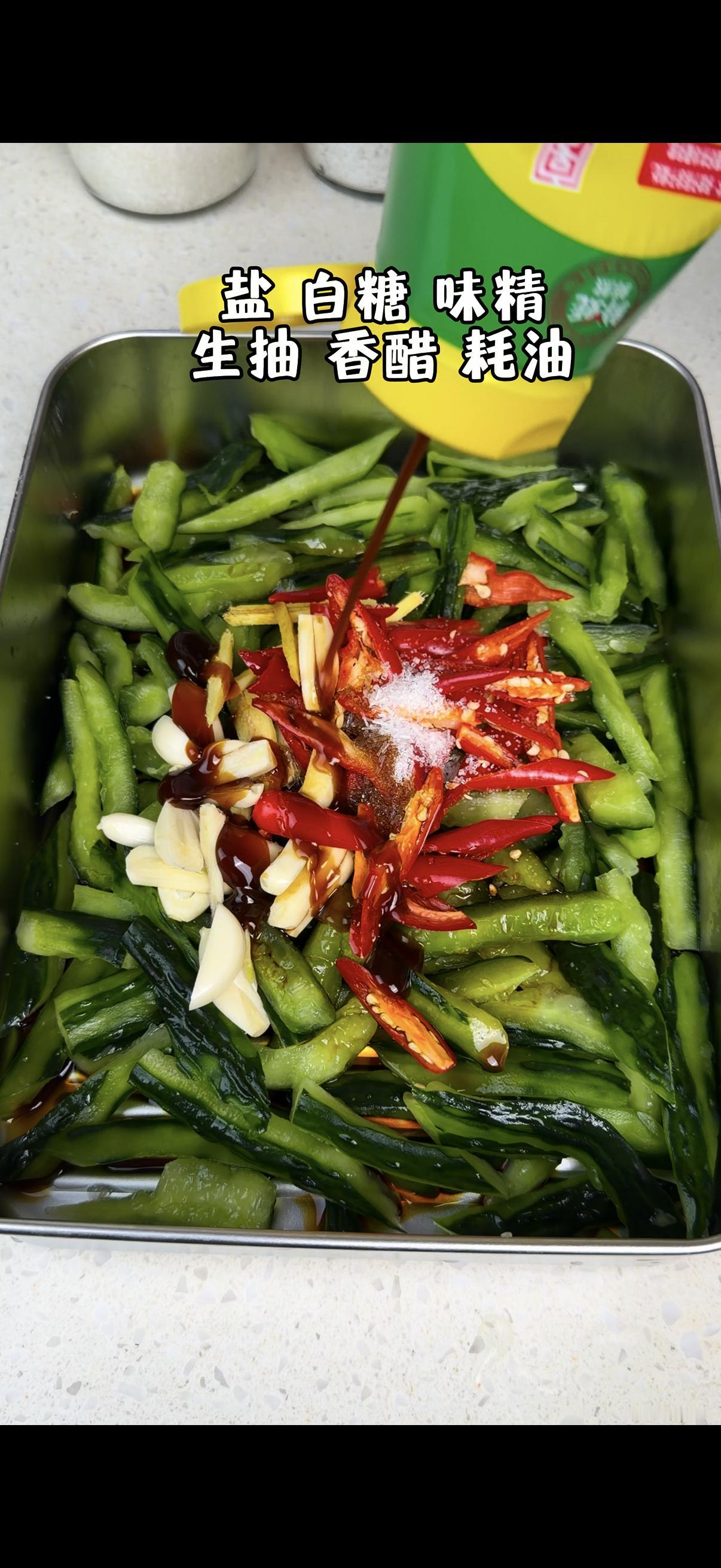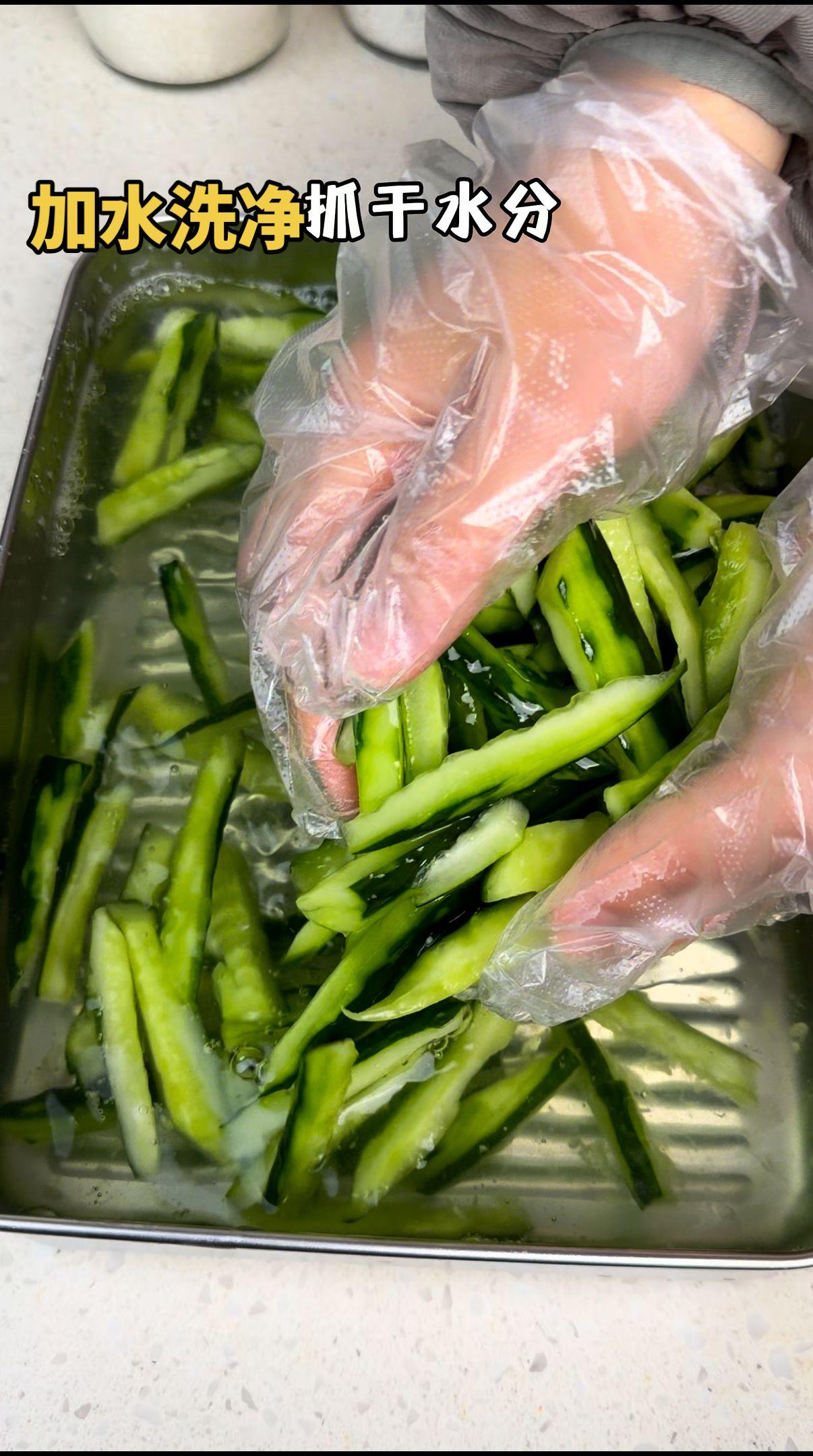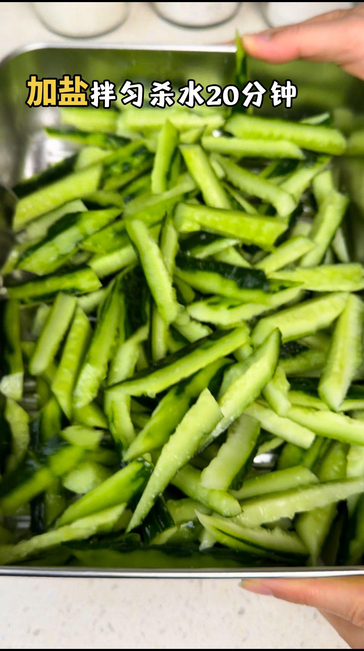 1️⃣处理黄瓜:黄瓜洗净拍一下(拍过更入味),撒上盐,用手抓匀,静置20分钟杀水。水量会析出,倒掉后用清水冲干净,再抓干多余水分~