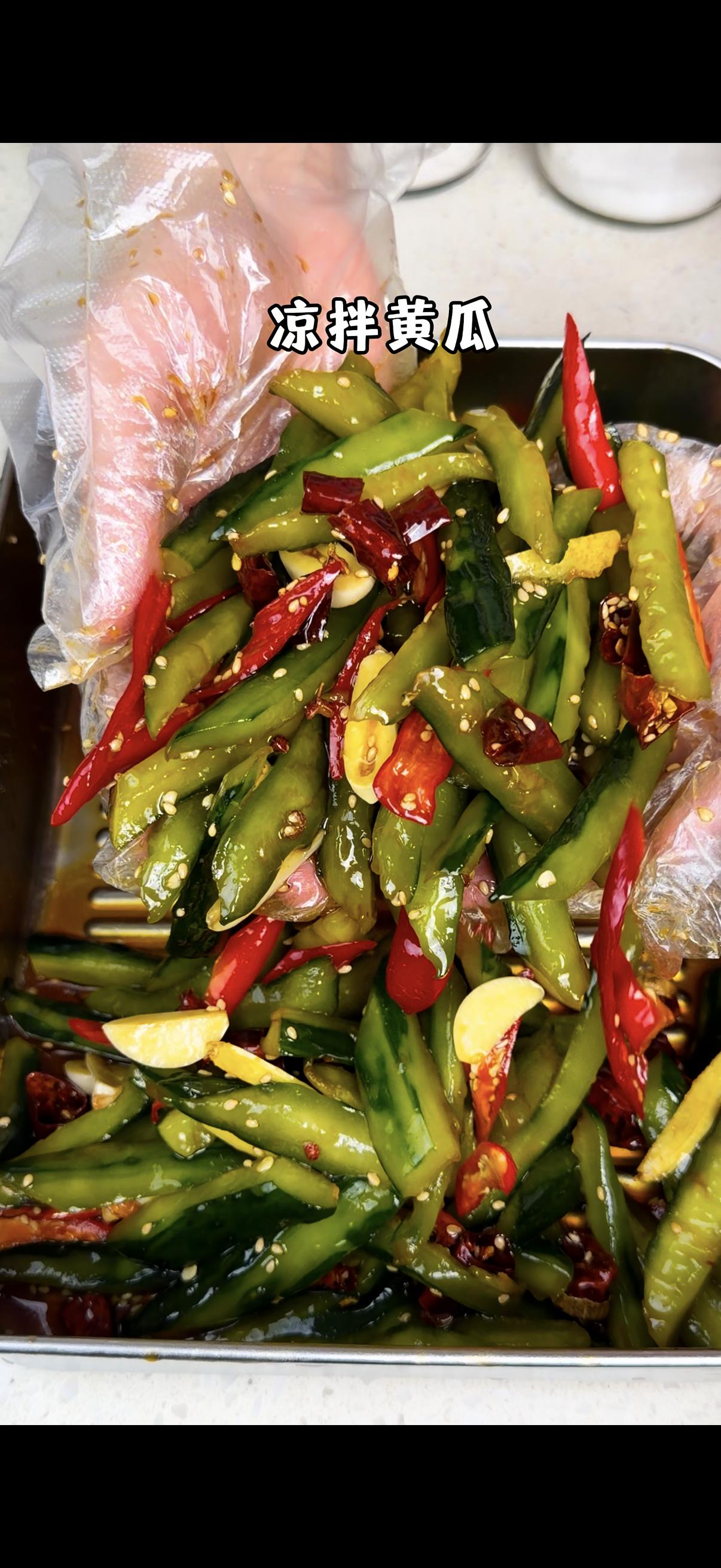 3️⃣拌匀开吃:把处理好的黄瓜放进酱汁碗里,所有材料抓拌均匀,酸辣爽口的凉拌黄瓜就做好啦!口感脆嫩,每一口都开胃到停不下来~