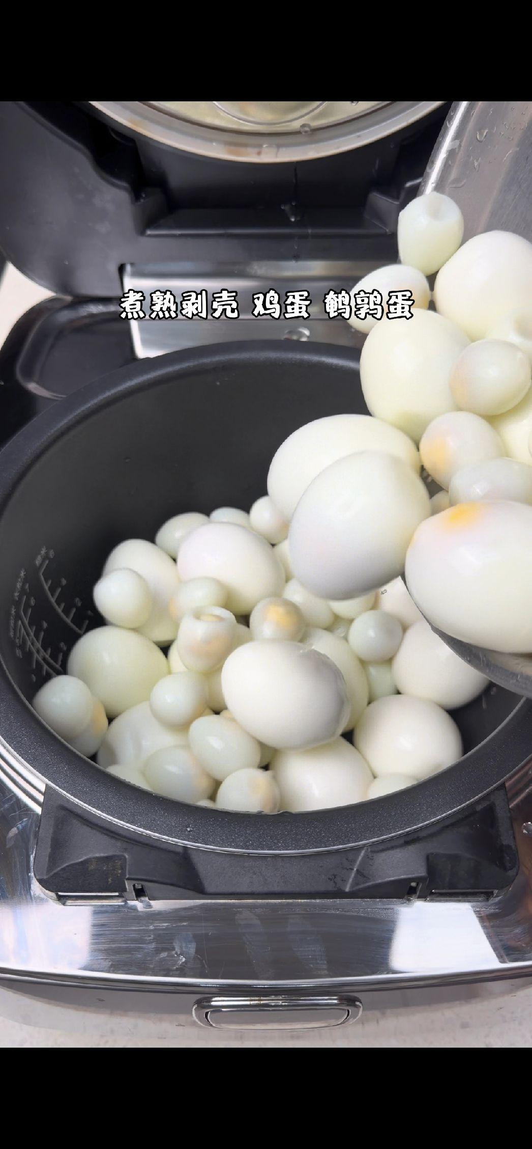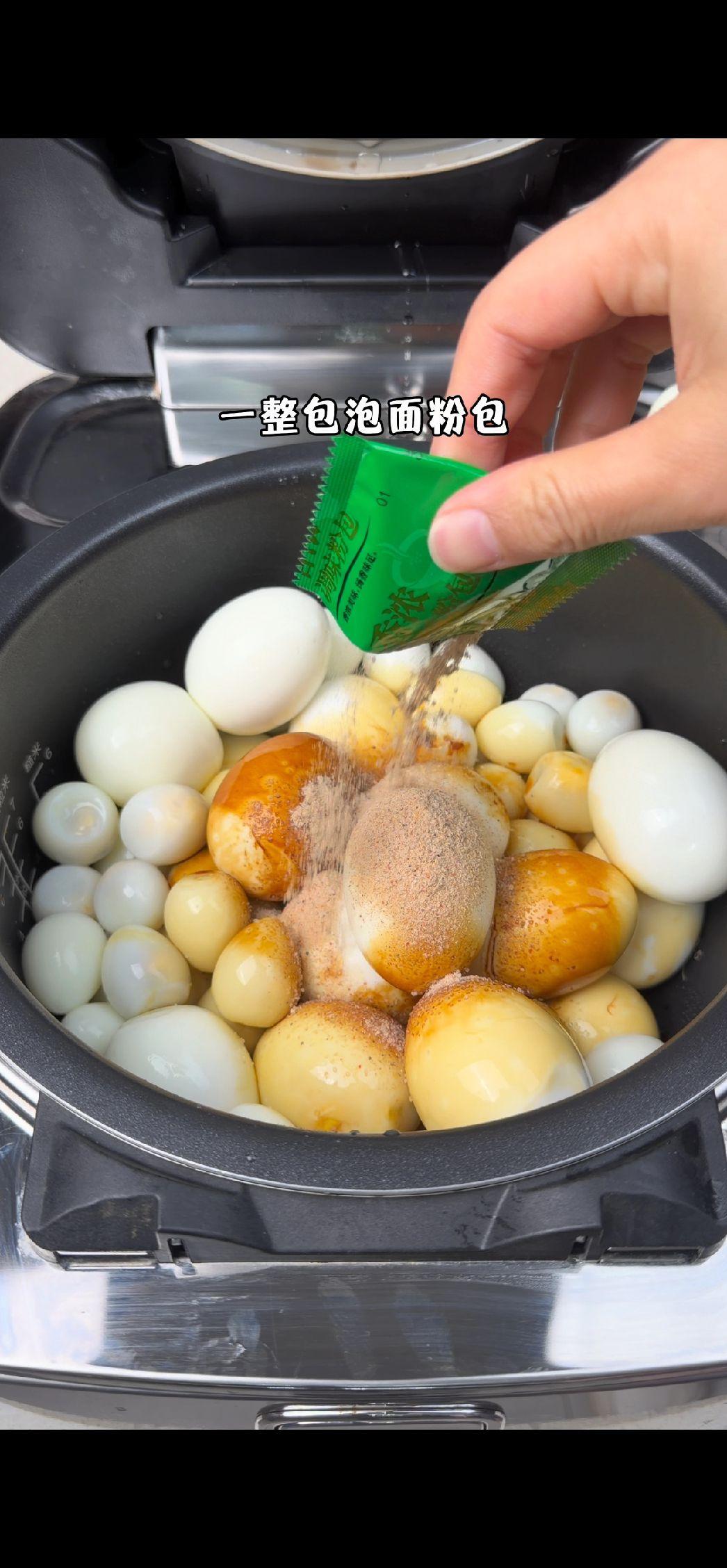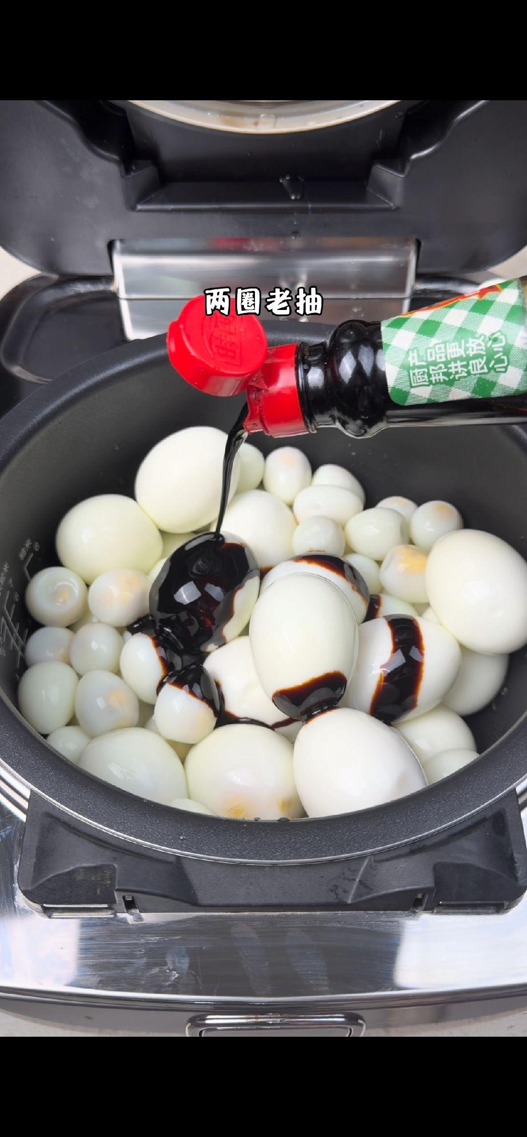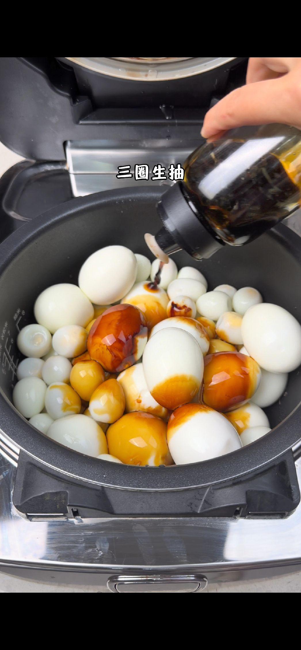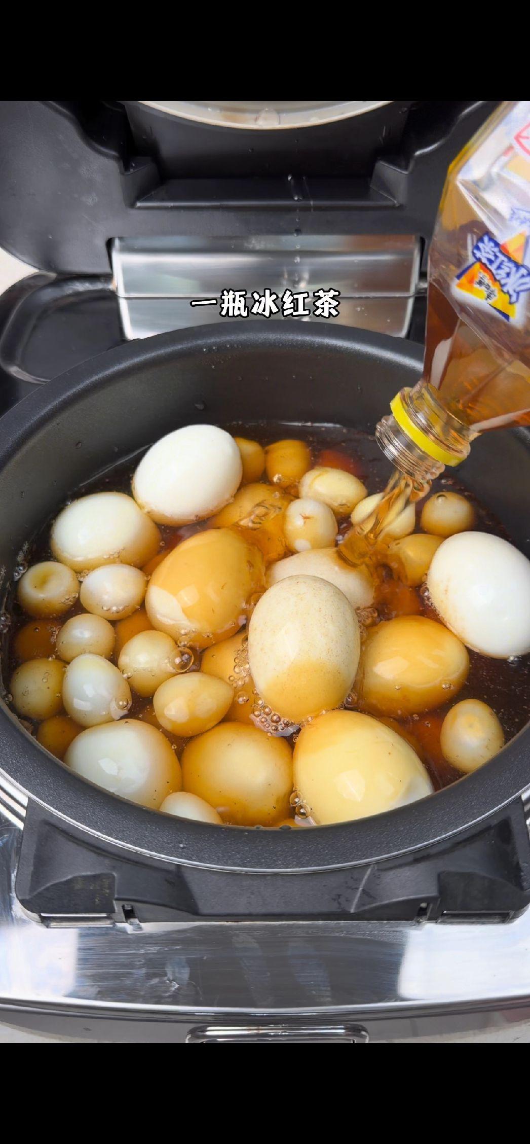 2️⃣制作卤汁:把剥壳的蛋放进电饭煲,倒入两圈老抽、三圈生抽、一包泡面粉包,再倒一瓶冰红茶进去,水刚好没过蛋就行~盖上盖子按煮饭键,等跳键后再按一次煮饭键,这样煮两遍更入味~
