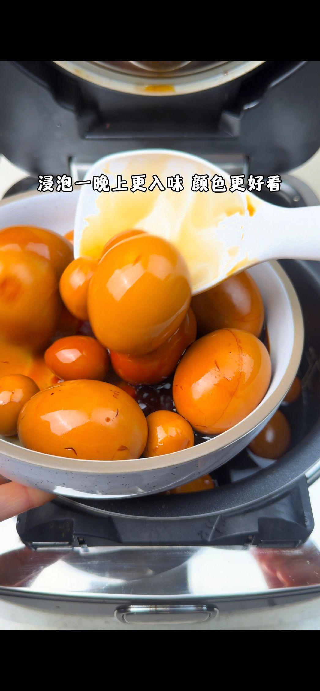 3️⃣出锅浸泡:煮好后焖一会儿,等蛋放凉,连汤带蛋一起泡进密封容器,放冰箱冷藏一晚上。第二天拿出来,QQ弹弹的,咸香入味,颜色也是复古的乡巴佬红!