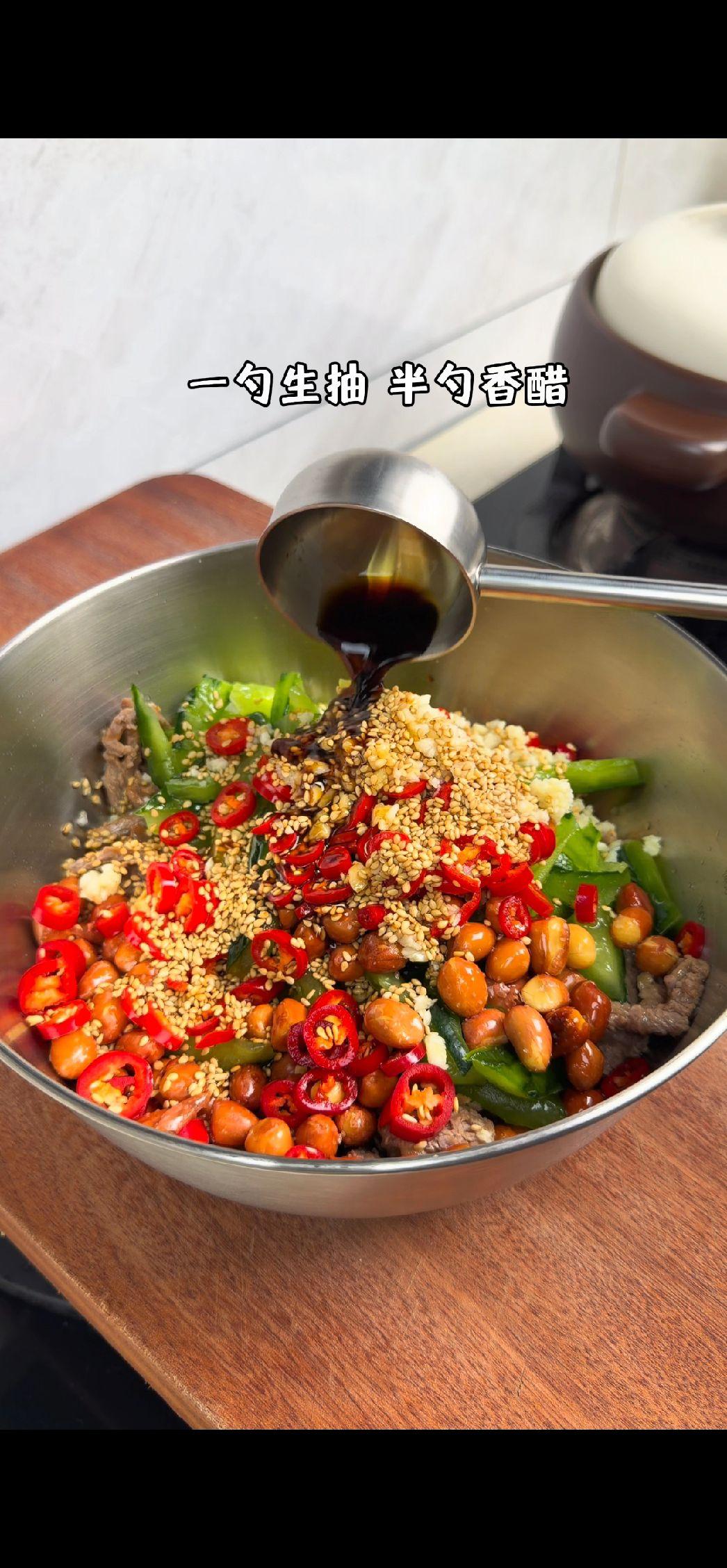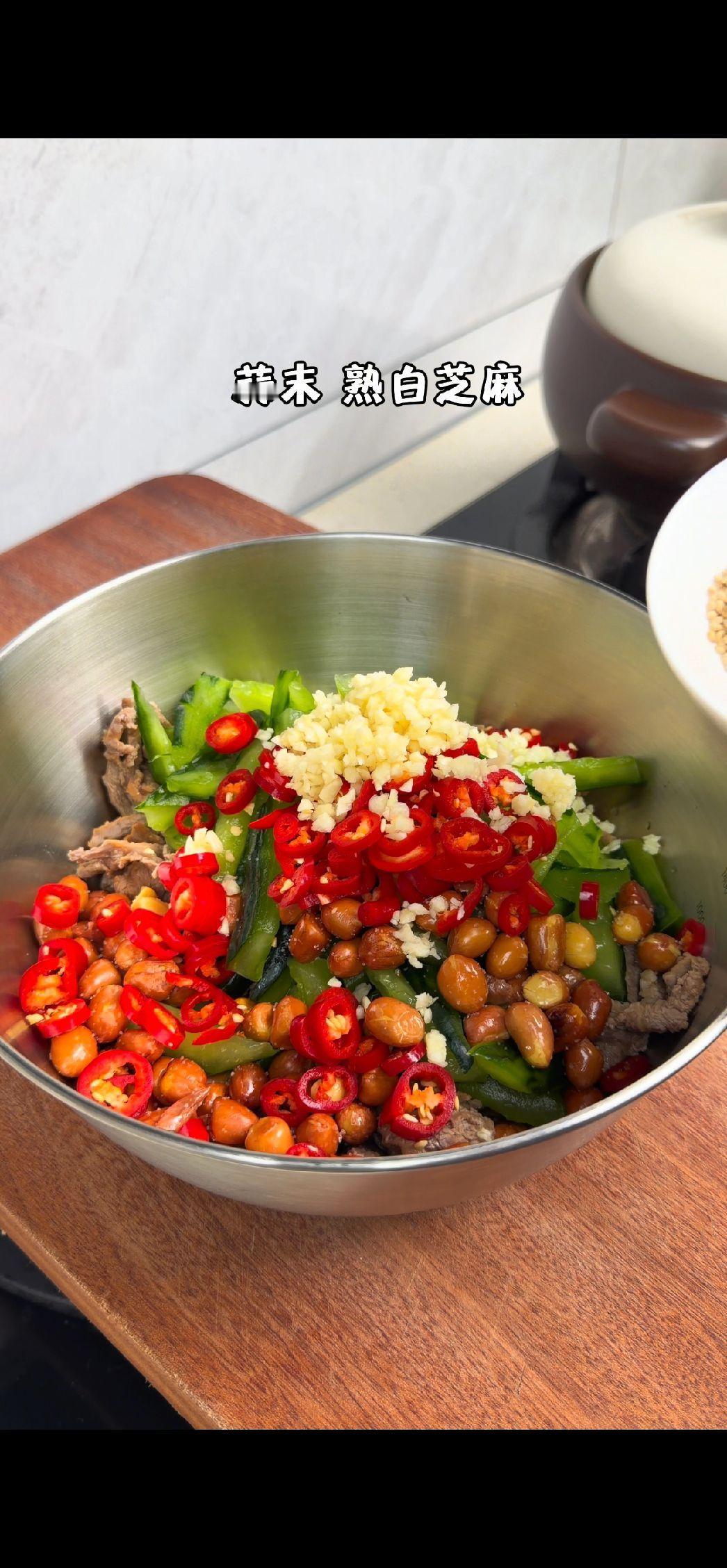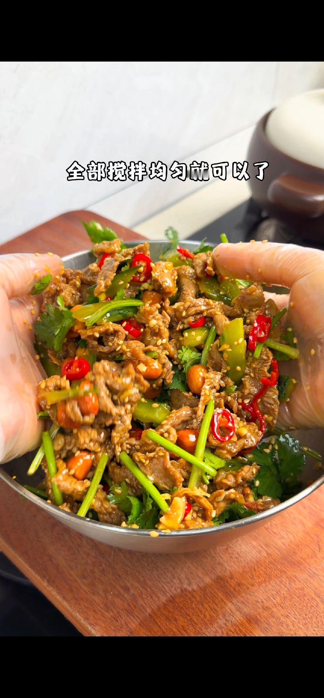 3️⃣混合拌匀:把放凉的牛肉和所有配菜放一起,淋上料汁,加几片生菜,全部拌匀就能开吃啦!牛肉滑嫩不柴,下酒又下饭,好吃到停不下来~