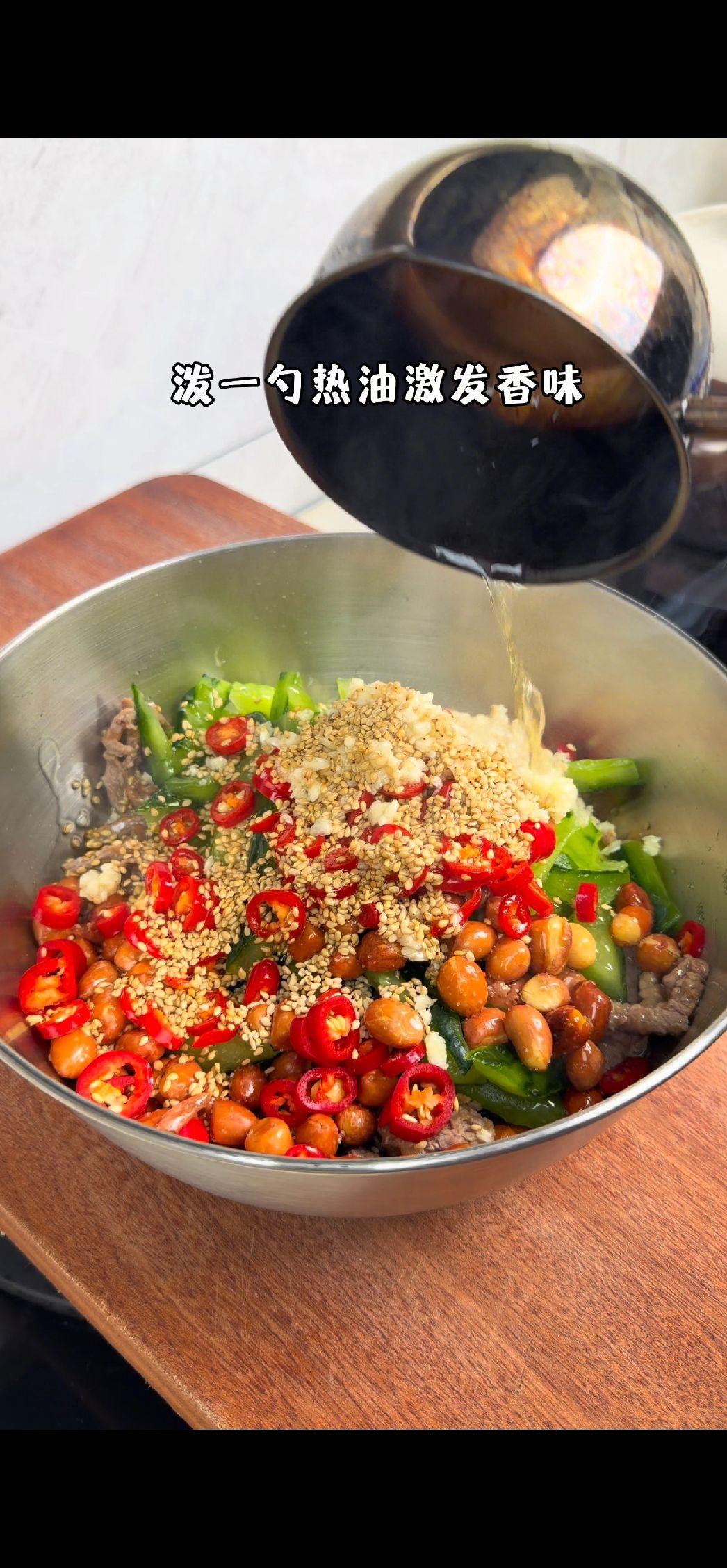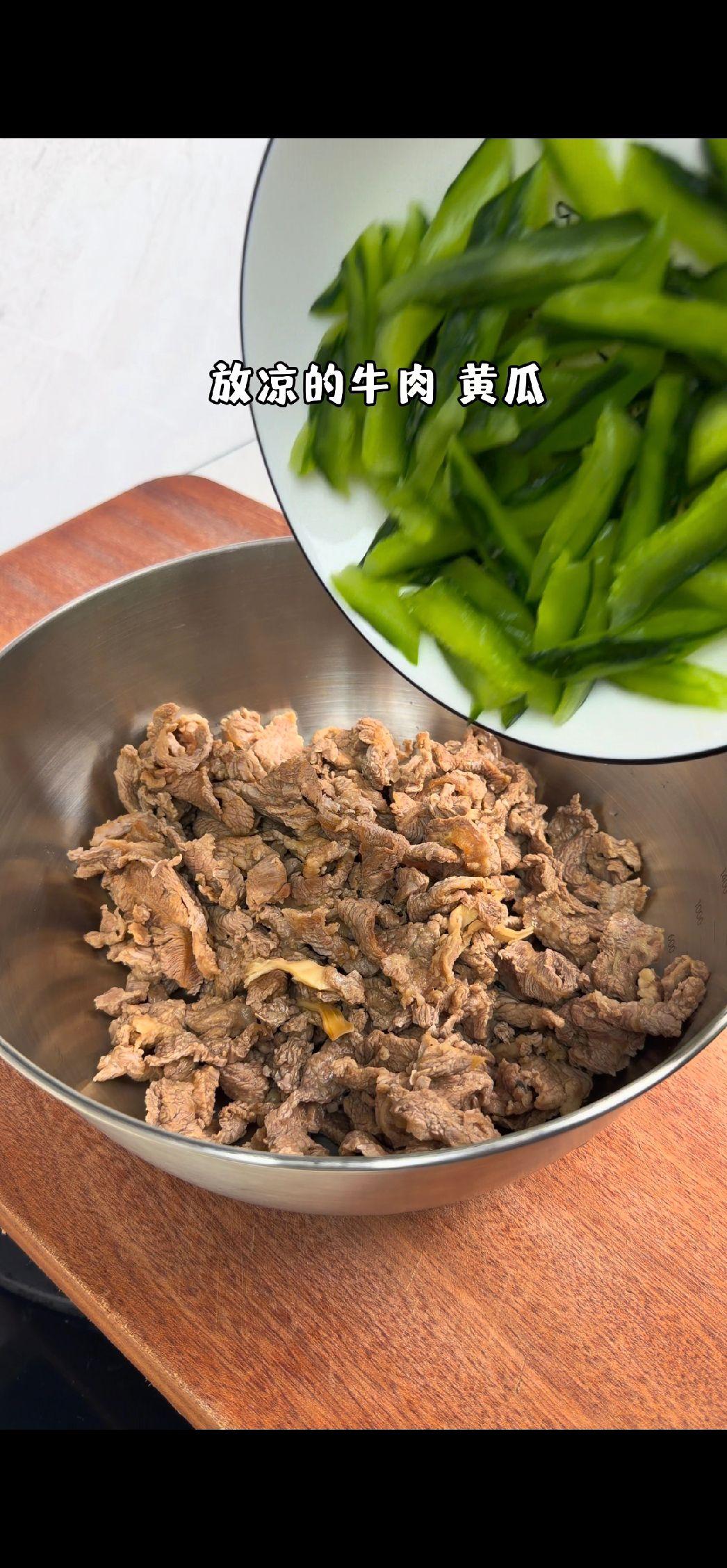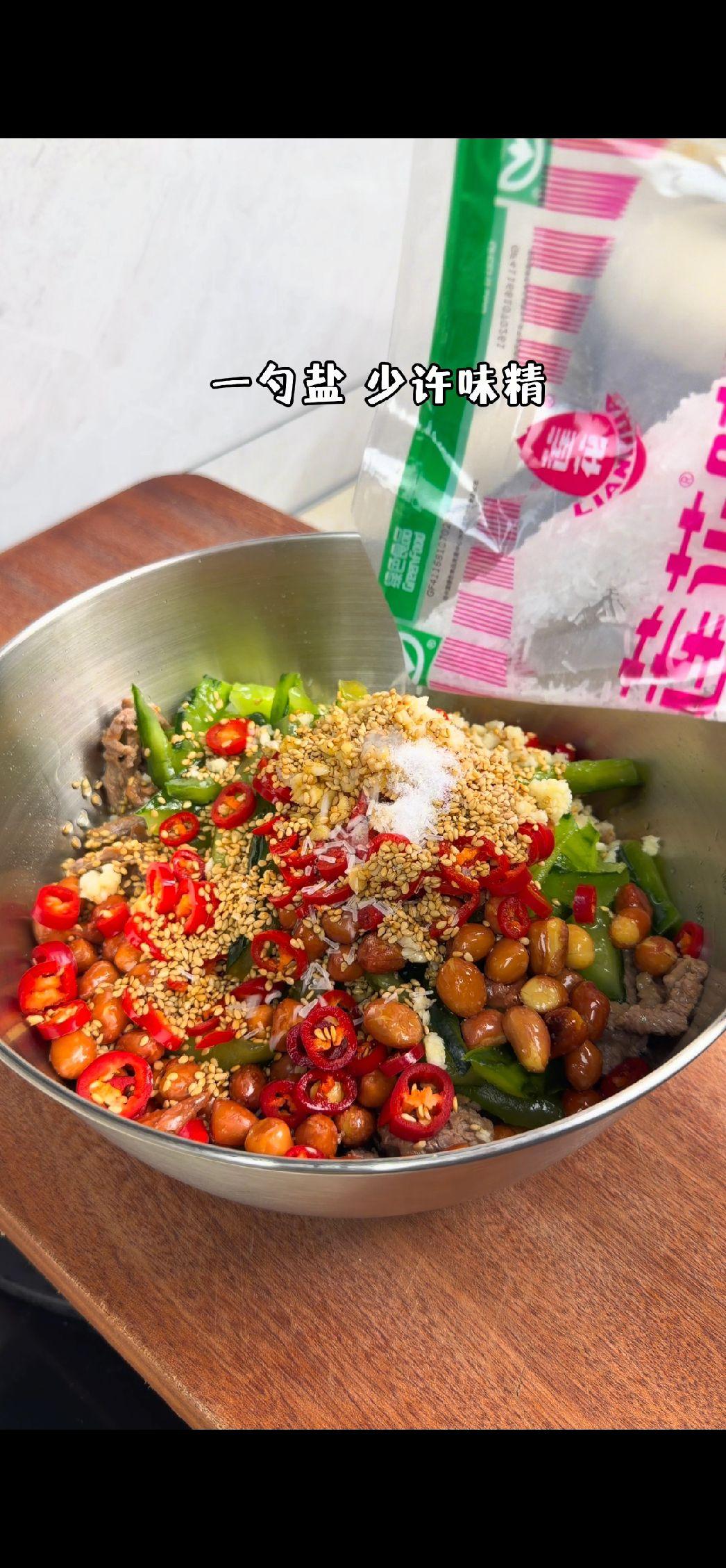 3️⃣混合拌匀:把放凉的牛肉和所有配菜放一起,淋上料汁,加几片生菜,全部拌匀就能开吃啦!牛肉滑嫩不柴,下酒又下饭,好吃到停不下来~