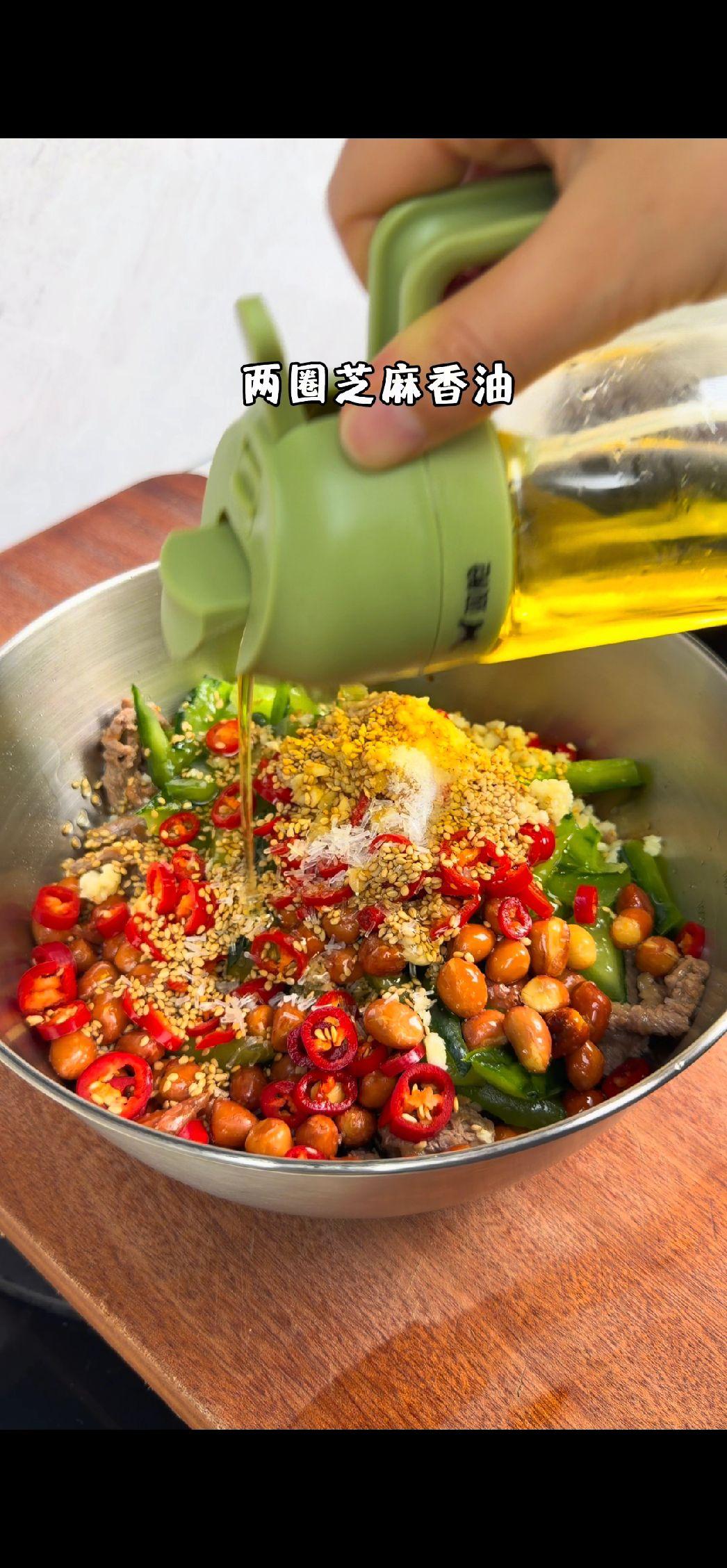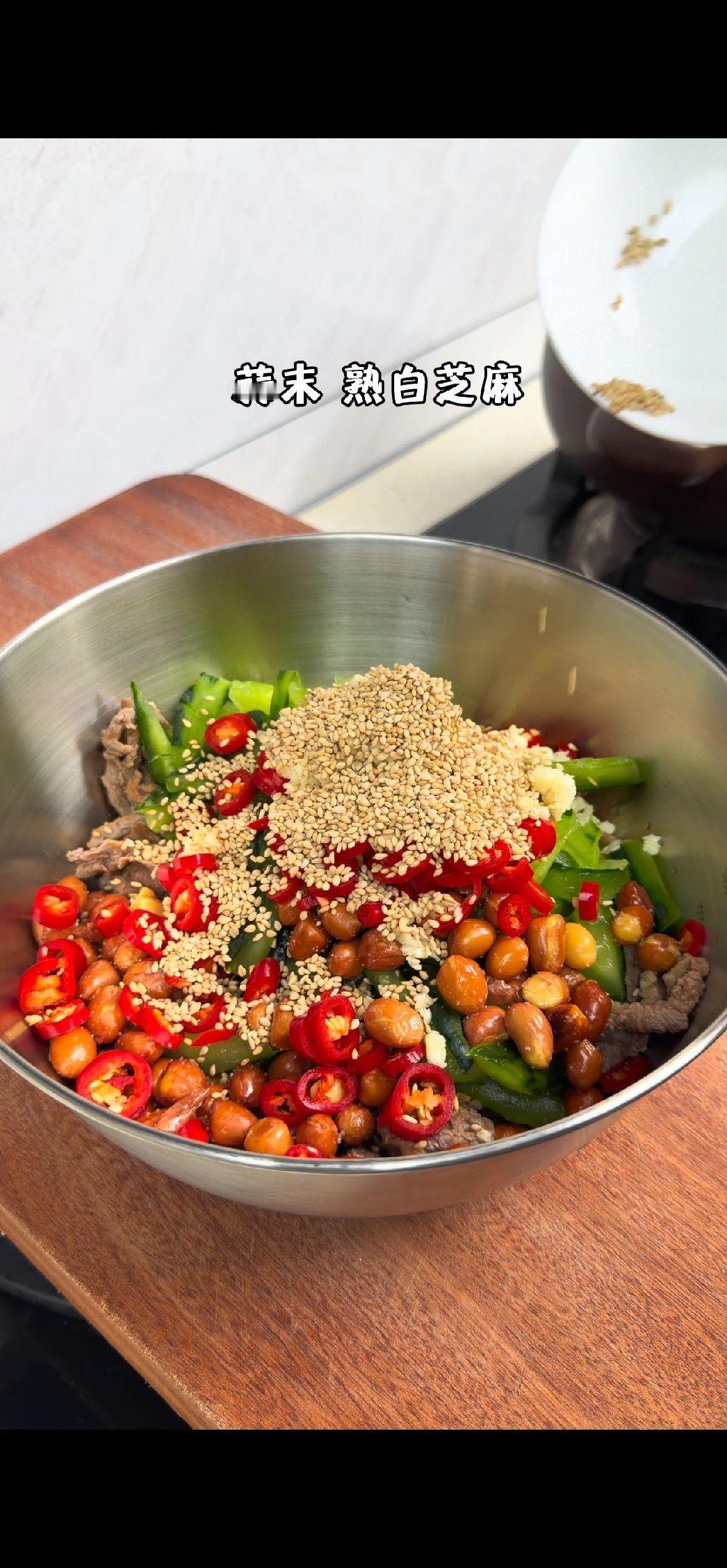 2️⃣准备配菜和调料:黄瓜、花生米、小米辣、蒜末、熟白芝麻都切好/备好,泼一勺热油激香蒜末,再调灵魂料汁:一勺生抽+半勺香醋+一勺盐+少许味精+两圈芝麻香油,搅拌均匀~