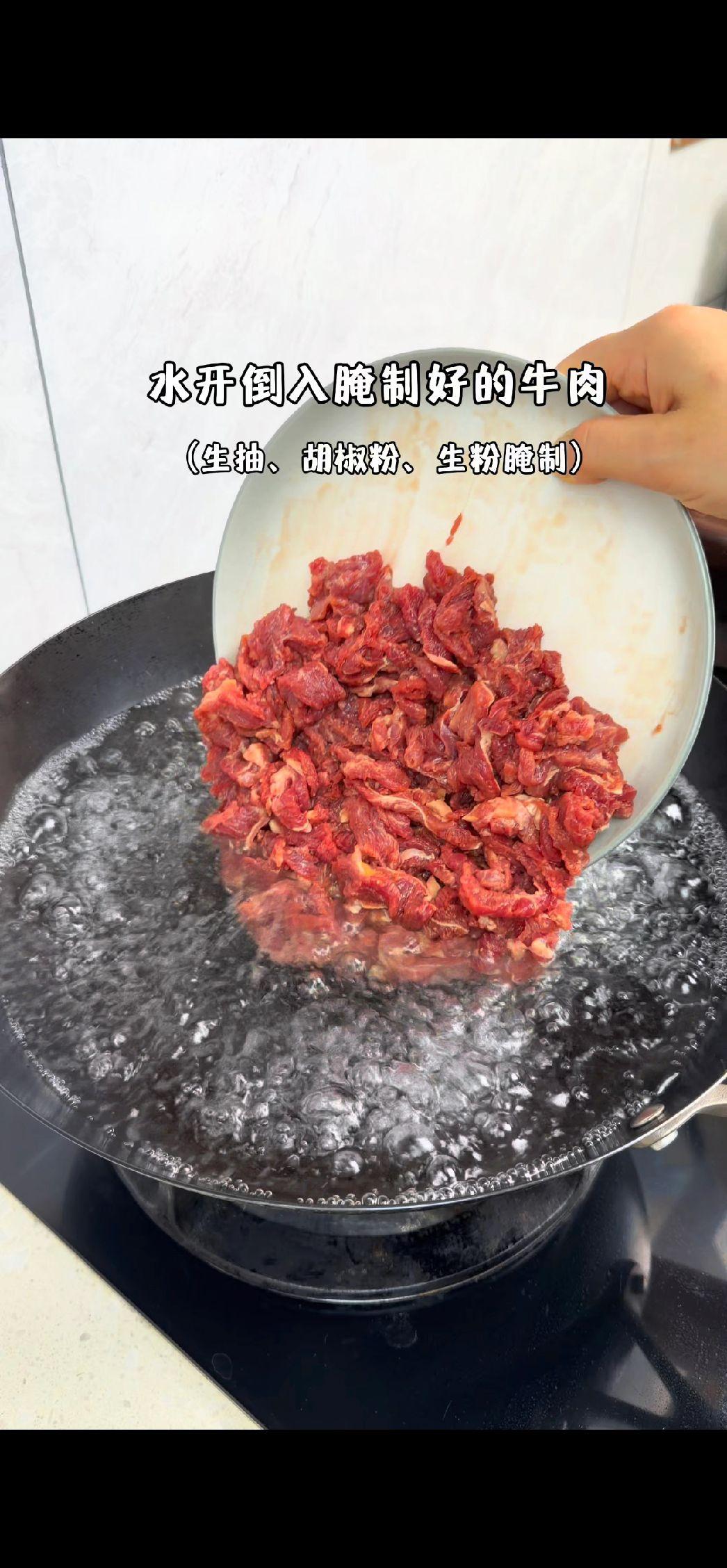 1️⃣处理牛肉:先把牛肉用生抽、胡椒粉、生粉腌制10分钟(这样更入味滑嫩),水开后倒入牛肉,大火烫1分钟捞出放凉,口感绝了~