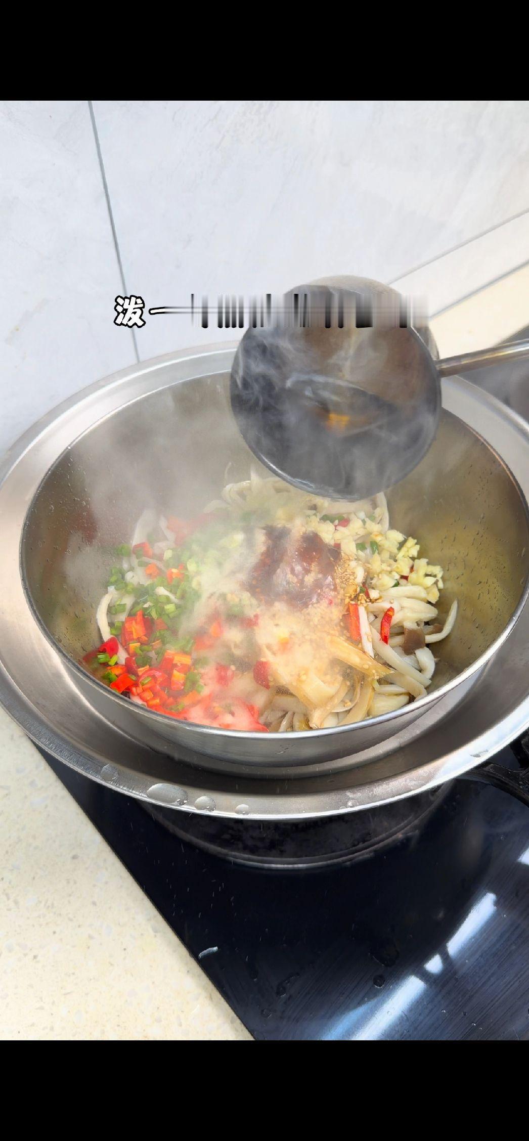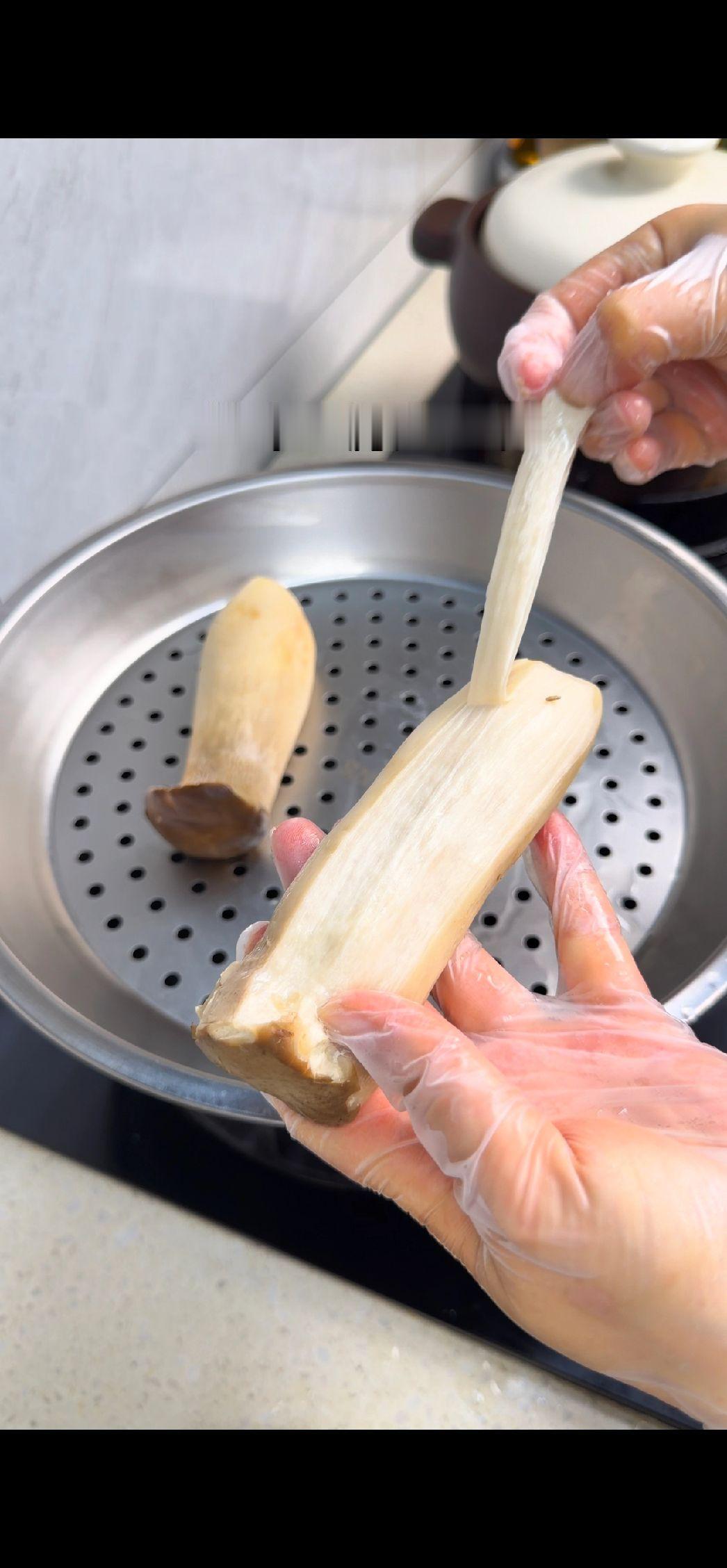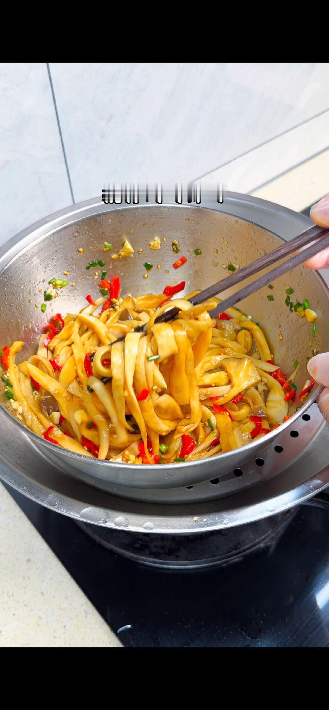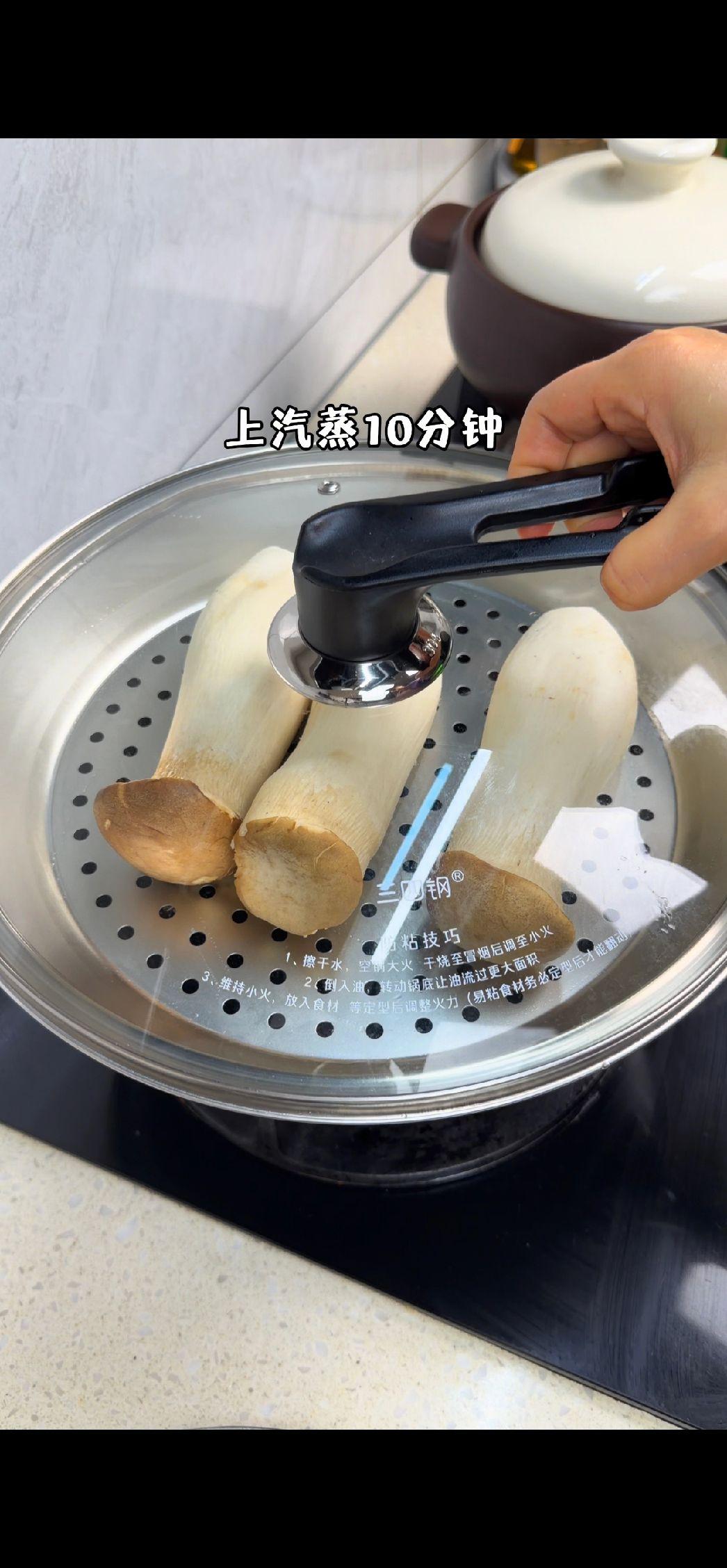 1️⃣处理食材:把杏鲍菇洗净,上汽蒸10分钟,蒸好后放凉撕成细条。红辣椒、葱蒜末