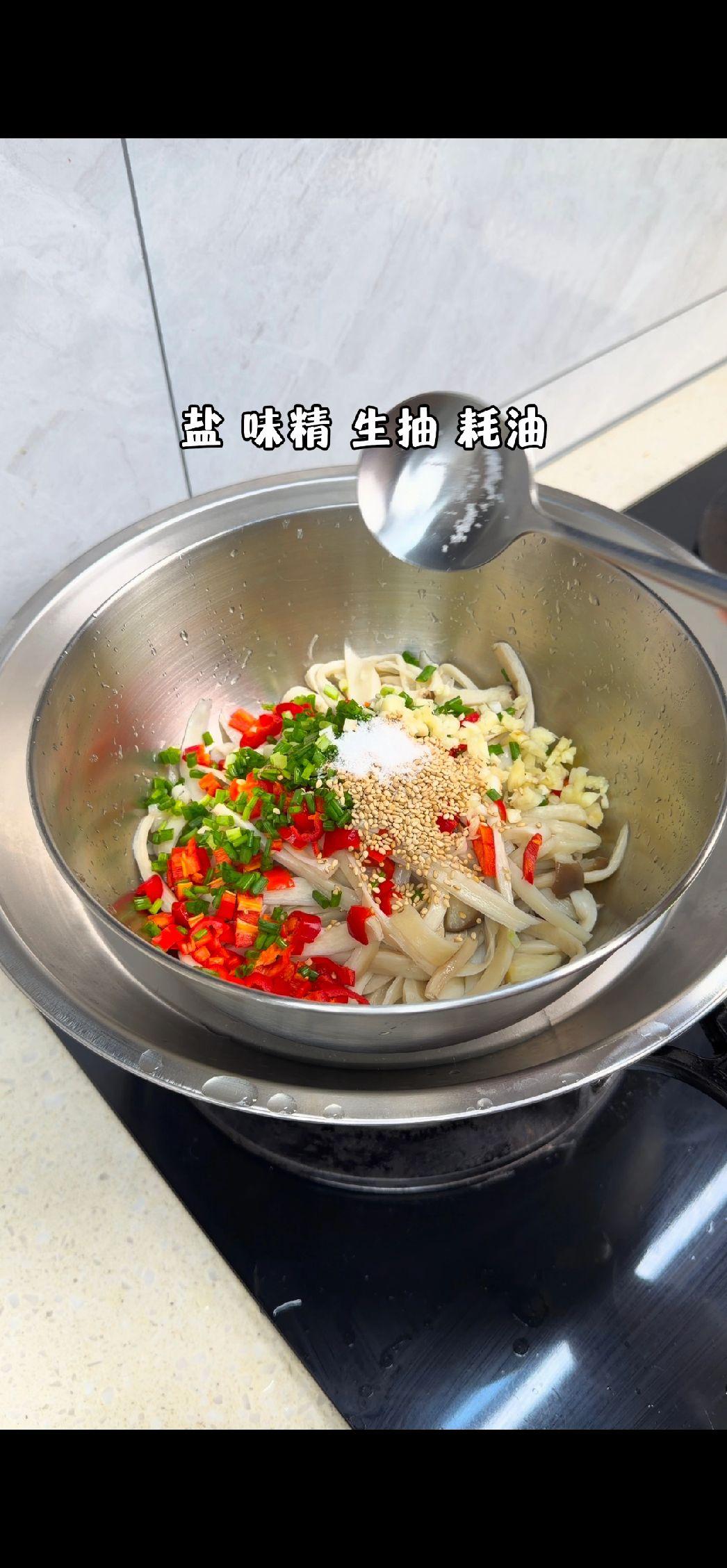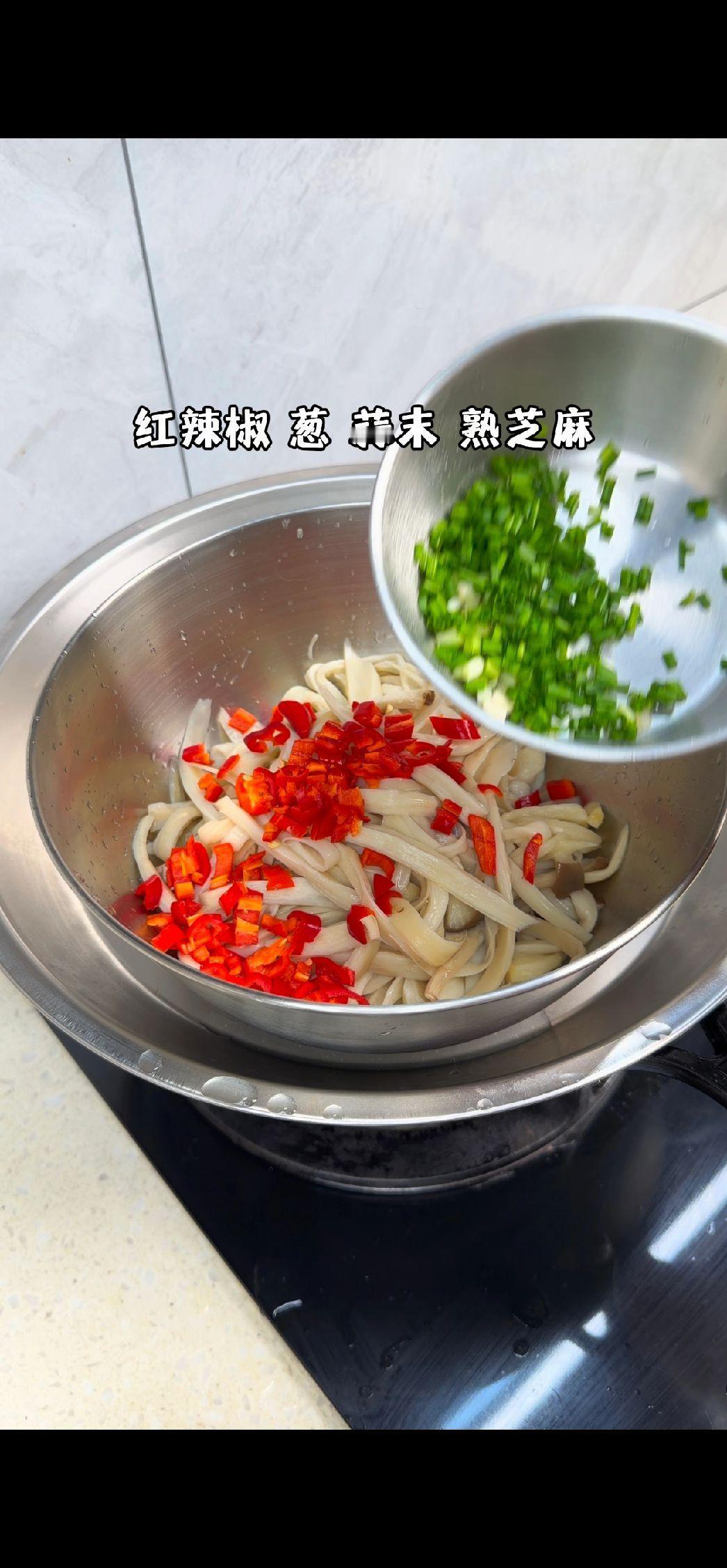 1️⃣处理食材:把杏鲍菇洗净,上汽蒸10分钟,蒸好后放凉撕成细条。红辣椒、葱蒜末和熟芝麻准备好。