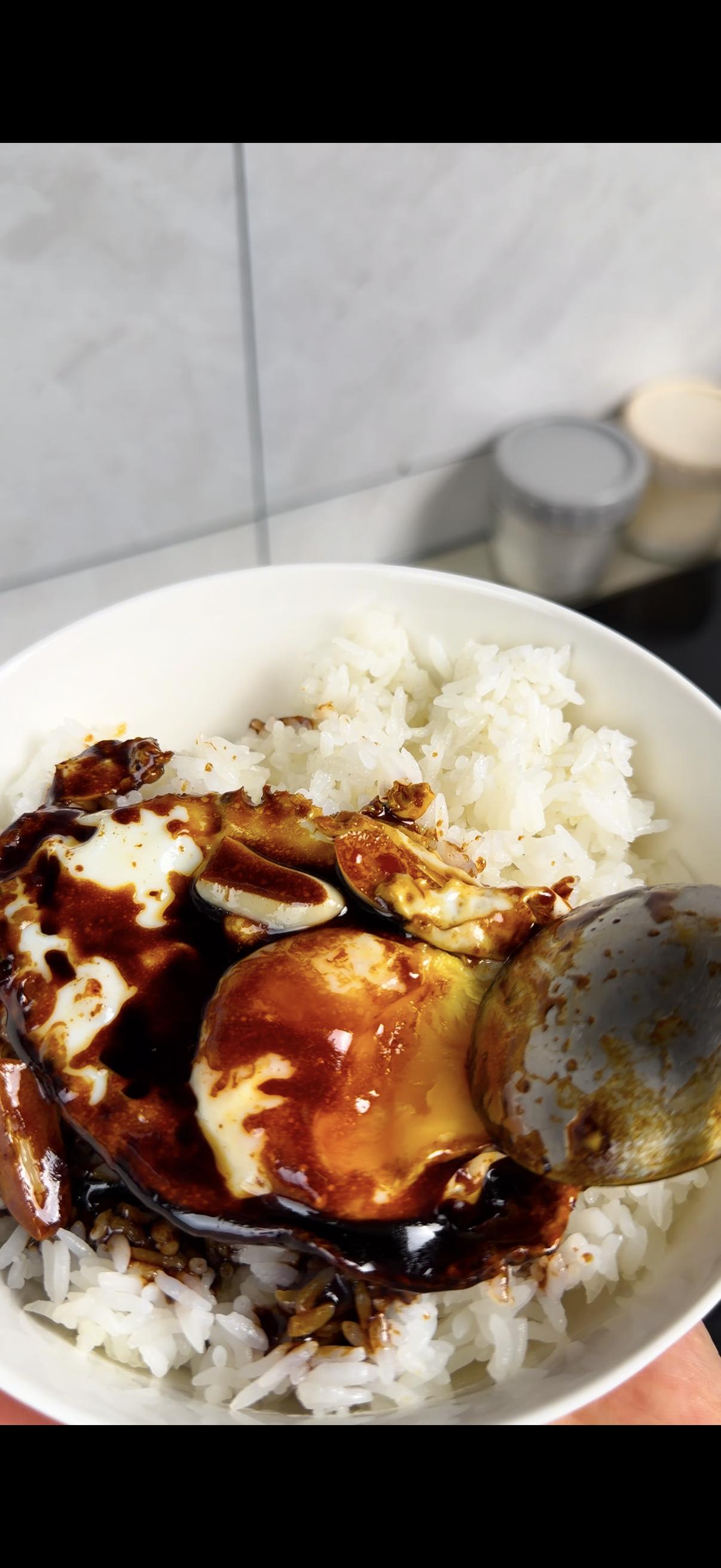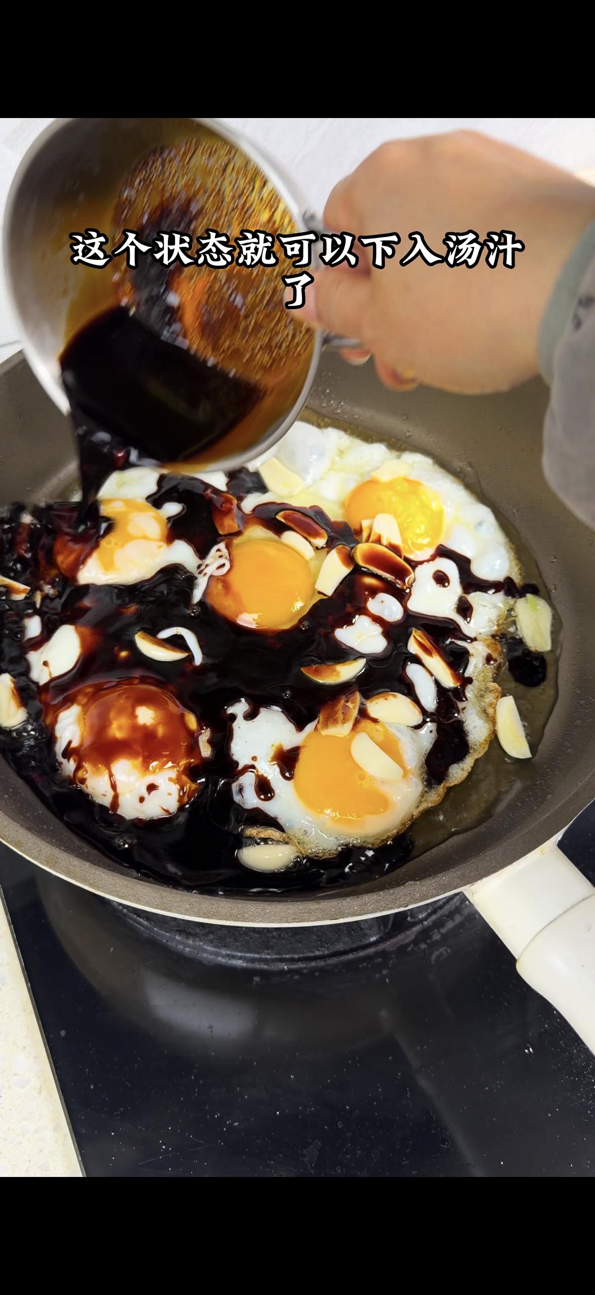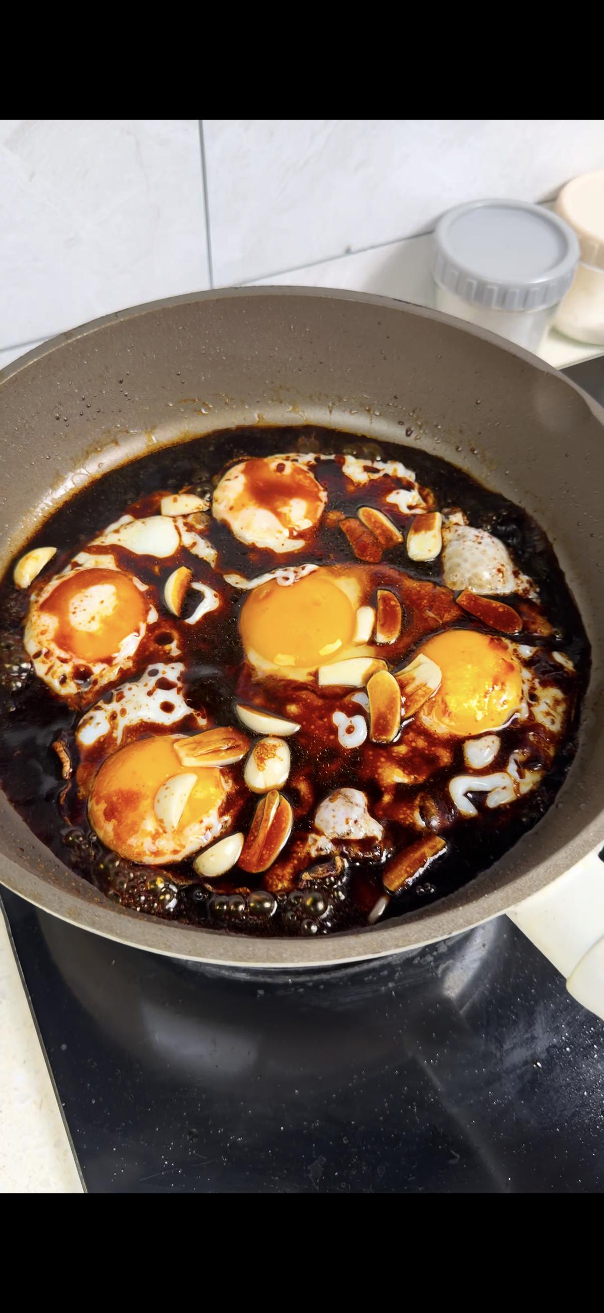 3️⃣炒煮收汁:大蒜爆香后倒入料汁,加小半碗水,煮至汤汁浓稠,再把炸好的鸡蛋放进去翻滚裹匀,就可以出锅啦~