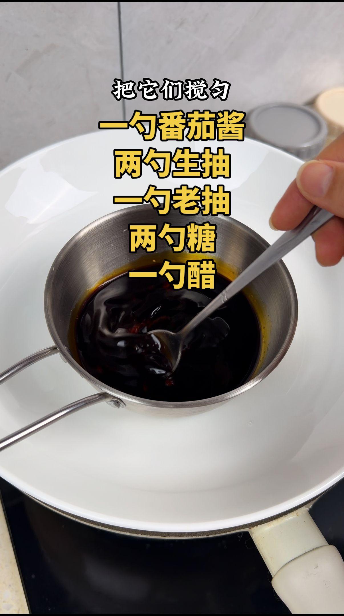 2️⃣调料汁:一勺番茄酱+一勺生抽+一勺老抽+两勺白糖+一勺白醋,搅匀备用。