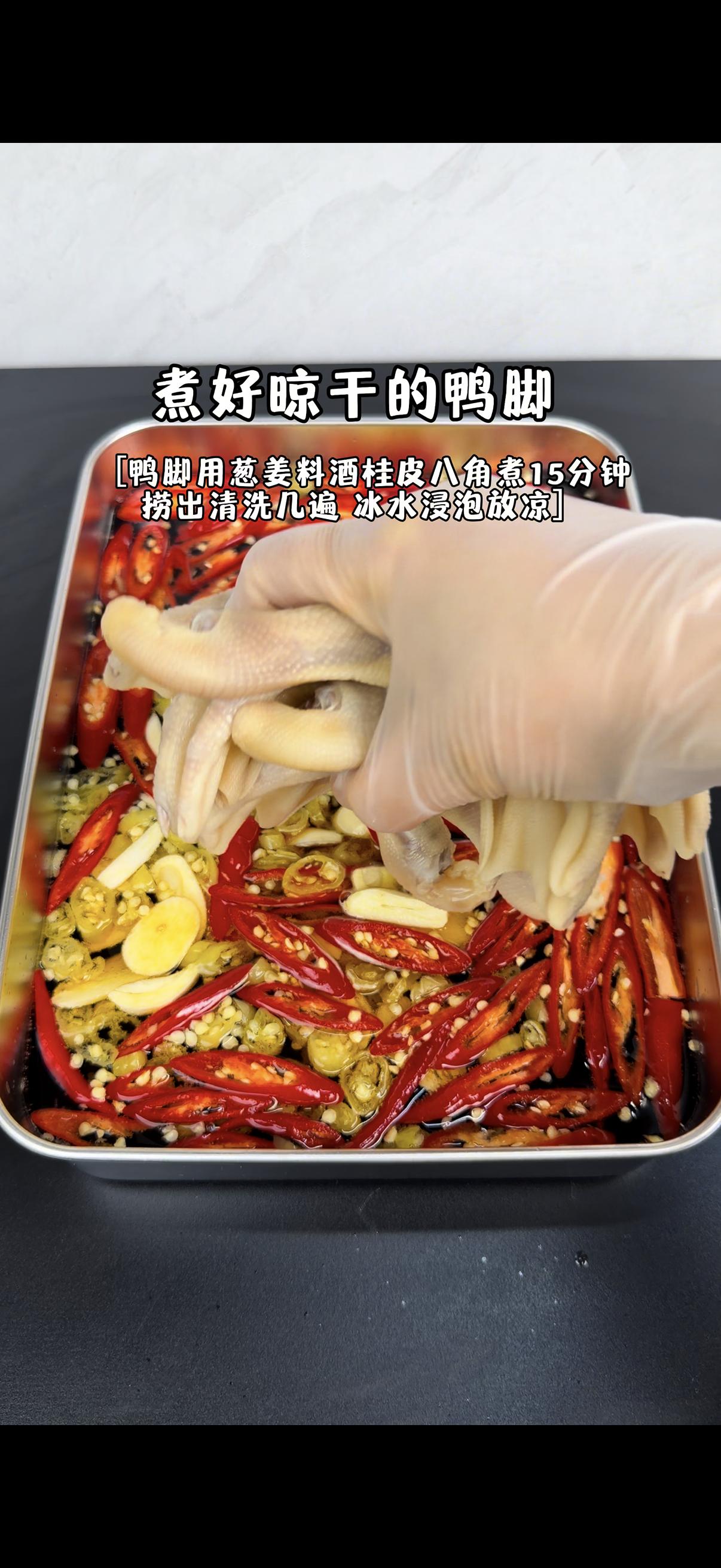 1️⃣处理鸭脚:鸭脚冷水下锅,加葱姜料酒、桂皮八角,煮15分钟捞出。用冰水浸泡放凉,口感更Q弹。