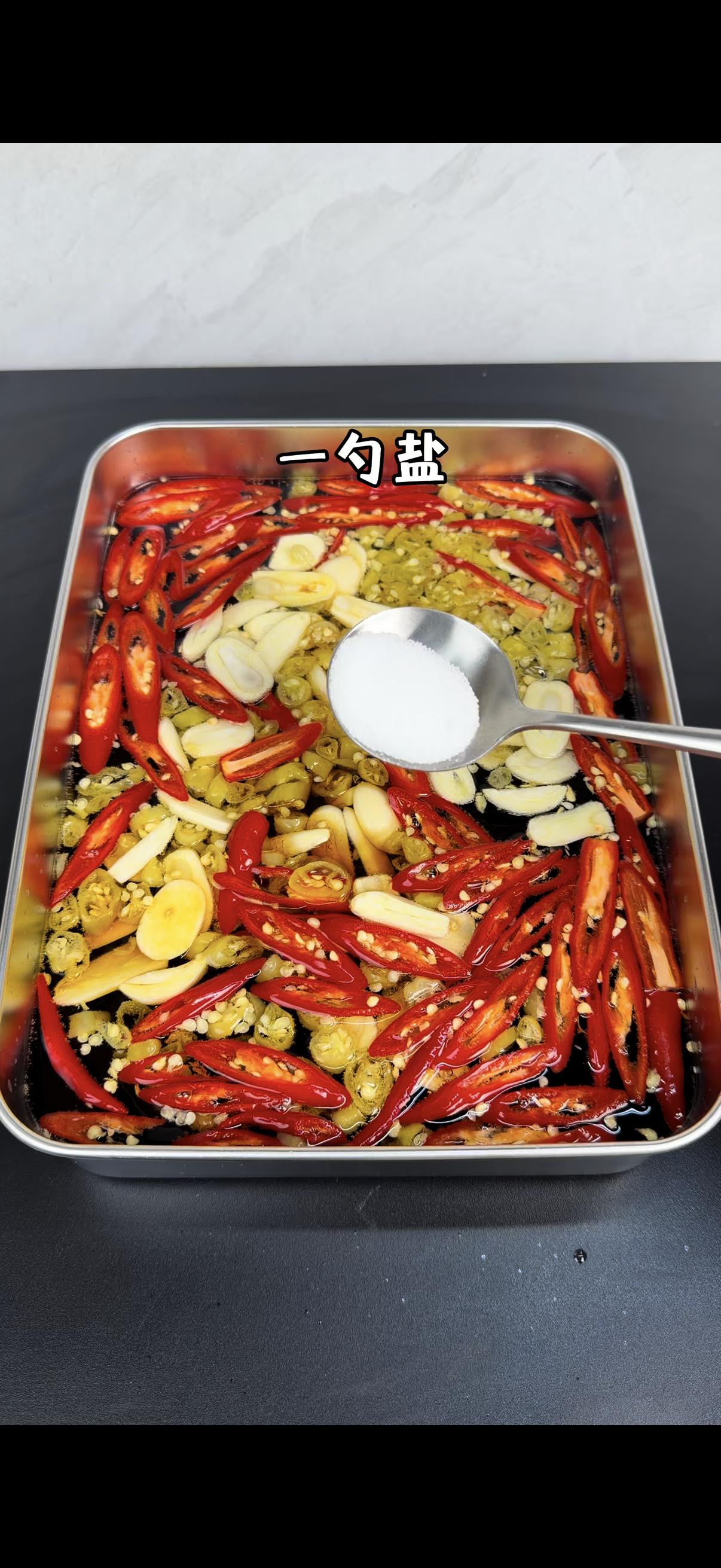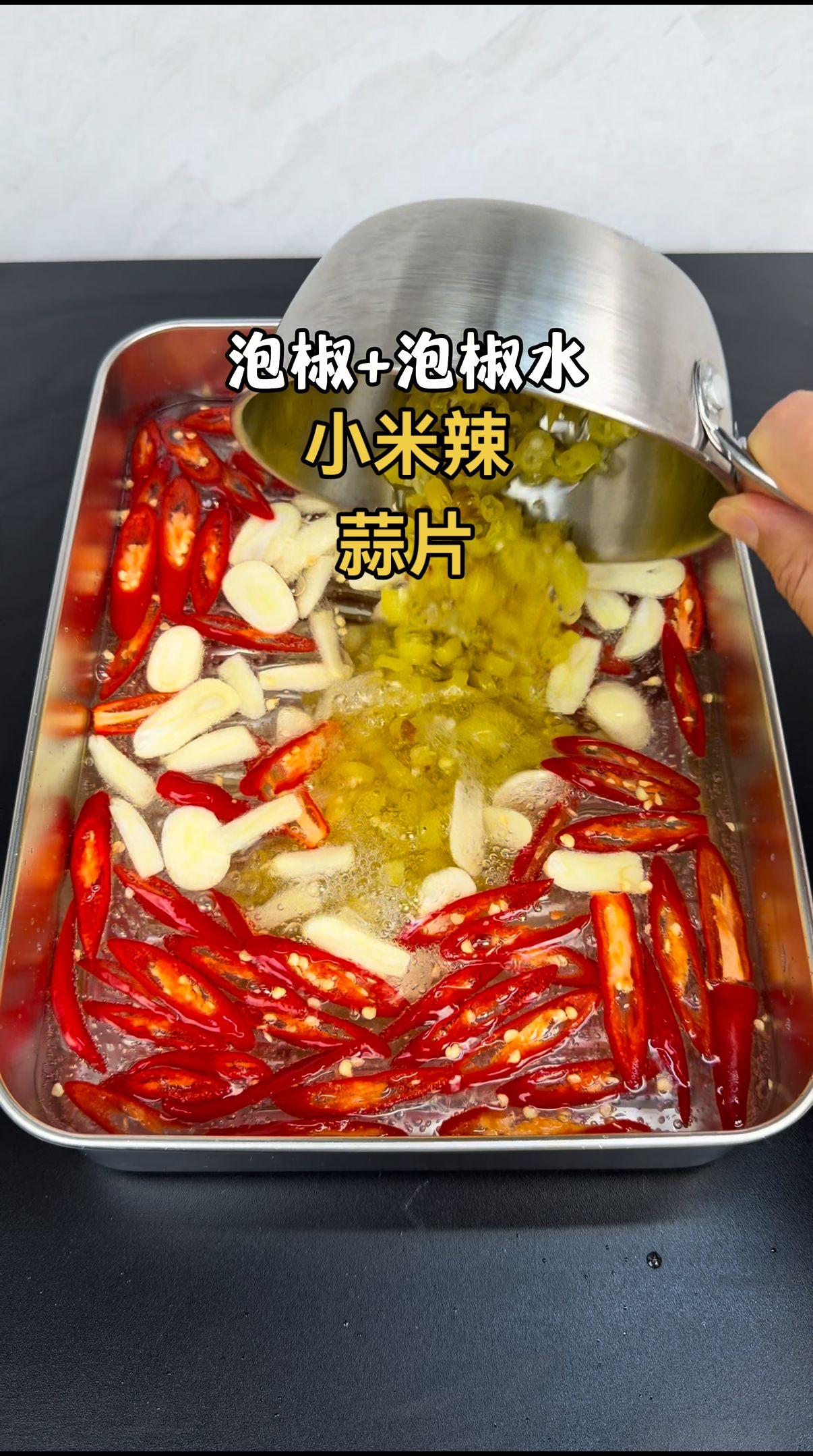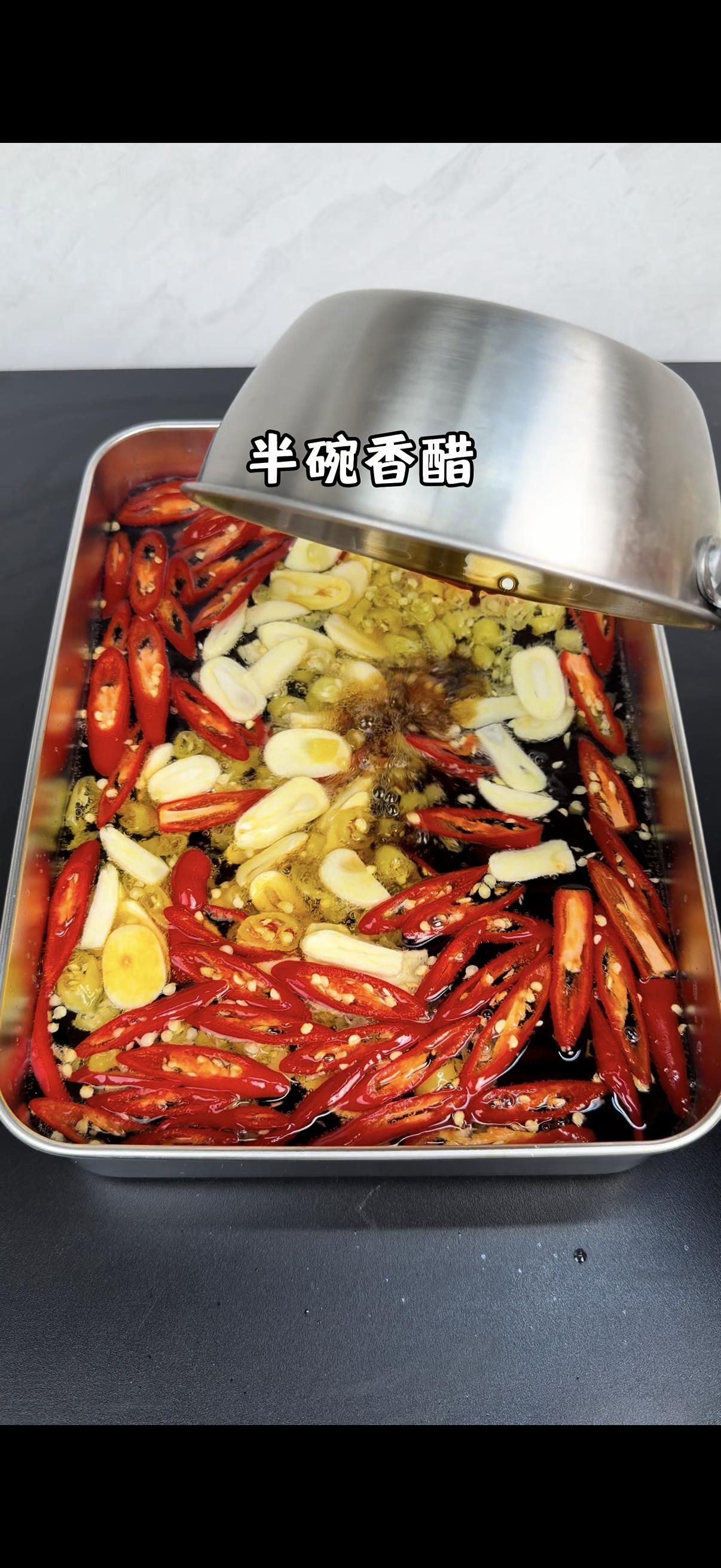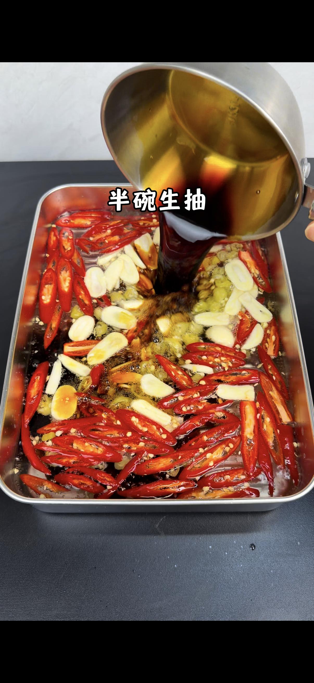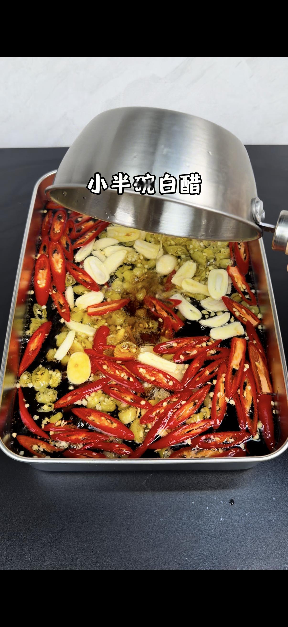 2️⃣调配料汁:半碗生抽+半碗香醋+一勺盐+十三颗冰糖+小米辣+大蒜片+泡椒+泡椒水,搅拌均匀。