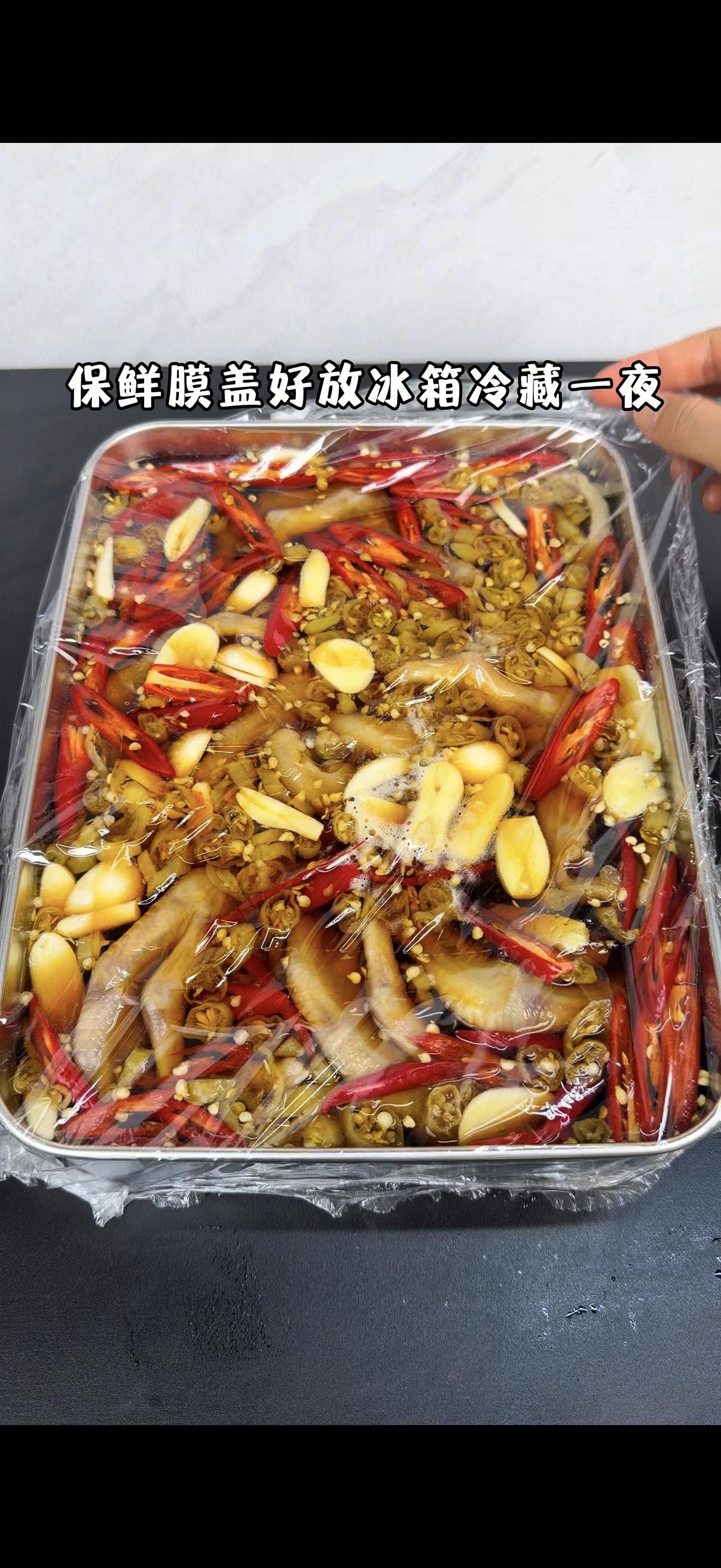 3️⃣腌制入味:把处理好的鸭脚放进料汁里,保鲜膜盖好放冰箱冷藏一夜。