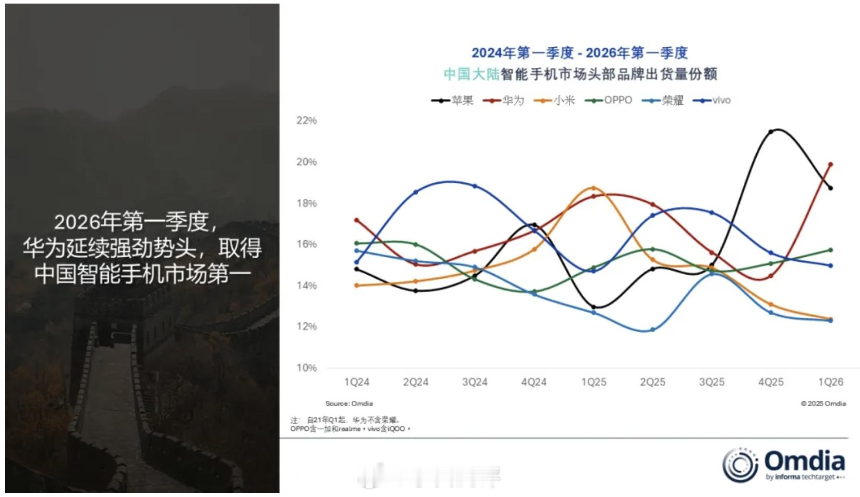 Q1中国大陆智能手机出货量TOP5出炉:❶华为 约1390万台,20%份额,同比+7%;❷苹果 约1310万台,19%份额,同比+42%;❸OPPO(含一加和realme) 约1100万台,16%份额,同比-3%;❹vivo(含iQOO) 约1050万台,15%份额,基本持平;❺小米(含REDMI) 约870万台,12%份额,同比-35%;其它品牌合计约1270万台,18%占比,同比-7%。
