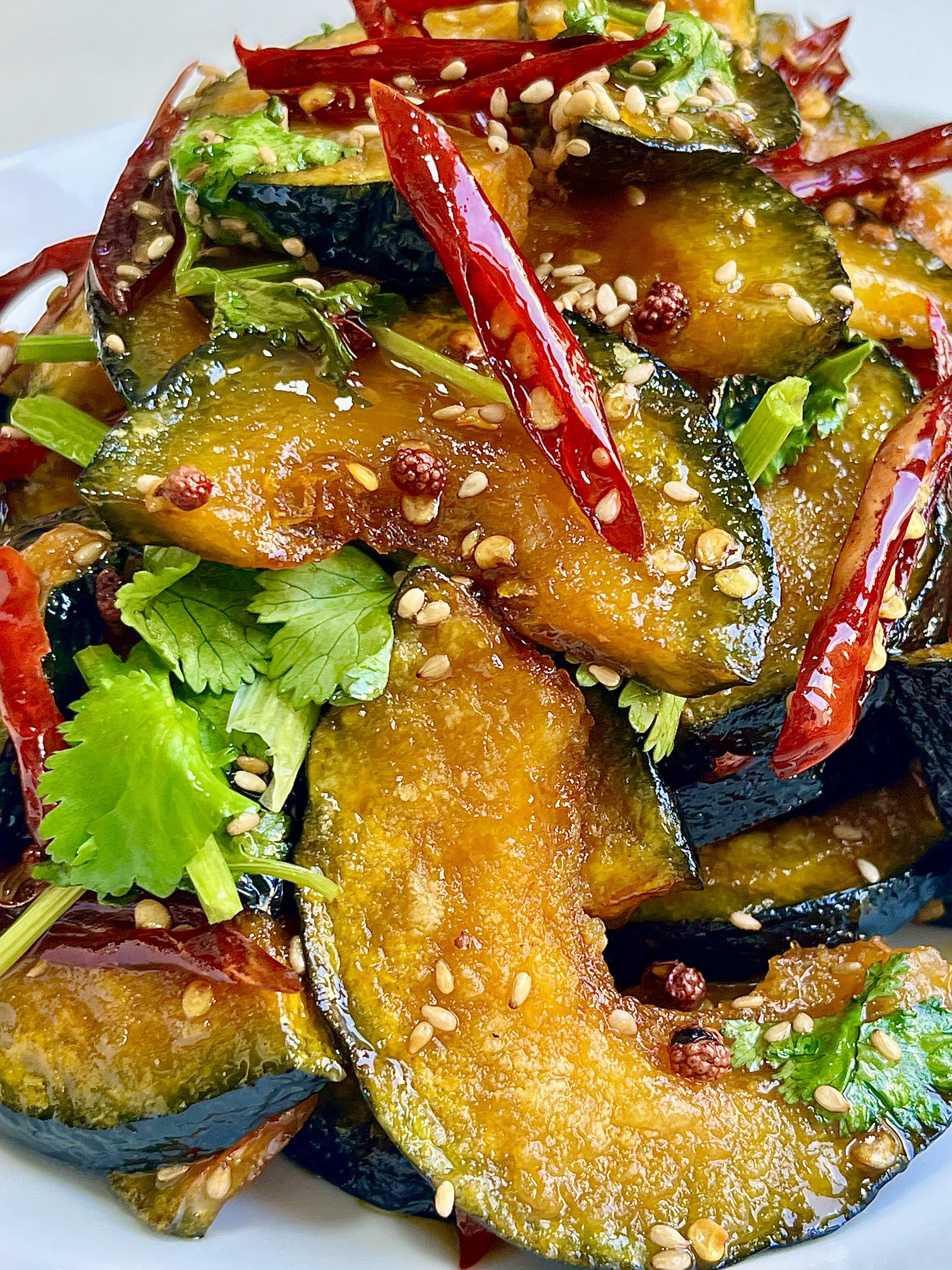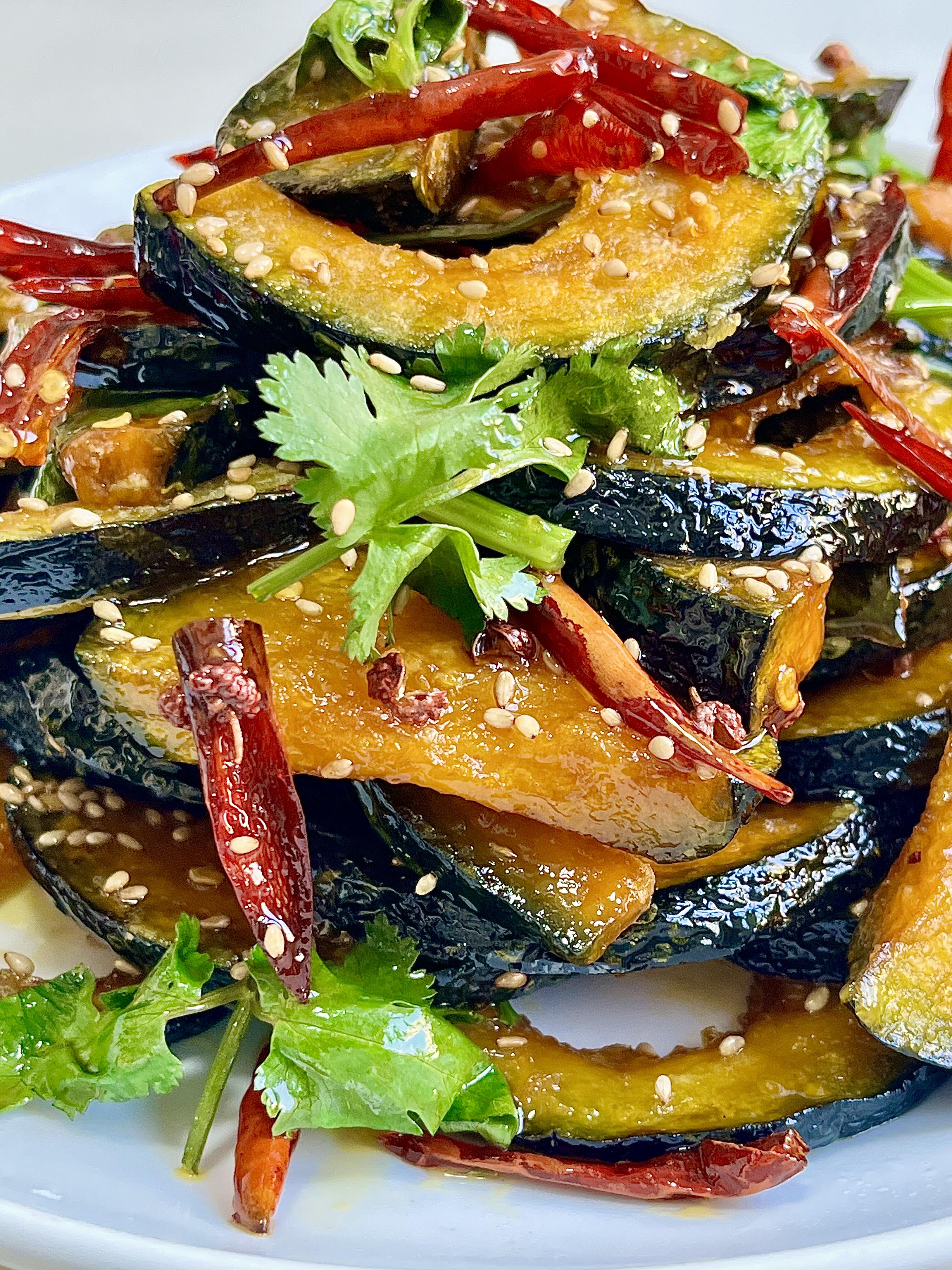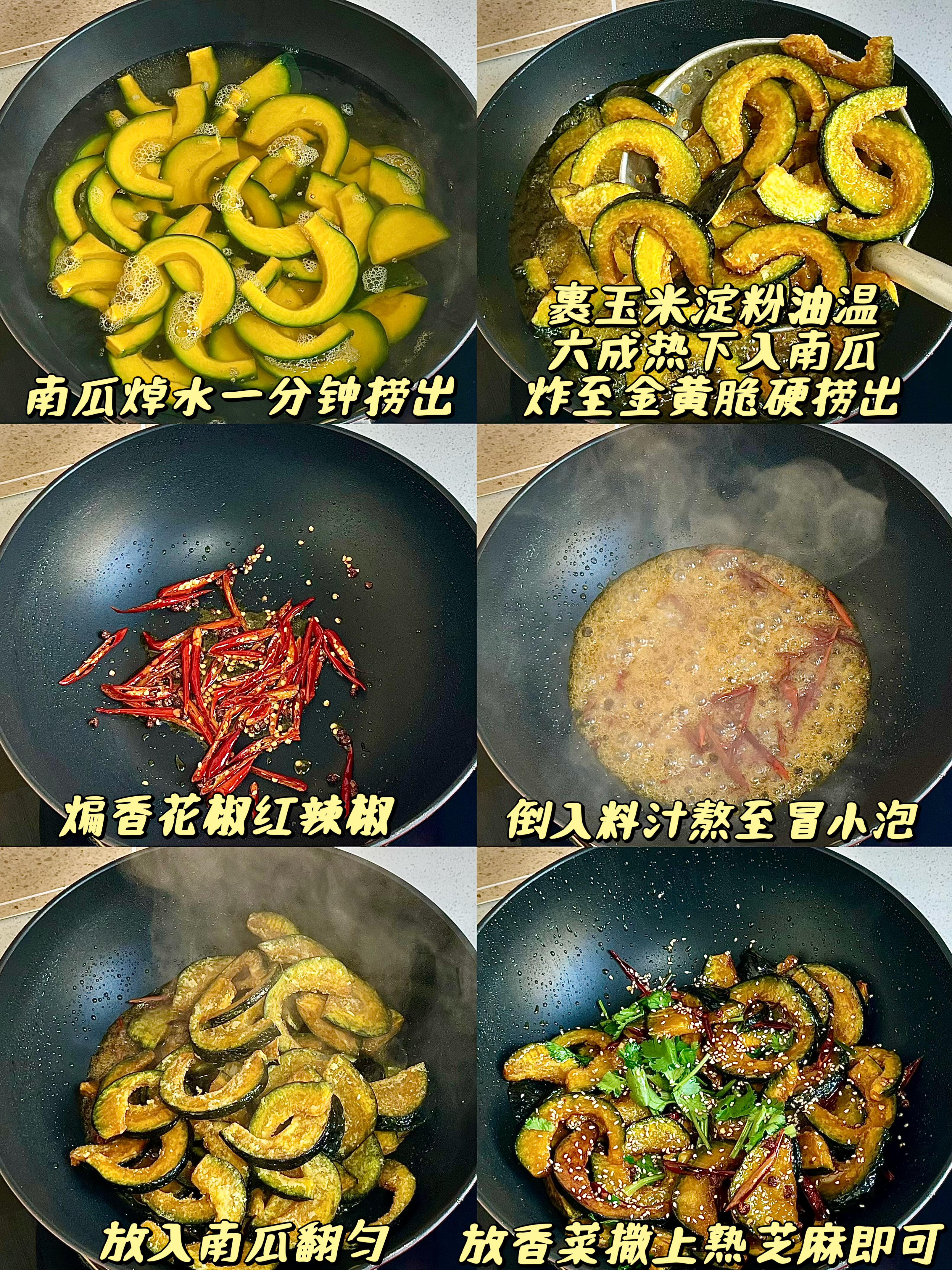 4)锅中留少许底油,放入花椒粒、红辣椒丝,小火慢慢煸出香味,倒入调好的碗汁,开小火熬至汤汁冒小泡、变得浓稠,放入炸好的南瓜片,快速翻炒均匀,让每一片南瓜都裹满料汁,最后撒上香菜和熟芝麻,就能出锅啦!