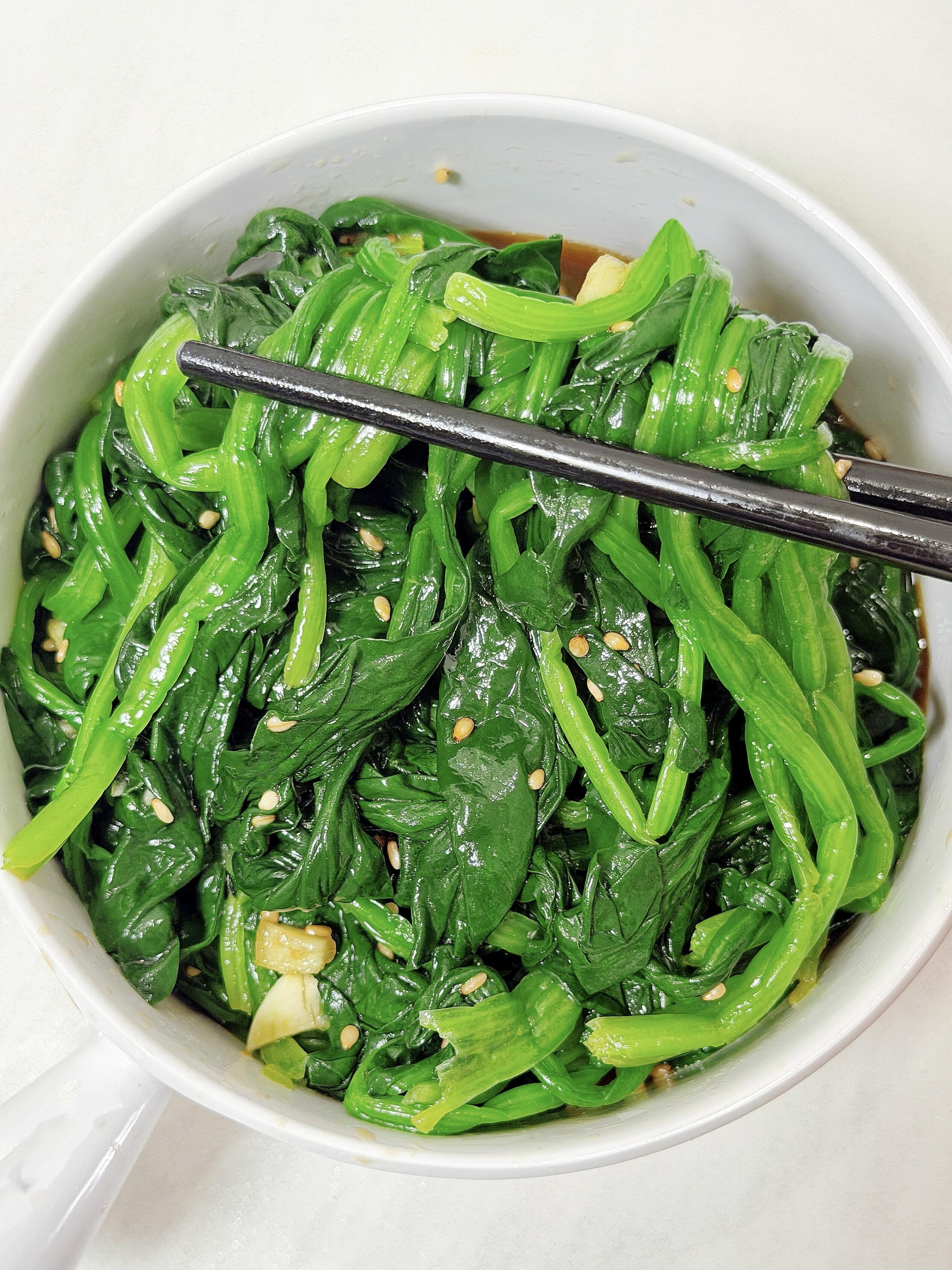 5️⃣ 把调好的料汁均匀淋在菠菜上,用筷子翻拌几下,让每一根菠菜都裹满料汁,静置2分钟更入味,直接装盘就能吃!
