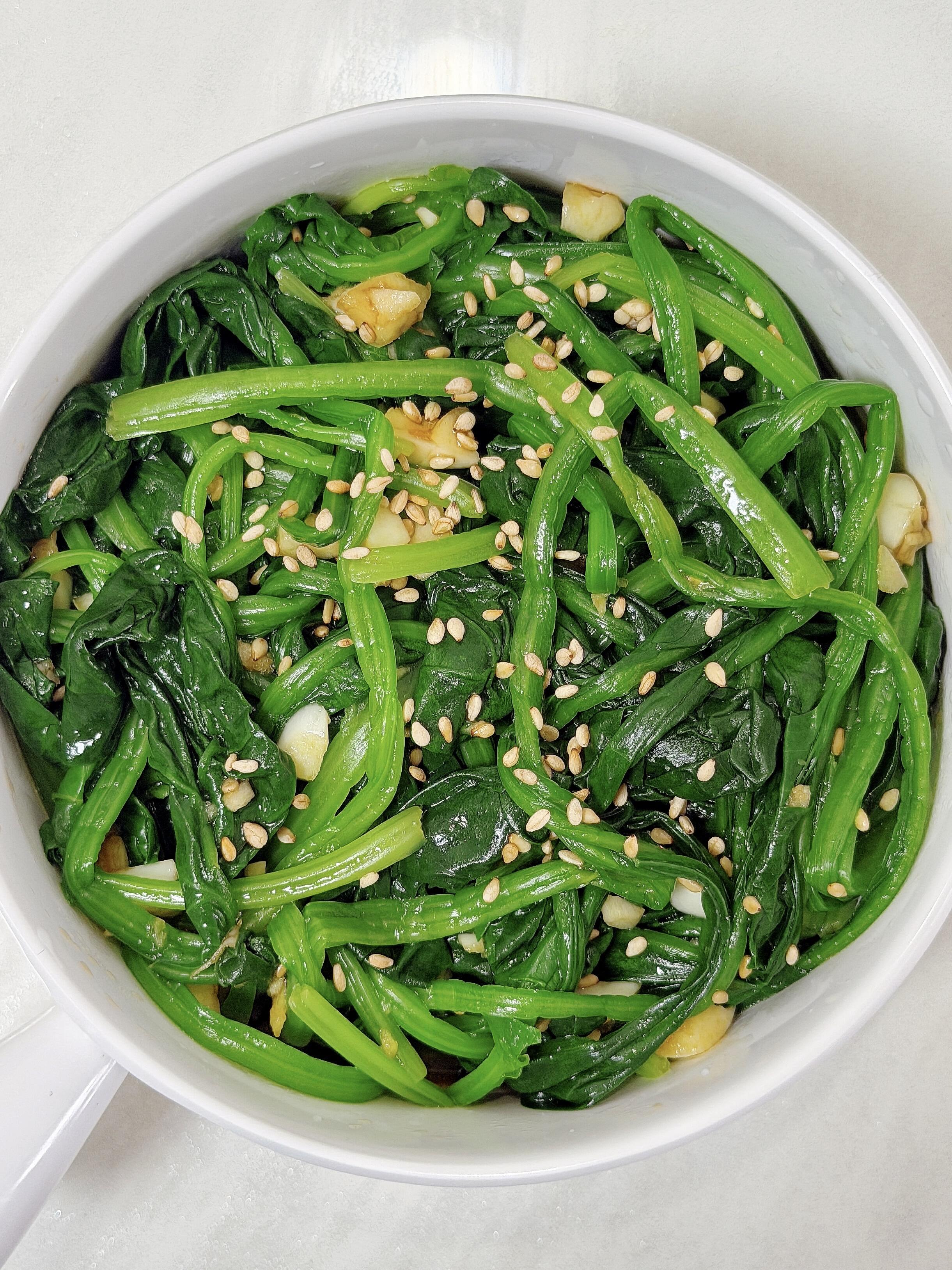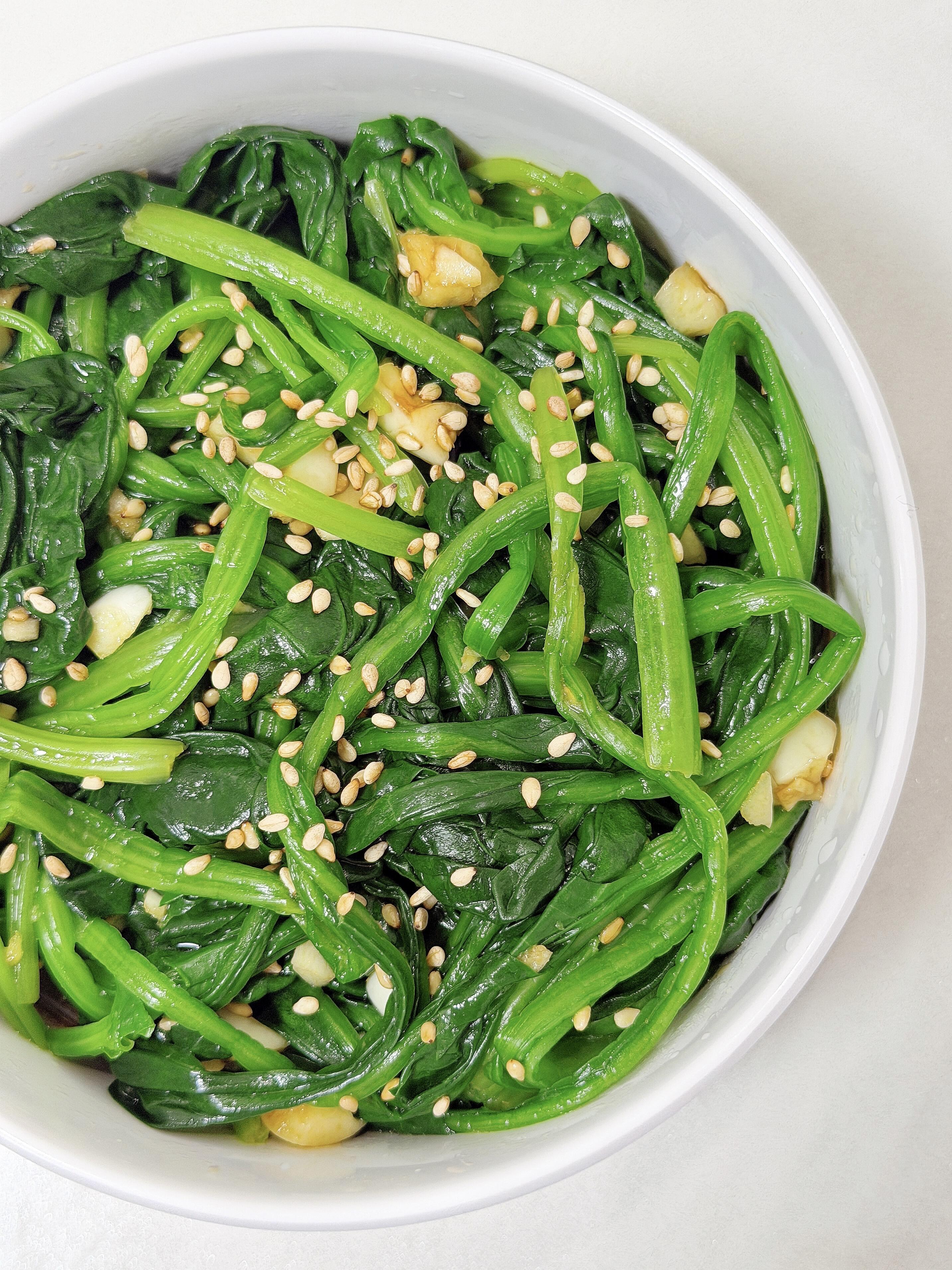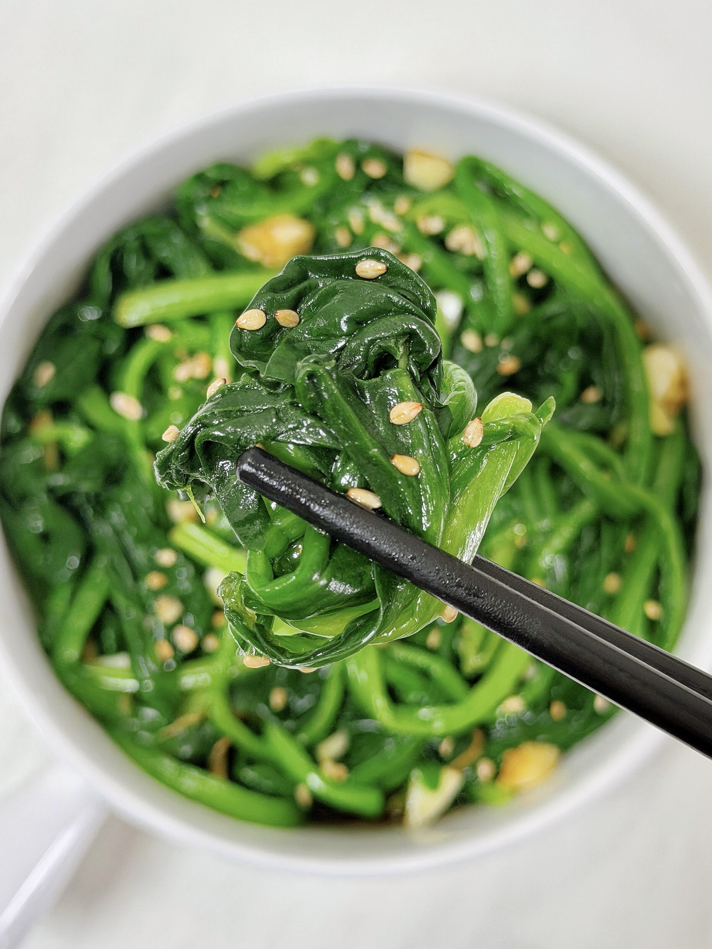 🥬准备食材:菠菜1小把、蒜末适量、白芝麻少许