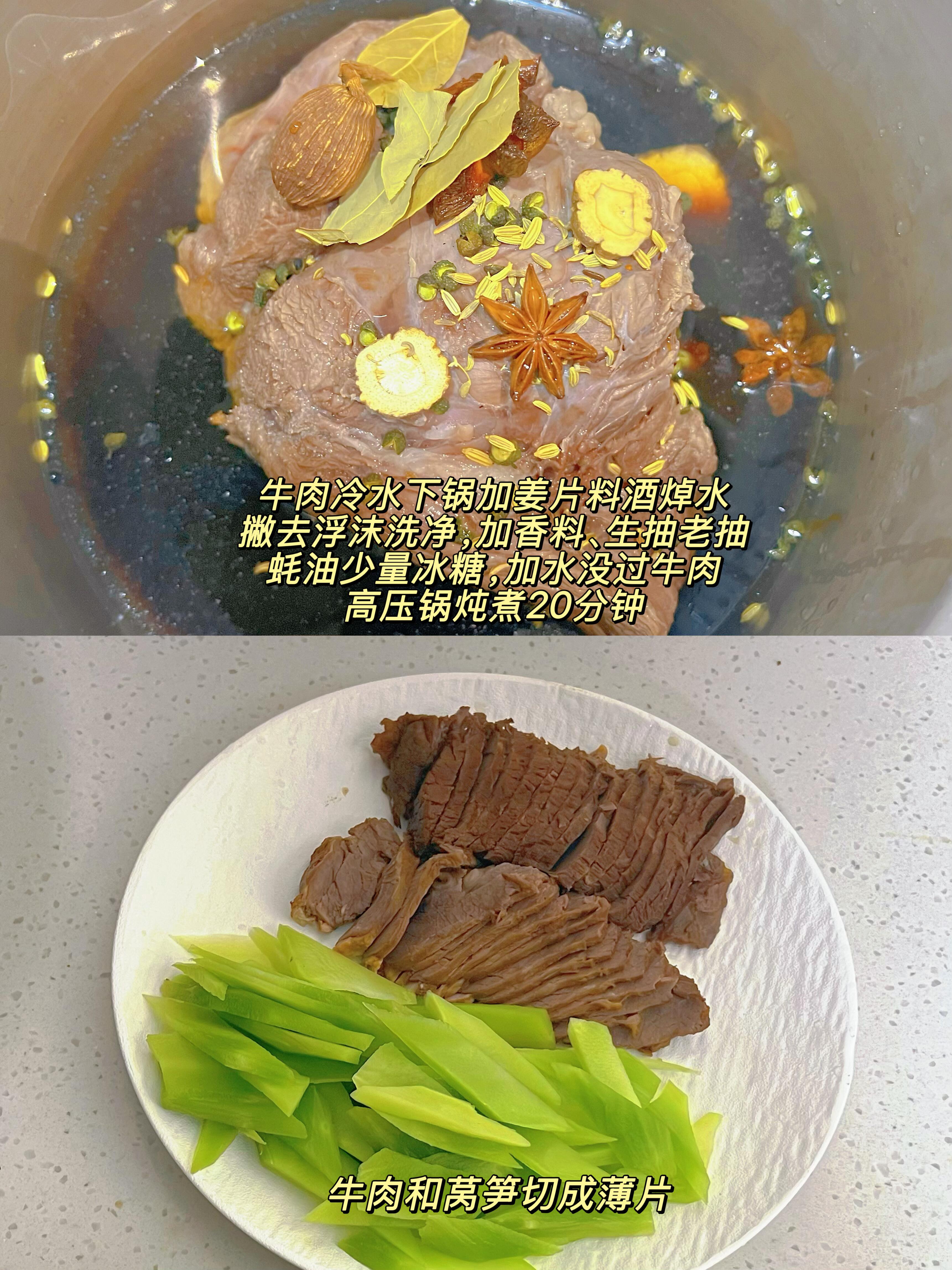 1️⃣牛肉冷水下锅,放入姜片、少许料酒,开火焯水,水沸后撇去表面的浮沫,把牛肉捞出用清水冲洗干净;接着把牛肉放进高压锅,加入八角、香叶、草果,再放2勺生抽、1勺老抽、1勺蚝油,加少许盐和冰糖,倒入清水没过牛肉,盖上盖子,高压锅炖煮20分钟,卤好后捞出切片备用。