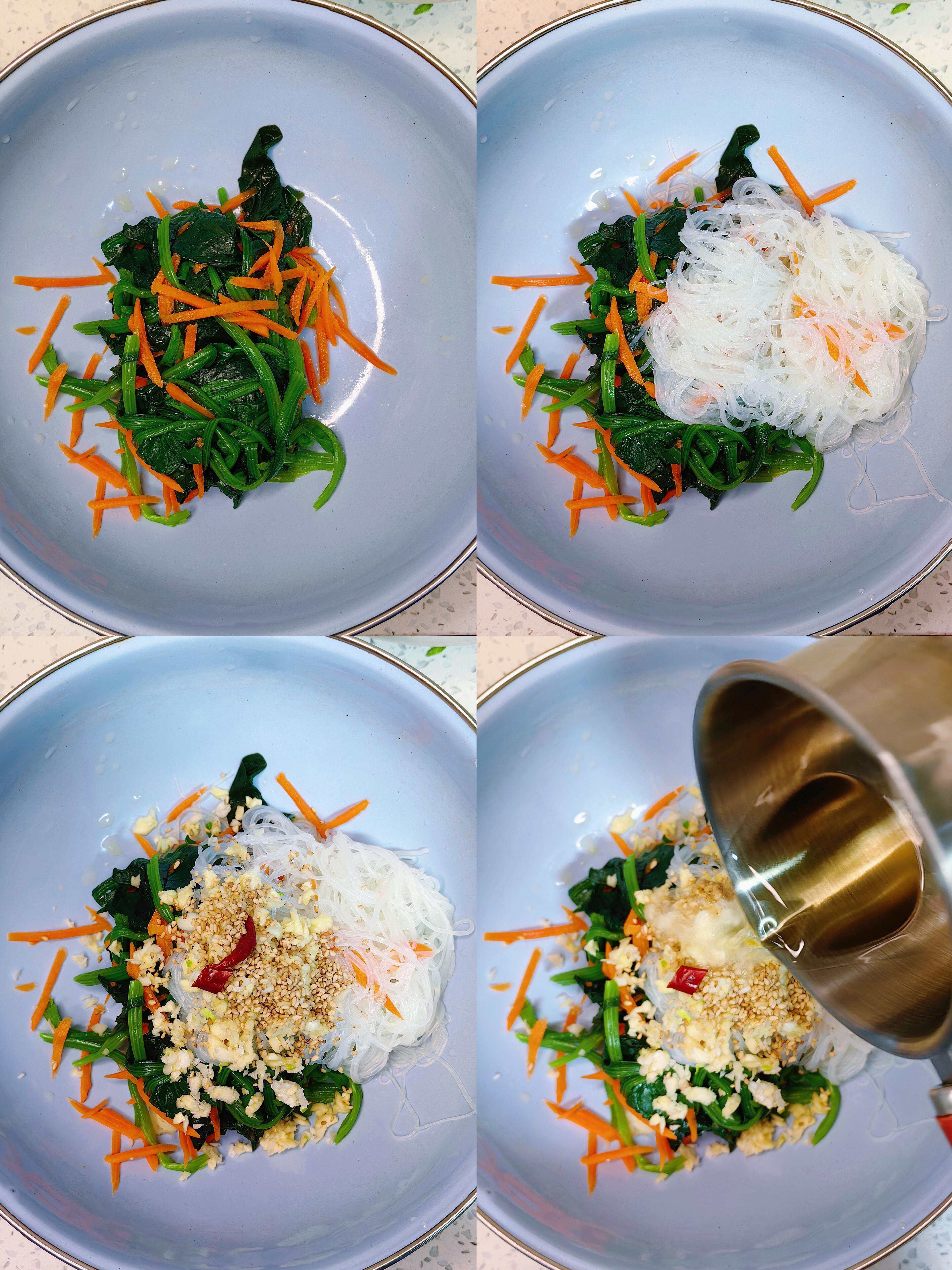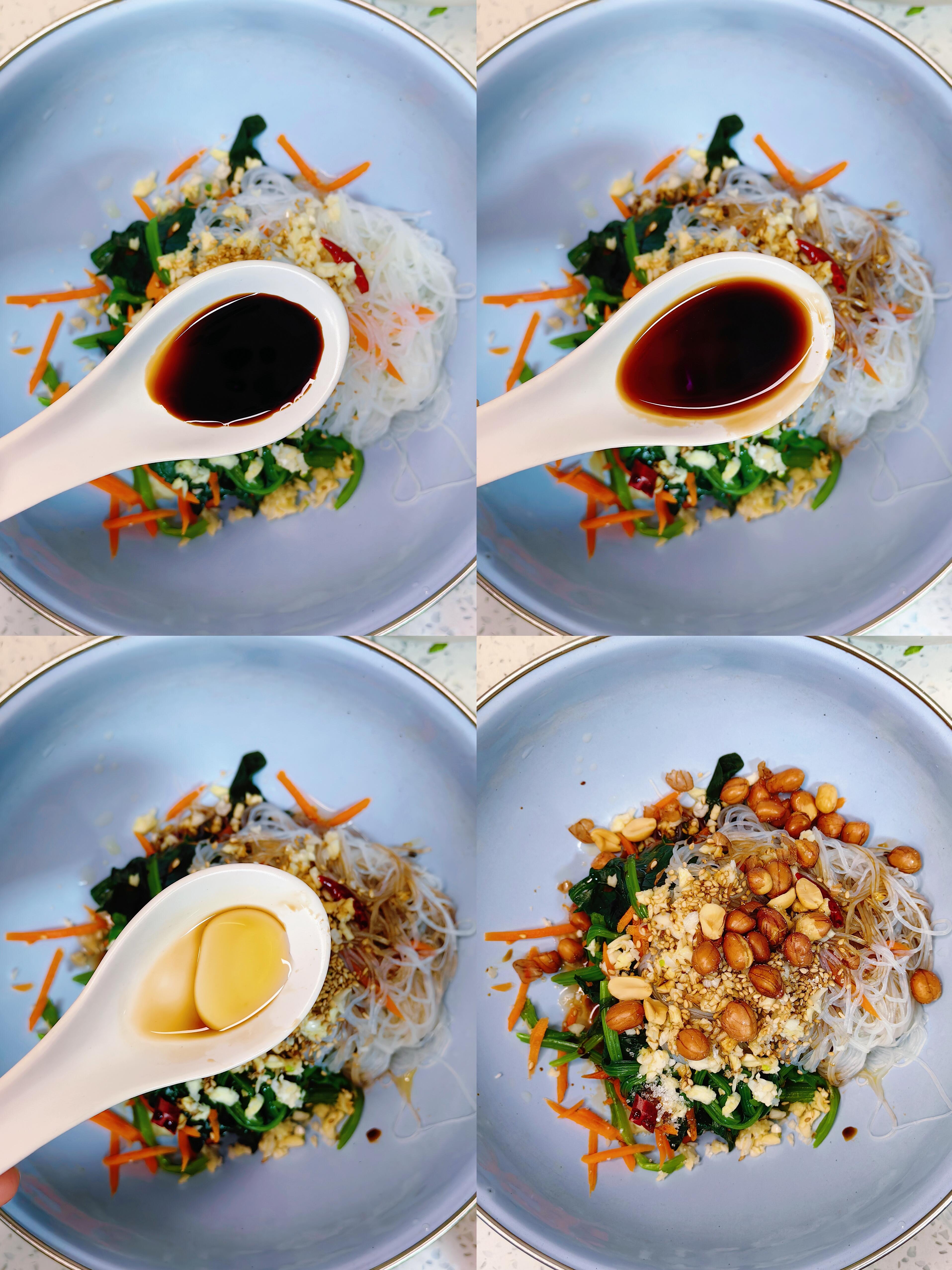 4️⃣ 最后撒上熟花生米和香菜段,再翻拌几下,让每一根菠菜和粉丝都裹满酱汁,直接开吃就好啦!