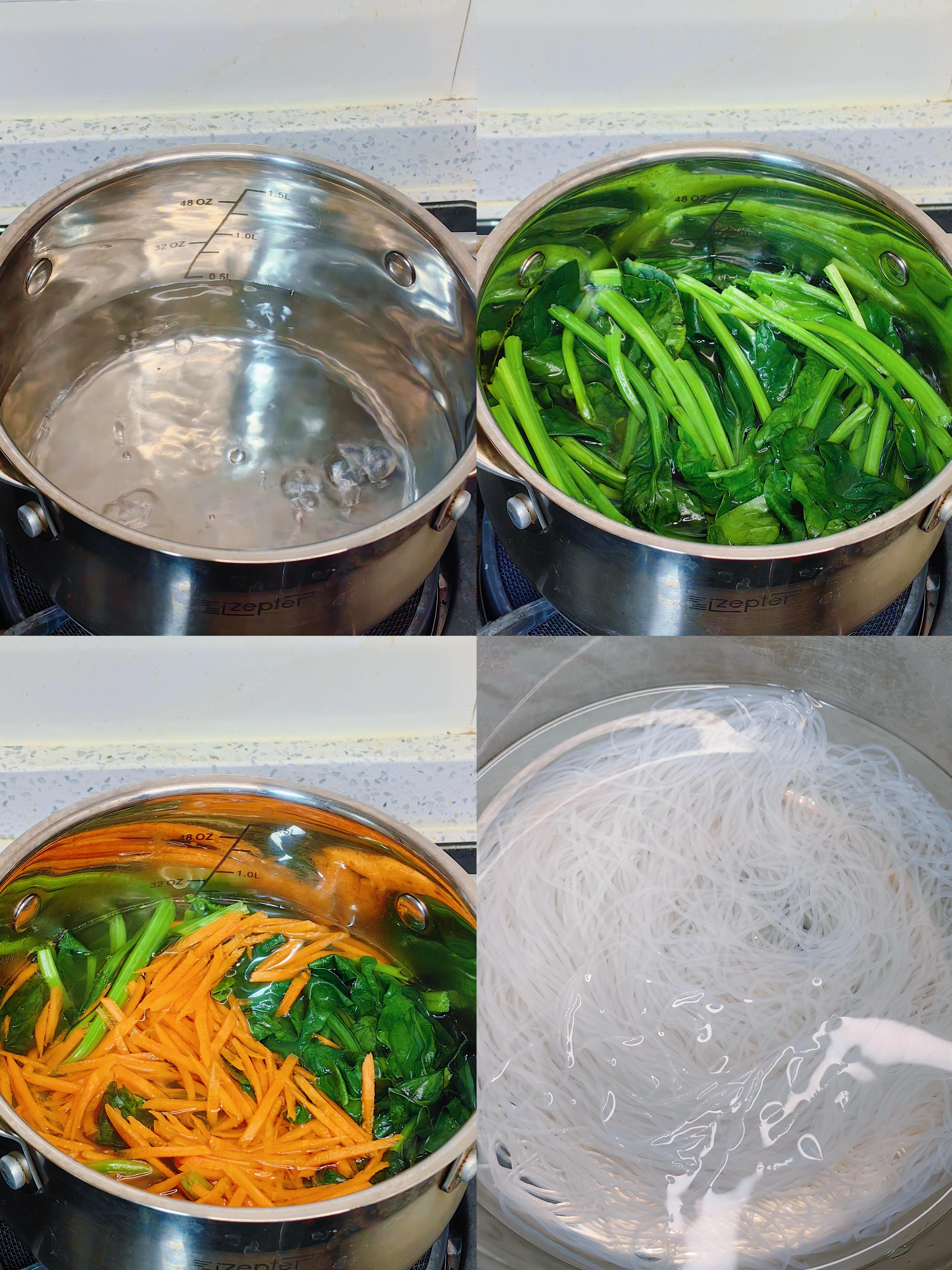 2️⃣ 粉丝用沸水浸泡5分钟,泡至完全变软后捞出,过一遍凉水,沥干水分(避免粘连);另起锅烧开水,放入菠菜和白萝卜丝,焯水1分钟,看到菠菜变软、颜色变翠绿,立刻捞出过凉水,挤干多余水分,放进大碗里。