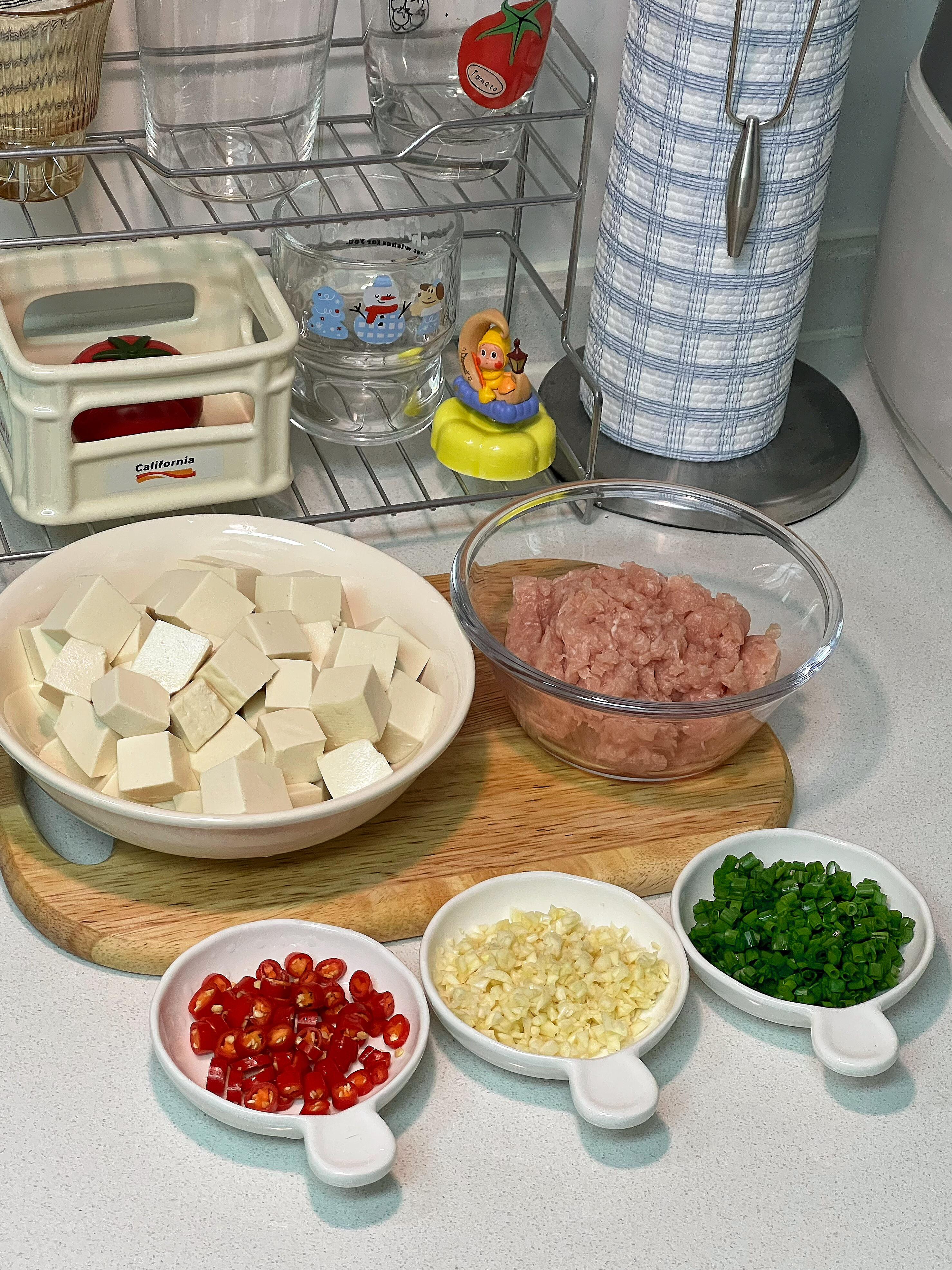 嫩豆腐1块、肉沫适量、小米辣2-3个、葱花1小把、蒜末3瓣