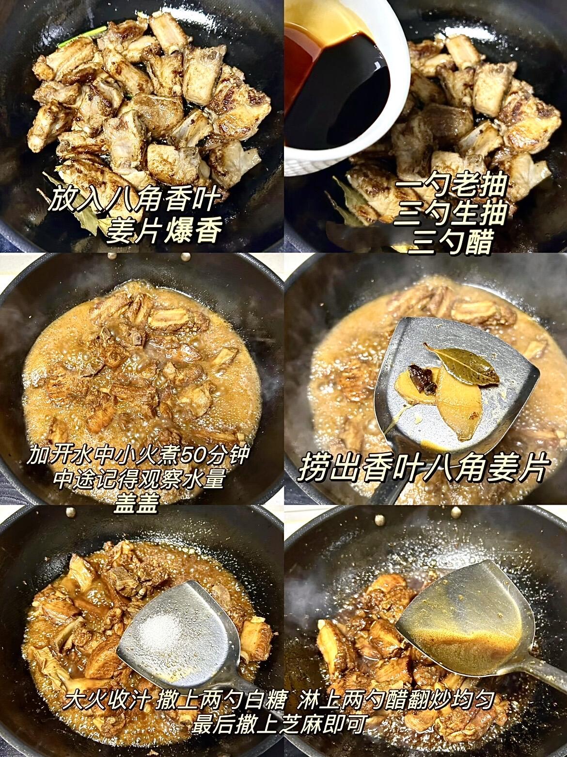 3️⃣ 放入八角、香叶和姜片,翻炒出浓郁的香料味,沿锅边淋入1勺老抽、3勺生抽、3勺醋,快速翻炒均匀,让每块排骨都充分吸收料汁的香味。