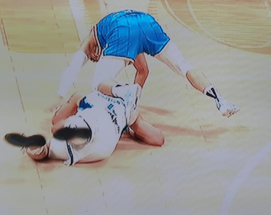 陈盈骏见状,立即冲上去扑到威瑟斯庞身上抢球。只見他边抢球边用左膝压住威瑟斯旁的脖子;