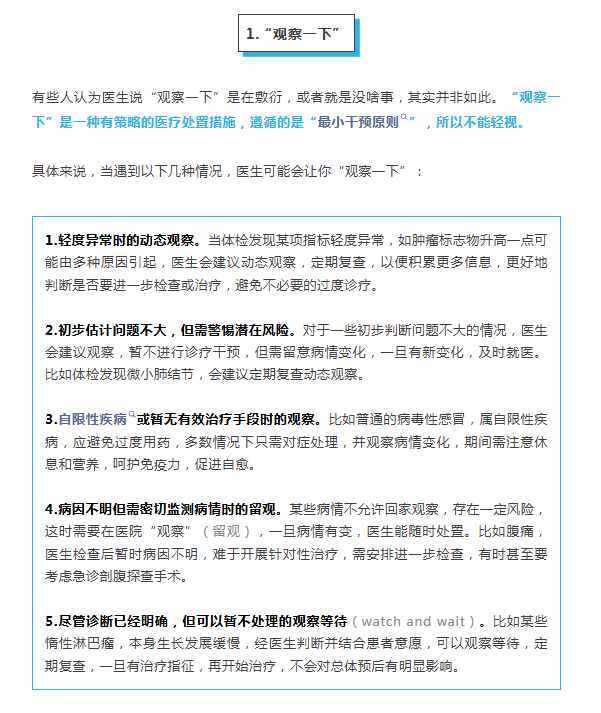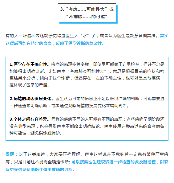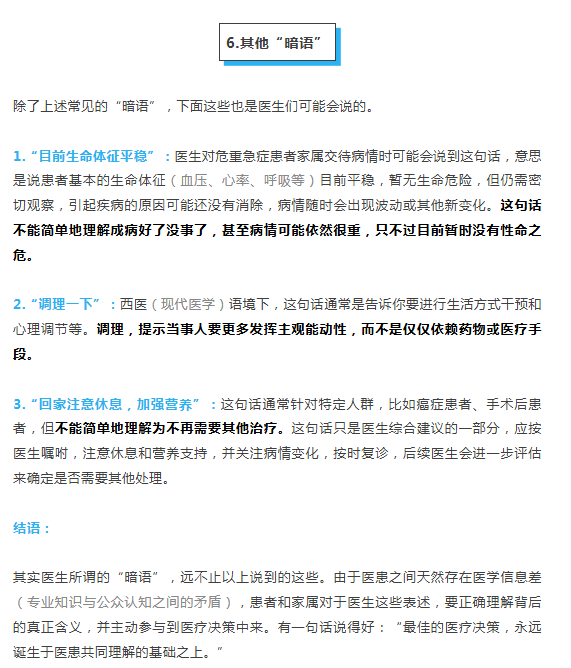 【#医生的这些暗语一定要听懂#】#医生的这些暗语是什么意思# 相信很多人都有过这种经历:感觉身体有异常,或者体检发现指标异常,担心有问题上医院咨询,医生看过之后来了一句:“观察一下”。除了“观察一下”,医生口中还经常会说“ 多喝点水”“不排除……可能”“这个药先吃着看看”等。这些看似简单的表述背后,其实包含复杂的医学决策逻辑。如若不能正确理解或不重视,很可能会导致治疗延误、诊疗不足或过度诊疗。本文我们整理了几个医生的高频“暗语”,帮助大家跨越医学语言的鸿沟。网页链接