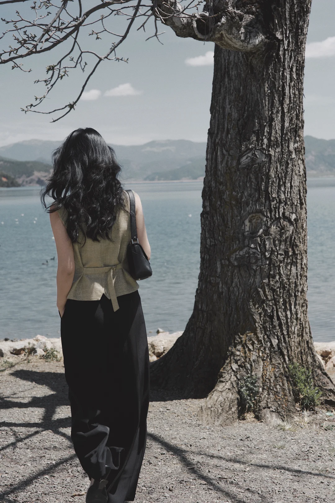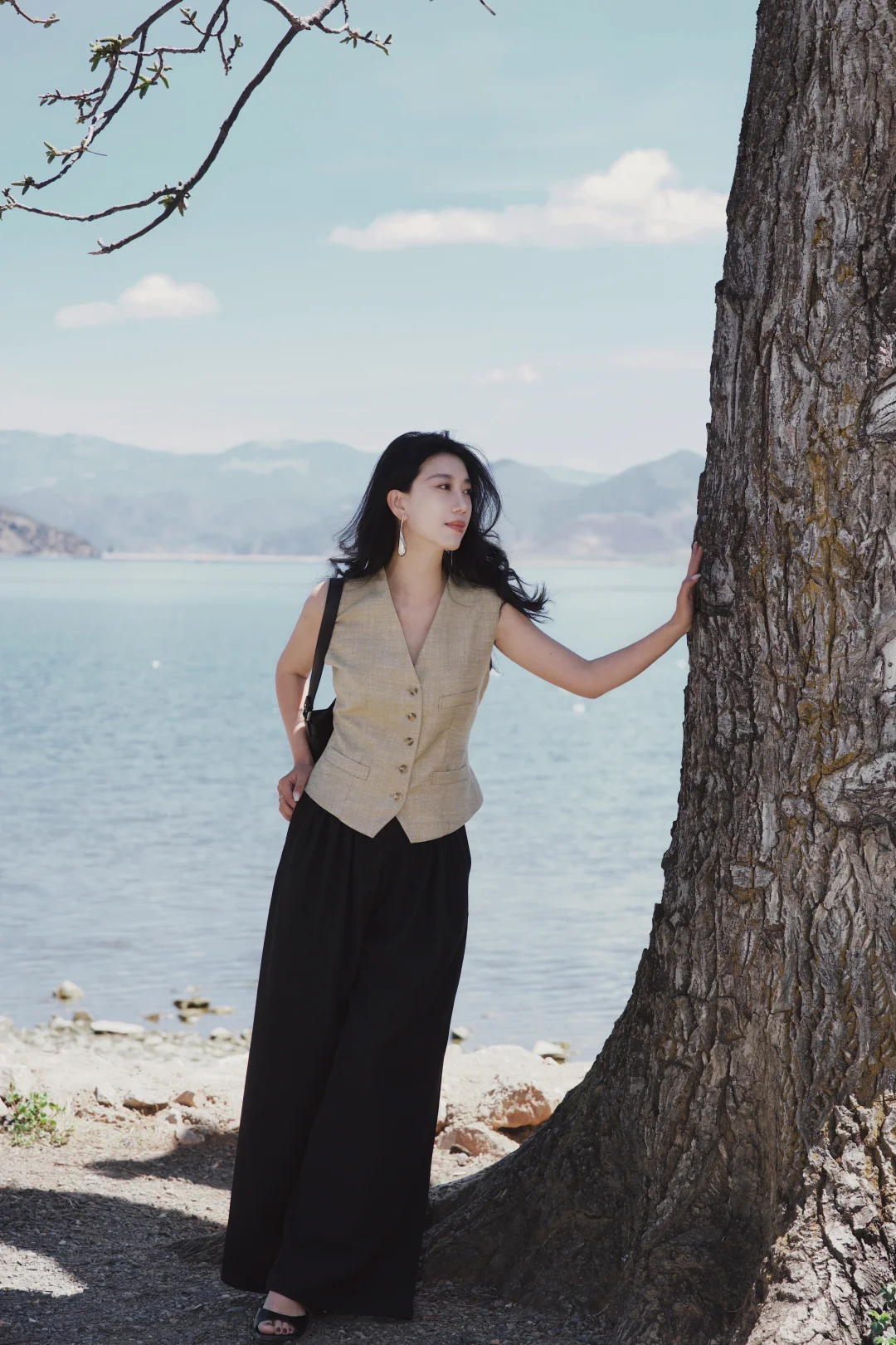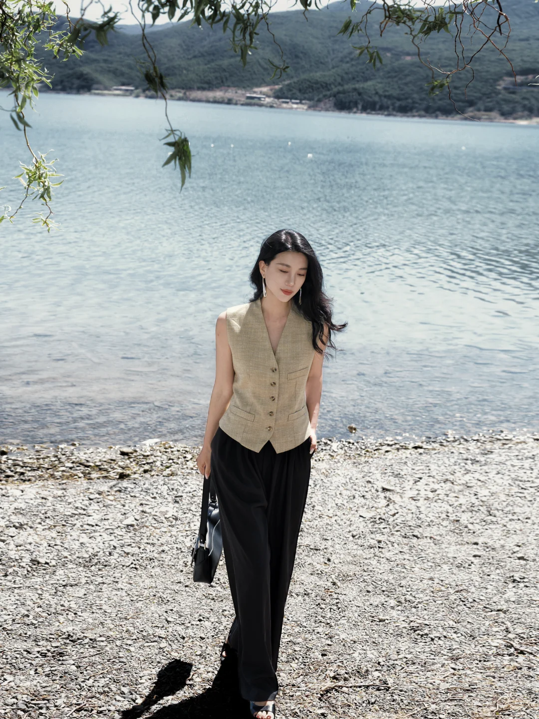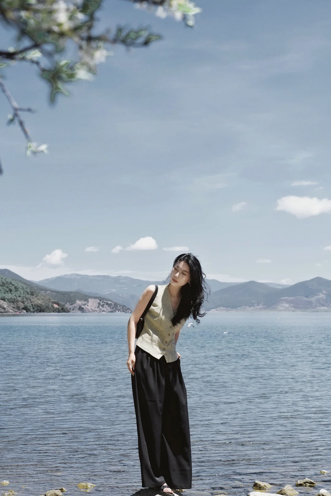 穿一件亚麻马甲,踩过砾石滩的光影,任长发被湖风掀起。老树枝桠斜斜探向湖面,新绿与繁花在肩头轻晃,连呼吸都浸着清冽的水汽。