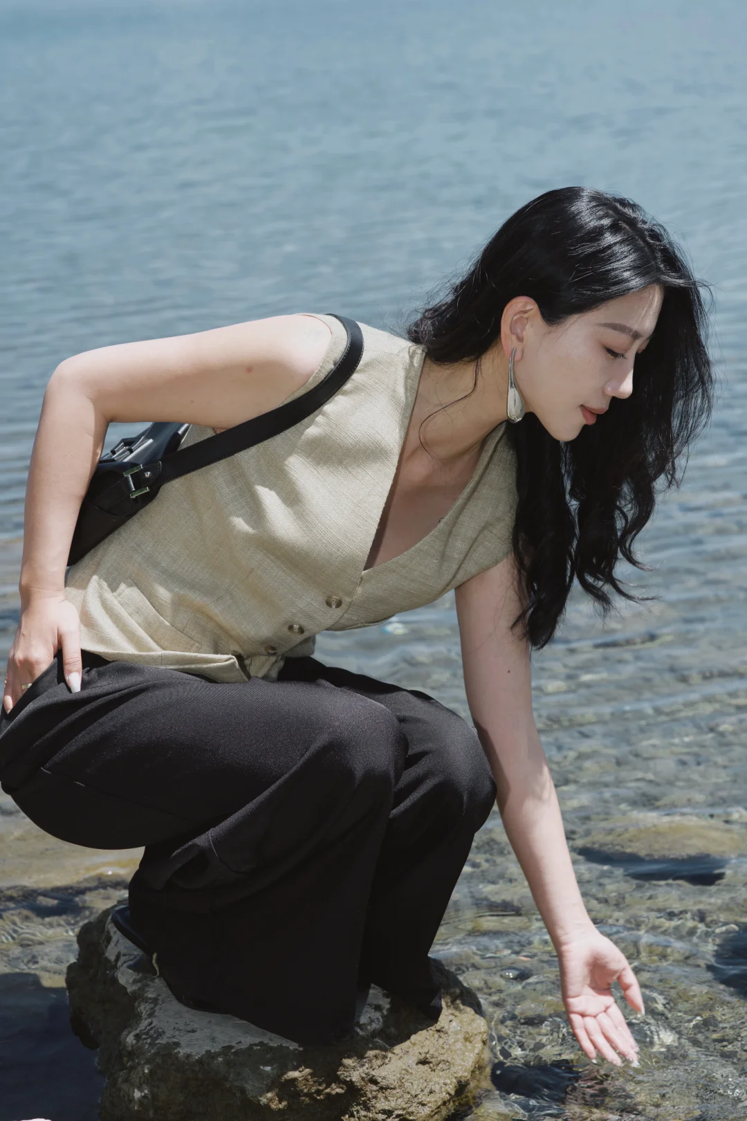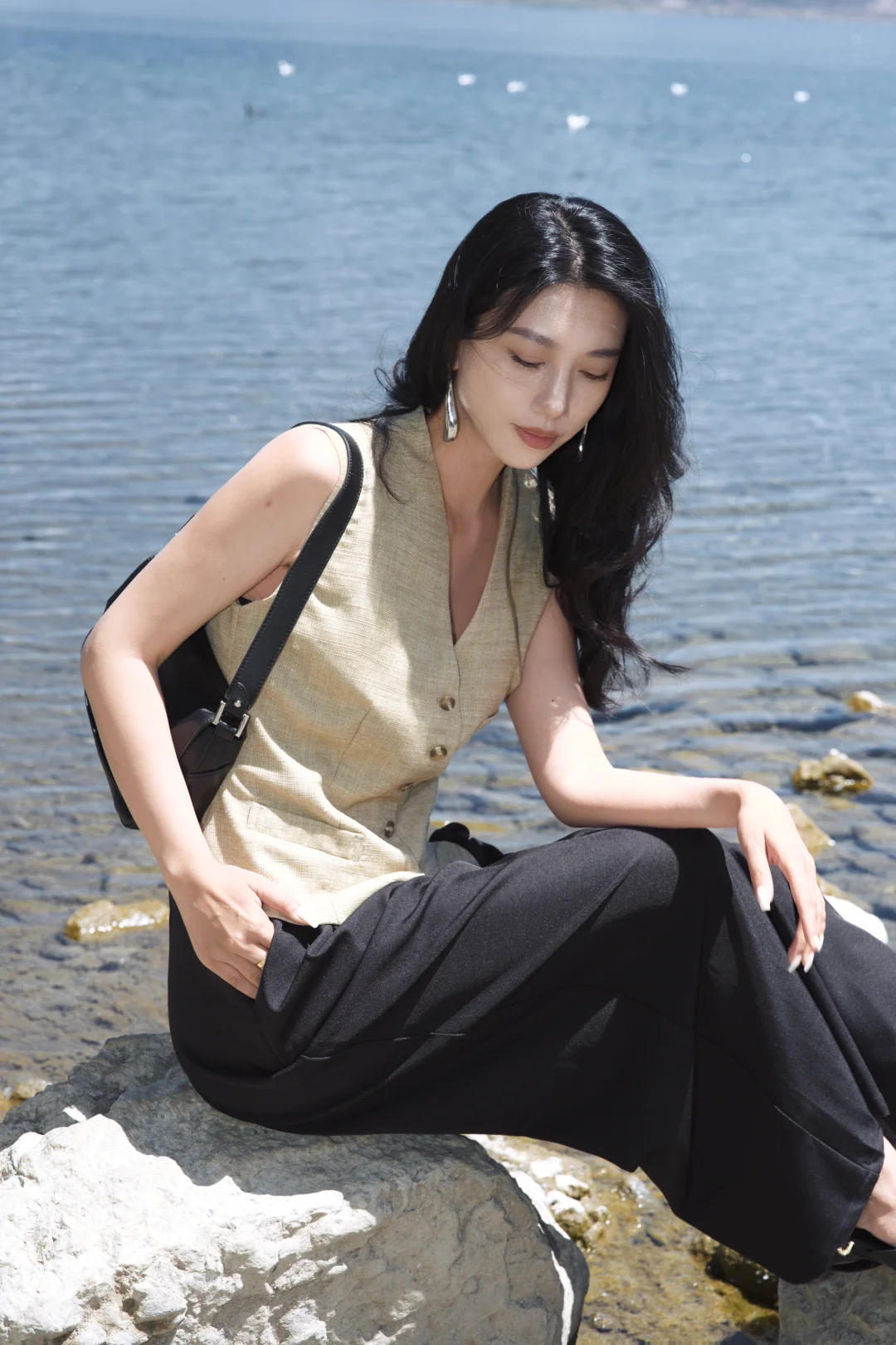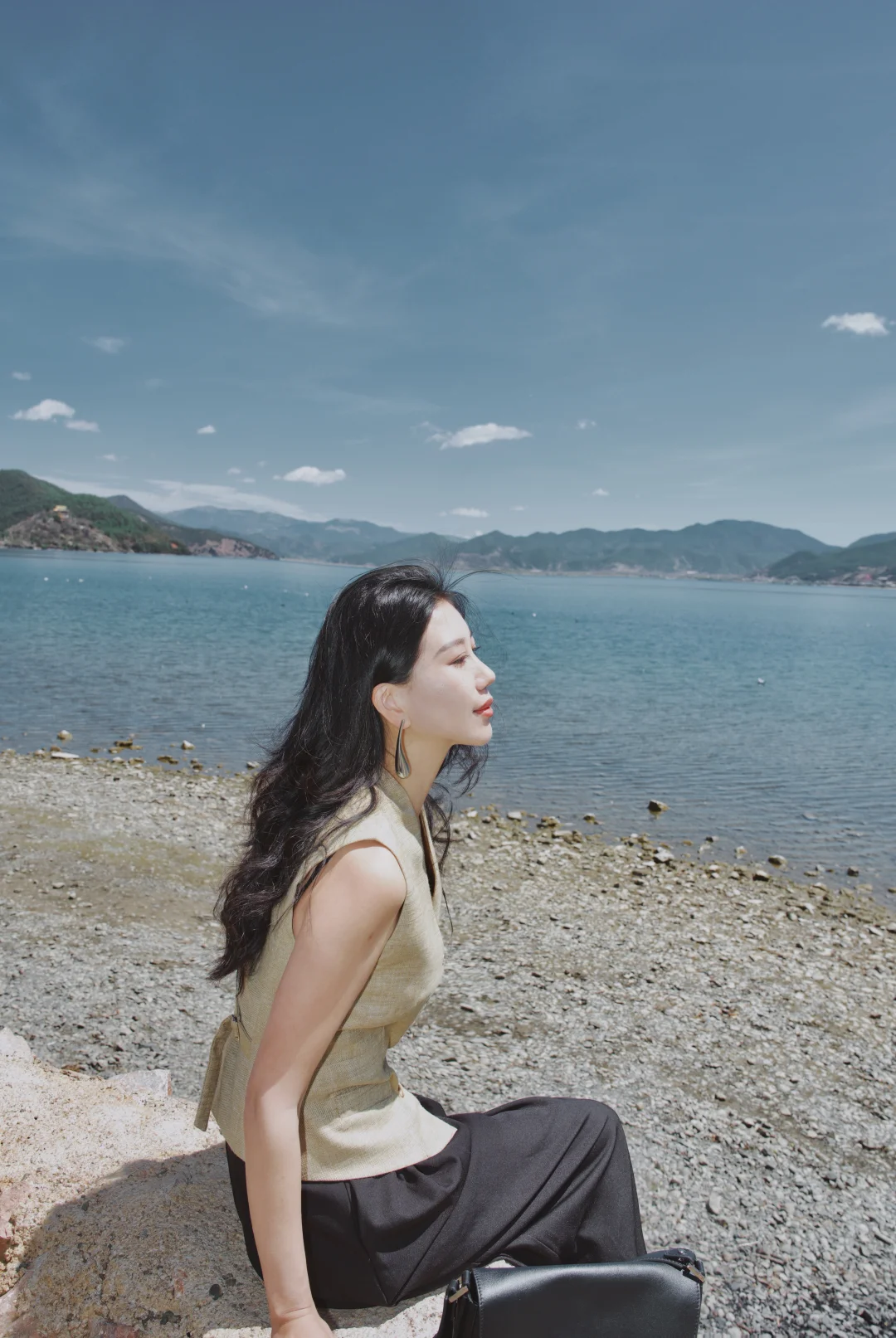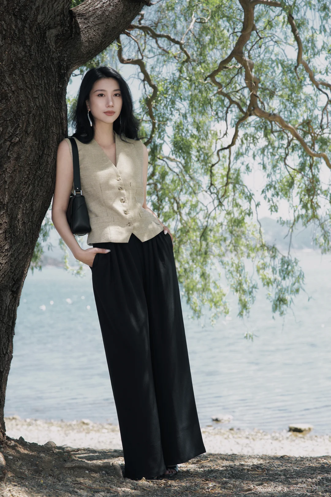 穿一件亚麻马甲,踩过砾石滩的光影,任长发被湖风掀起。老树枝桠斜斜探向湖面,新绿与繁花在肩头轻晃,连呼吸都浸着清冽的水汽。